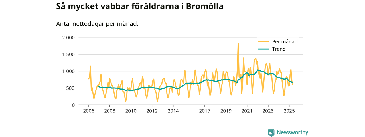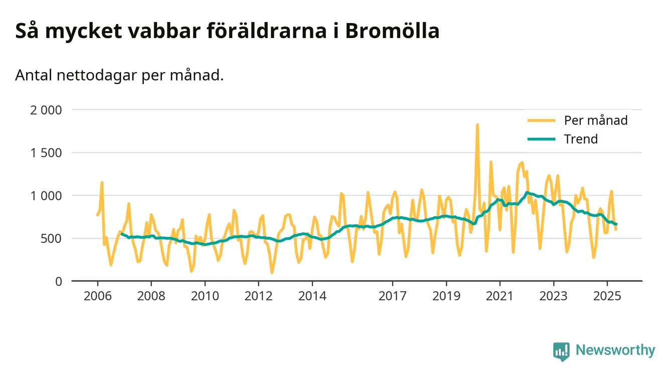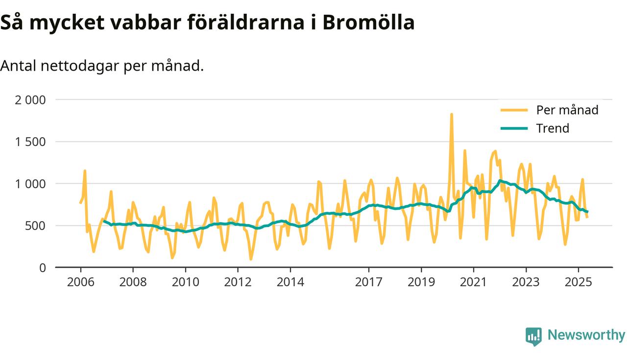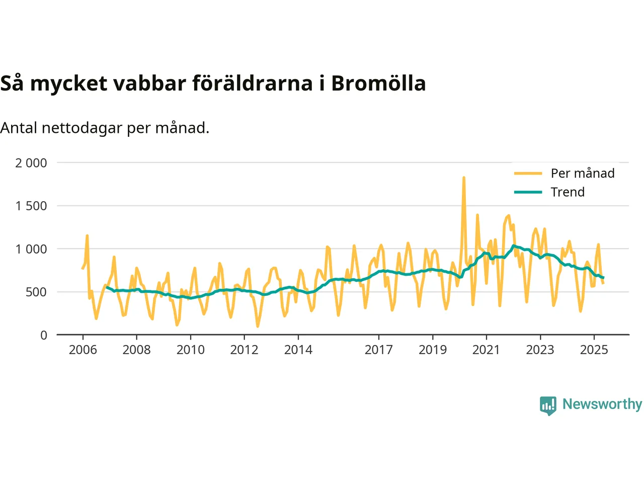 När coronapandemin drog in i mars 2020 peakade antalet vabbdagar både i Bromölla kommun och i riket som helhet. Under de senaste två åren har vabbuttaget börjat minska igen.