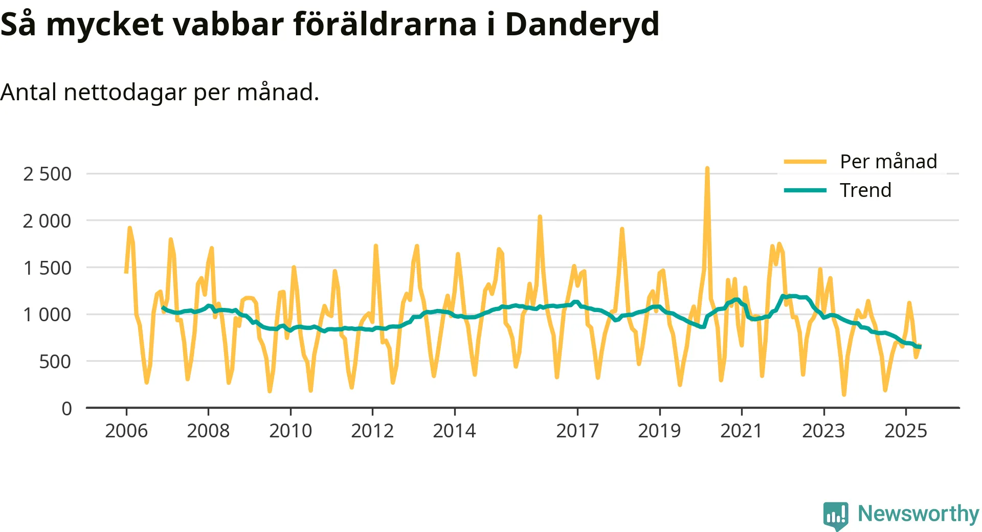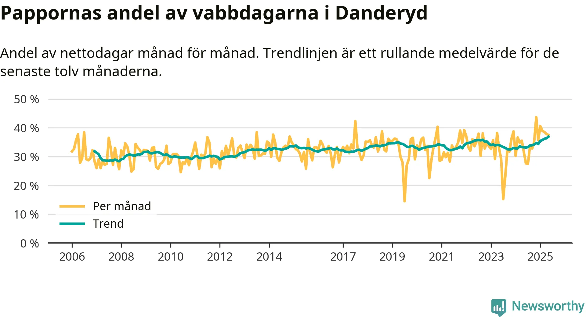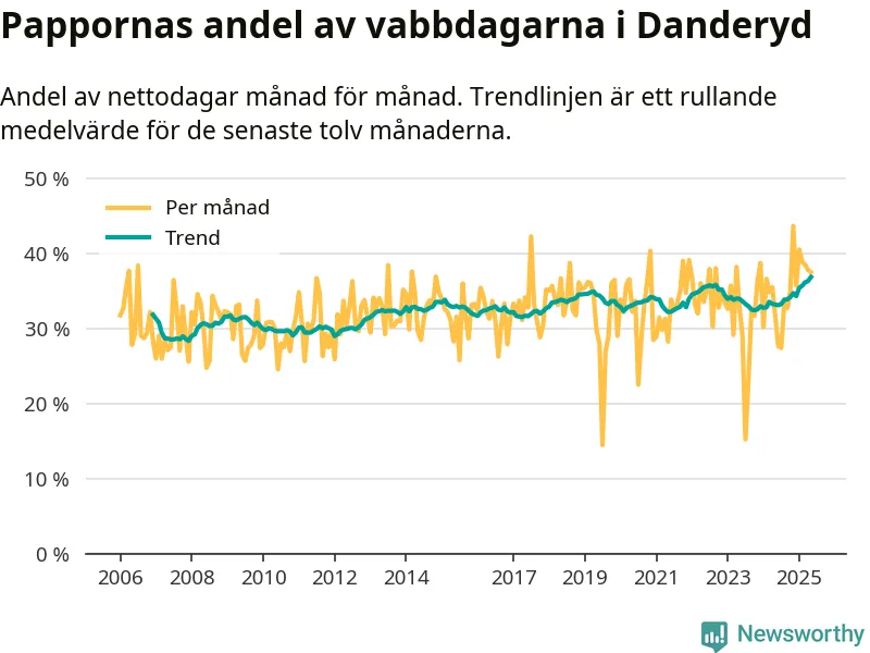 Danderyd ligger en bit från ett jämställt uttag. Under de senaste tolv månaderna har männen stått för 37 procent av all vabb i kommunen. Det är ändåen historiskt hög andel, sett till de senaste två decennierna.