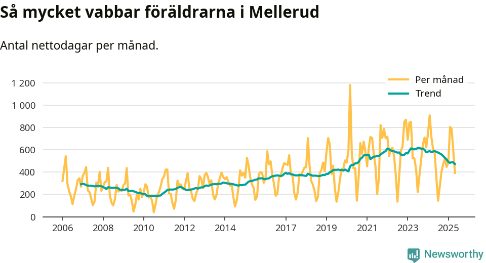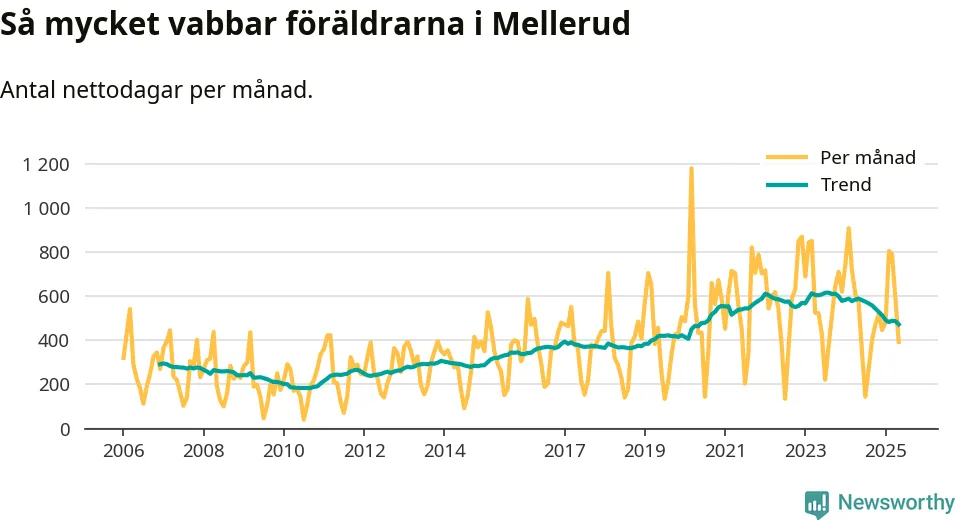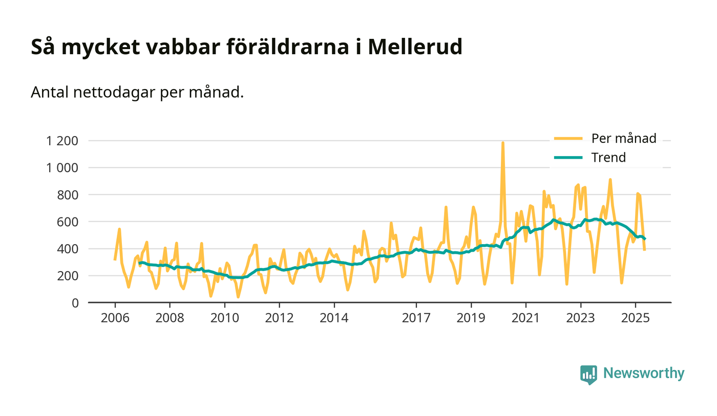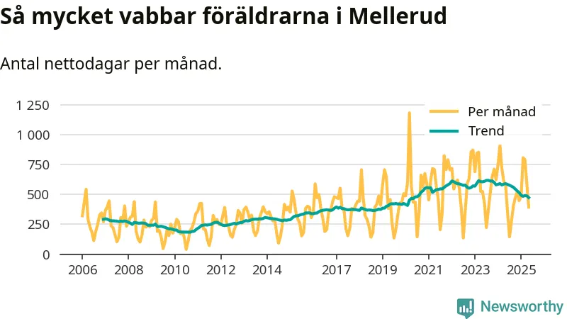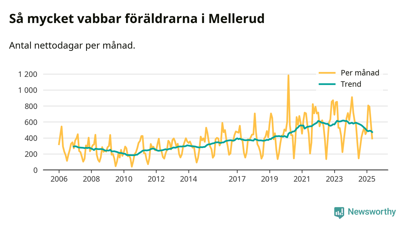 När coronapandemin drog in i mars 2020 peakade antalet vabbdagar både i Melleruds kommun och i riket som helhet. Under de senaste två åren har vabbuttaget börjat minska igen.