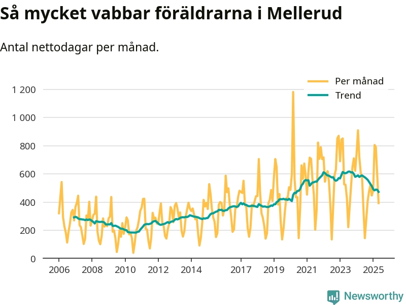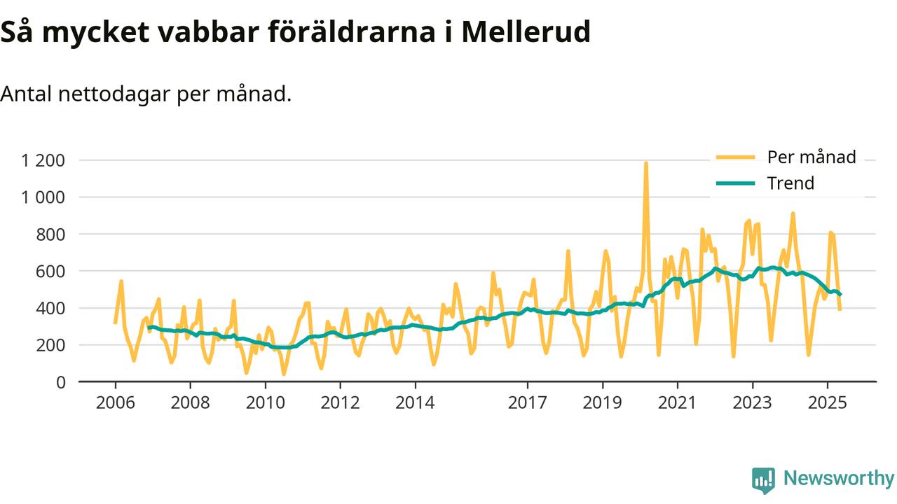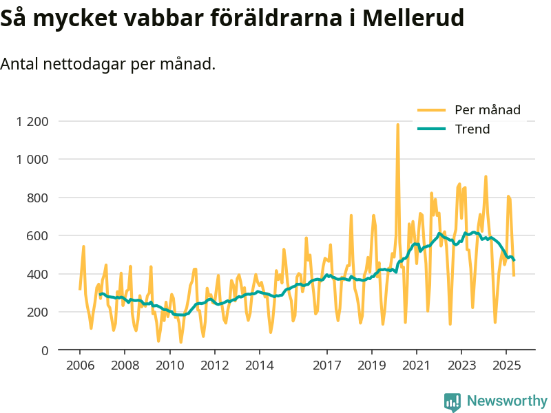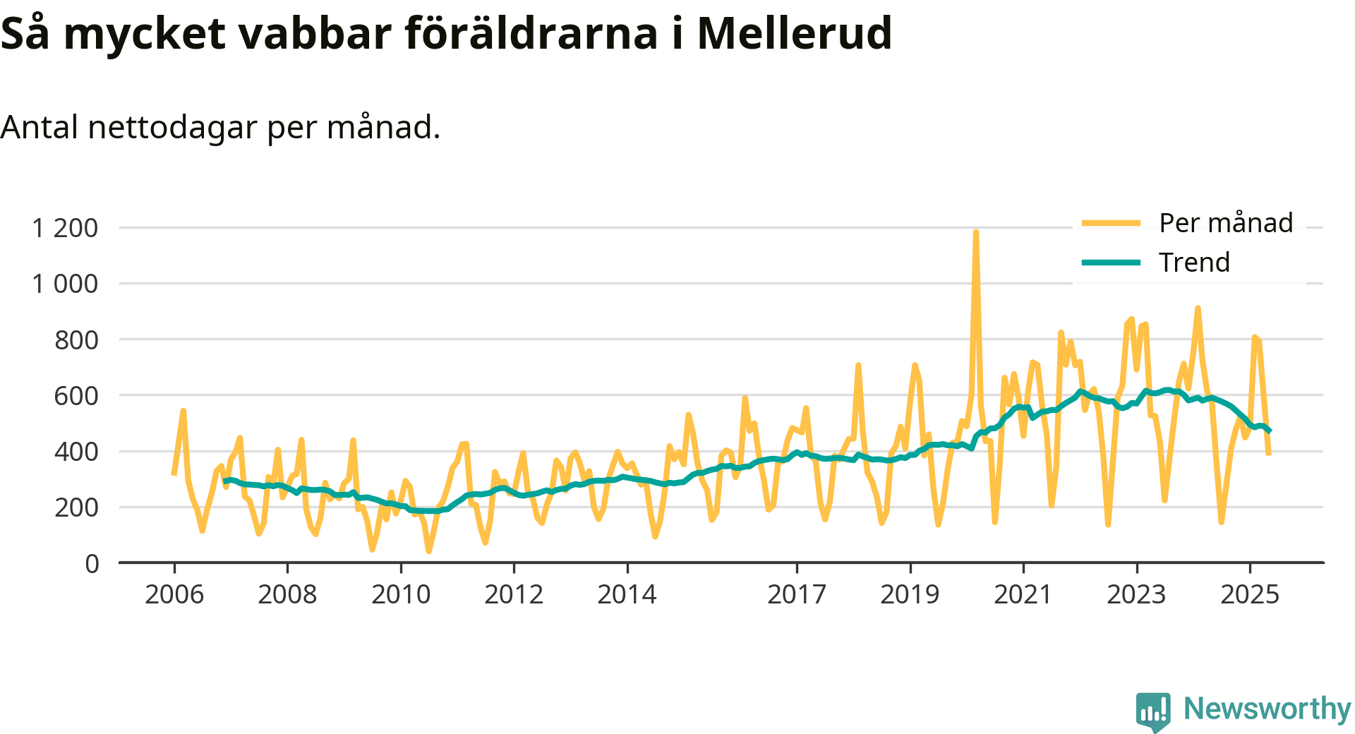 När coronapandemin drog in i mars 2020 peakade antalet vabbdagar både i Melleruds kommun och i riket som helhet. Under de senaste två åren har vabbuttaget börjat minska igen.