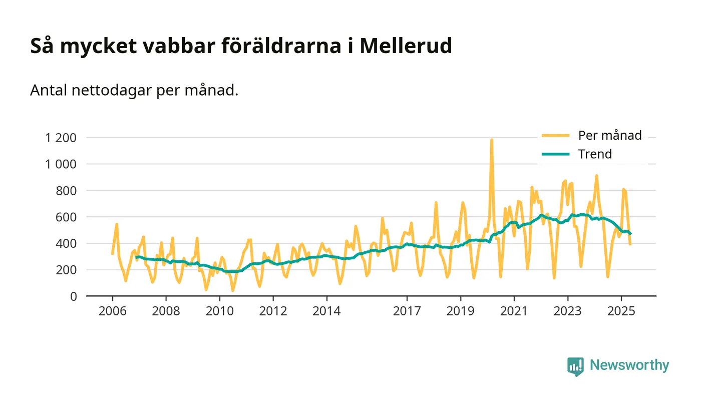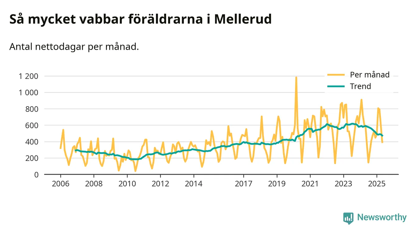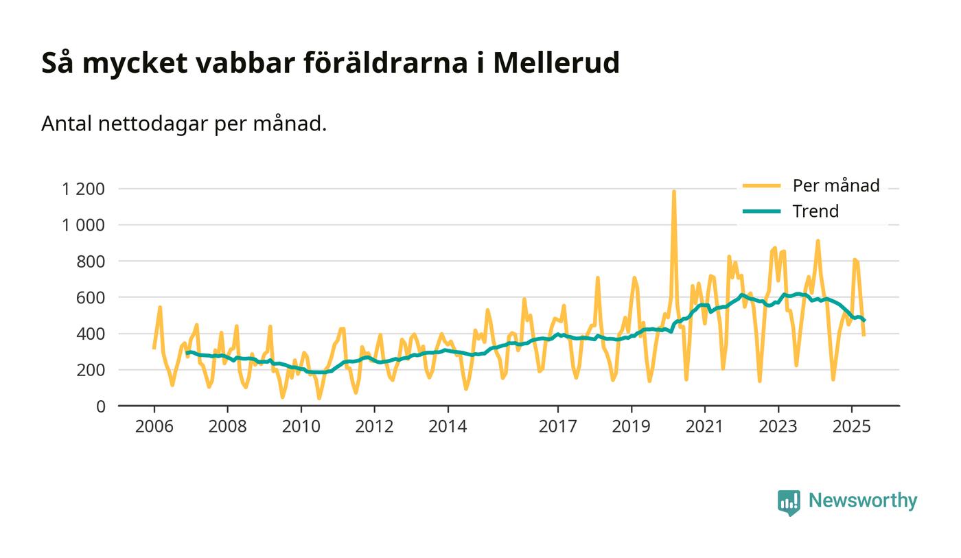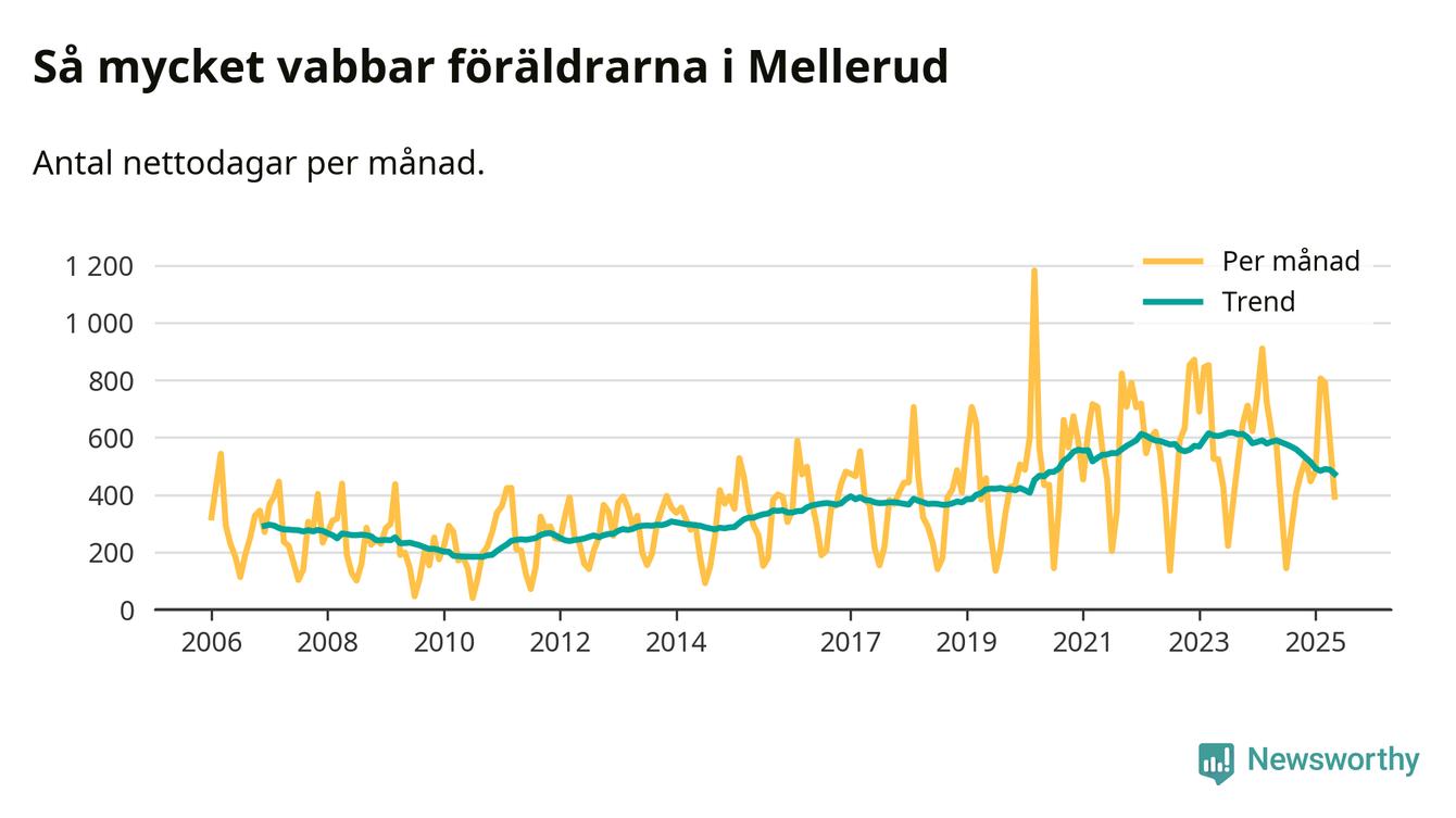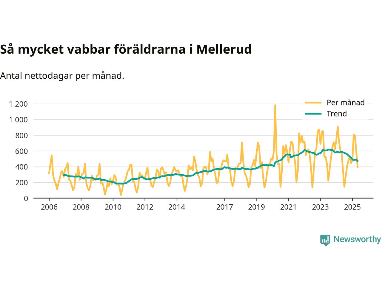 Mellerud ligger en bit från ett jämställt uttag. Under de senaste tolv månaderna har männen stått för 38 procent av all vabb i kommunen. Pappornas uttag peakade vintern 2016 då kommunens fäder var uppe i 41 procent av vabbdagarna 1.