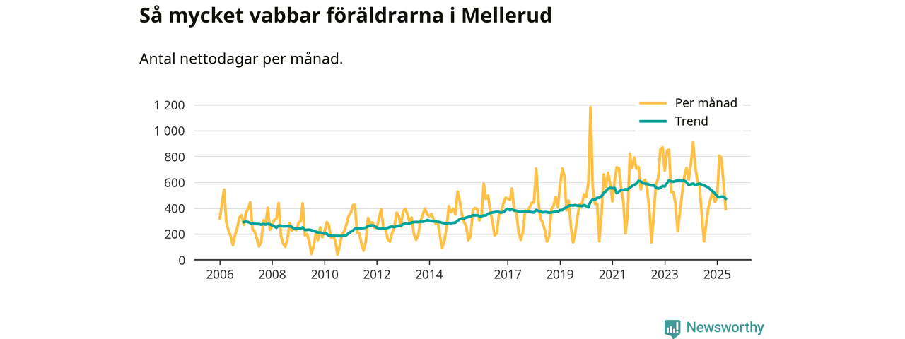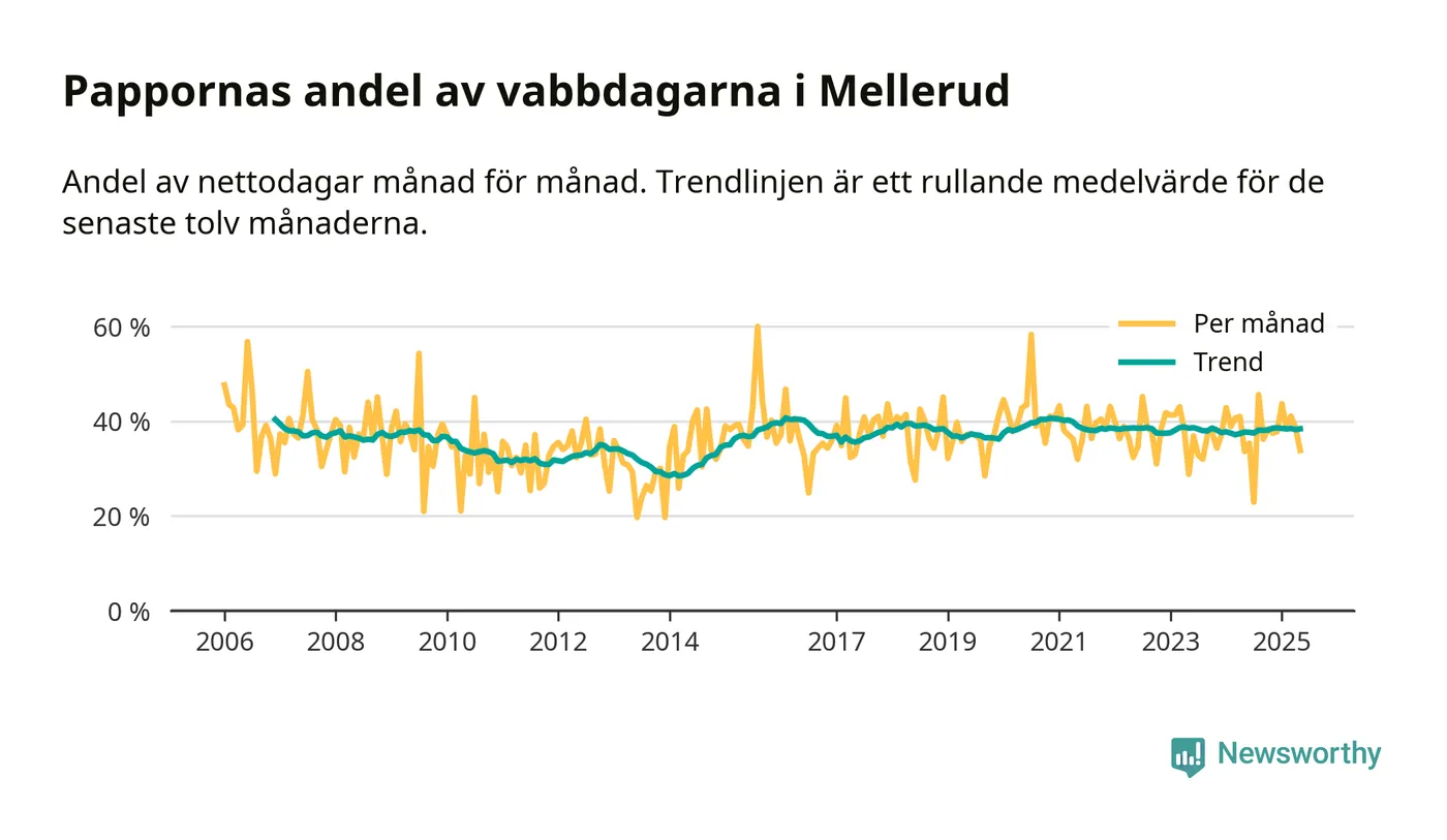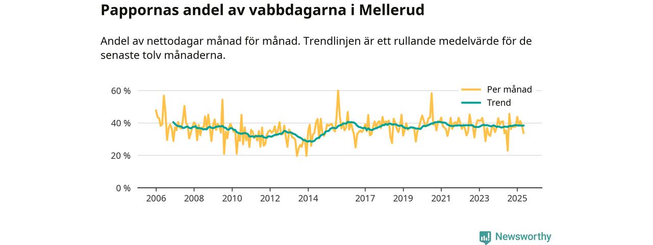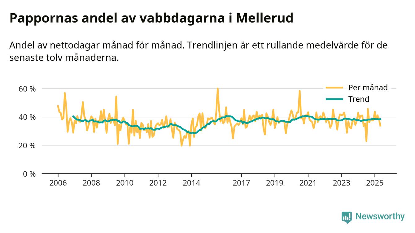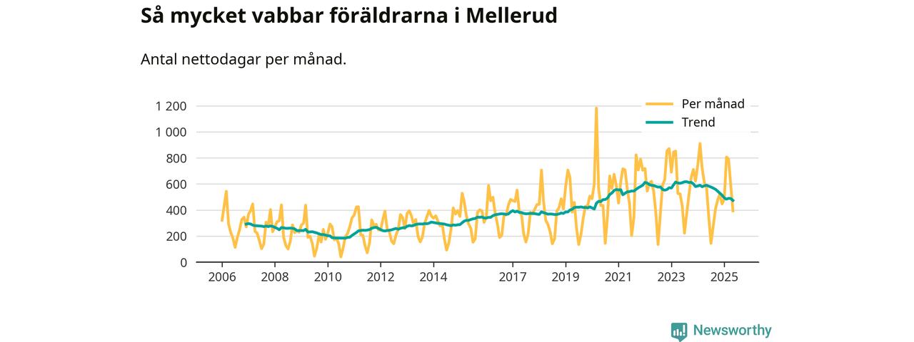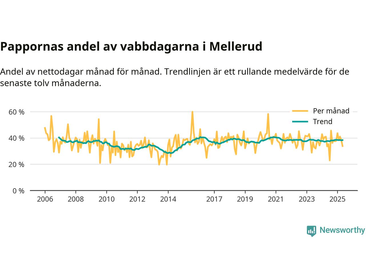 Mellerud ligger en bit från ett jämställt uttag. Under de senaste tolv månaderna har männen stått för 38 procent av all vabb i kommunen. Pappornas uttag peakade vintern 2016 då kommunens fäder var uppe i 41 procent av vabbdagarna 1.