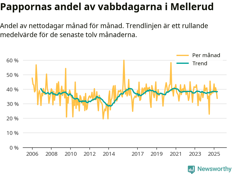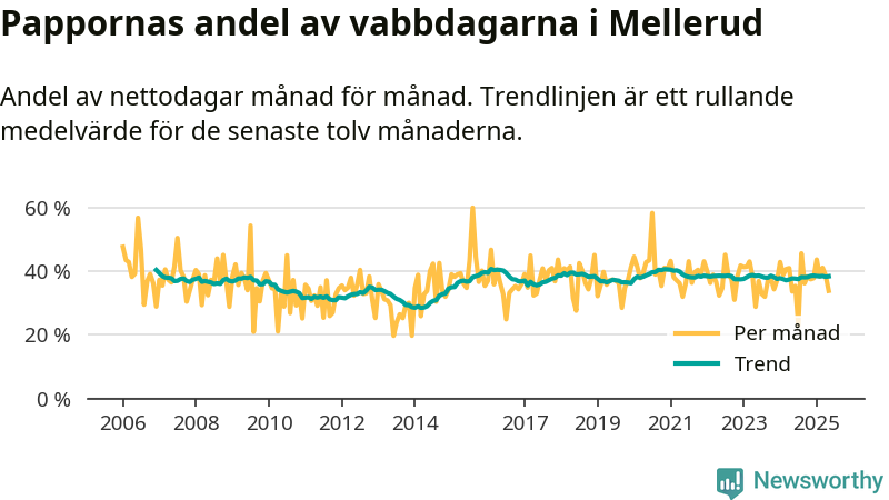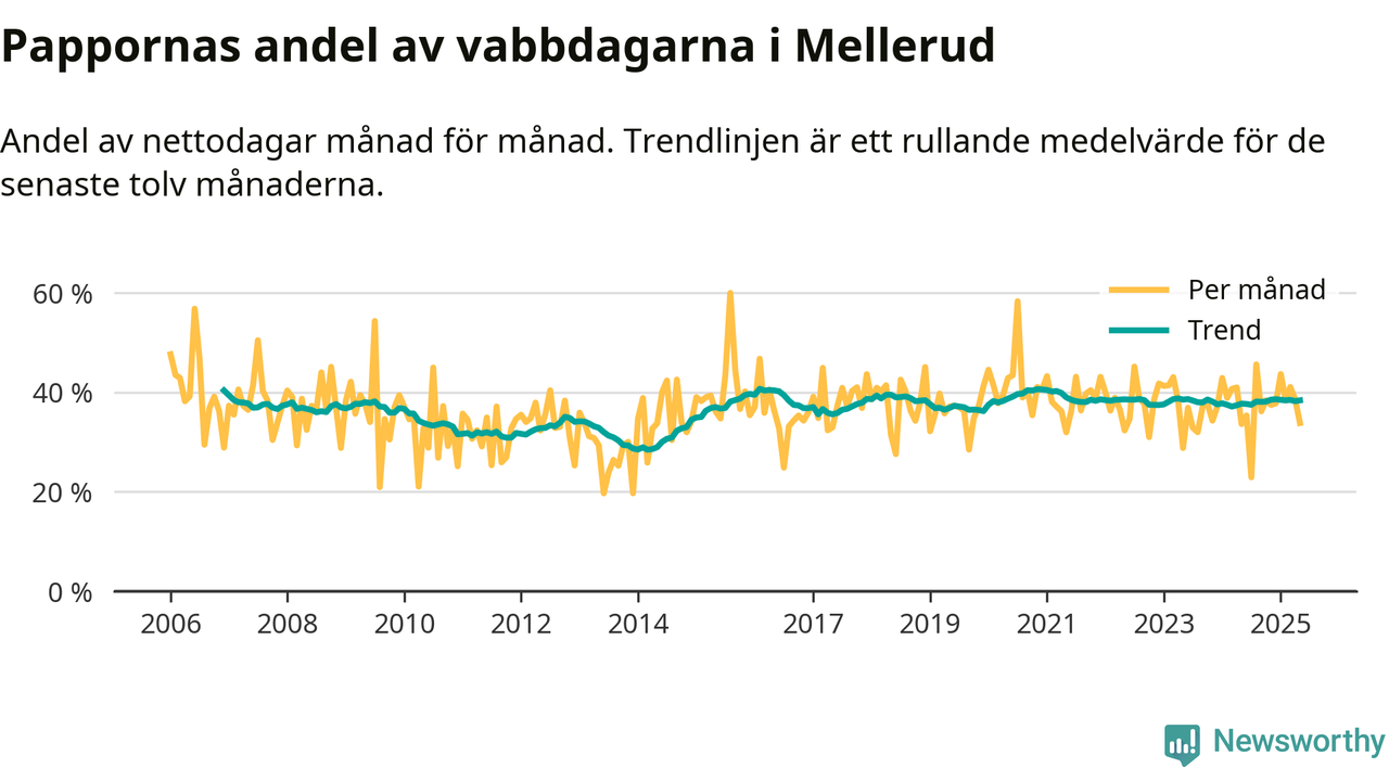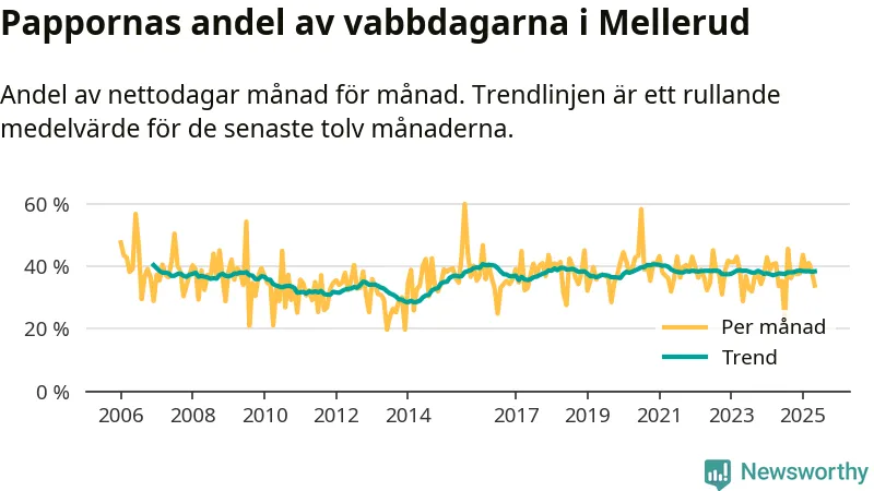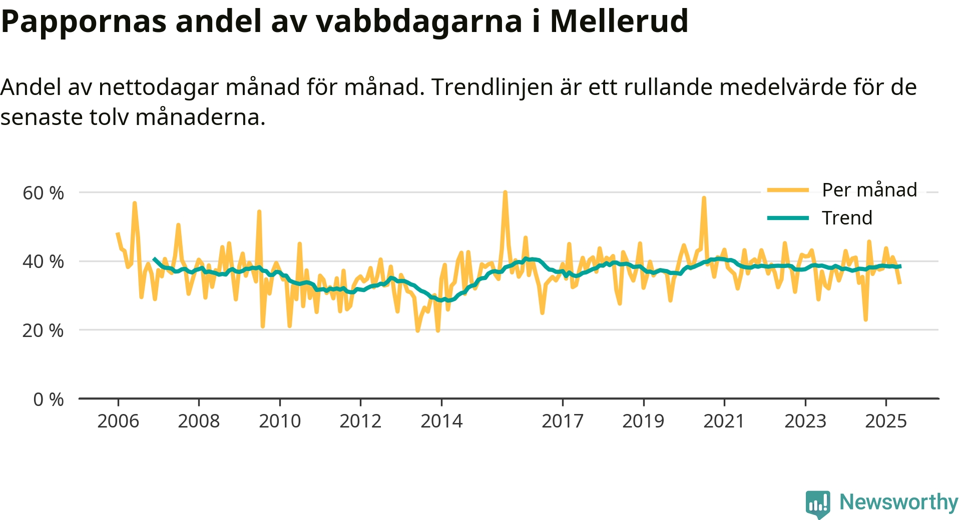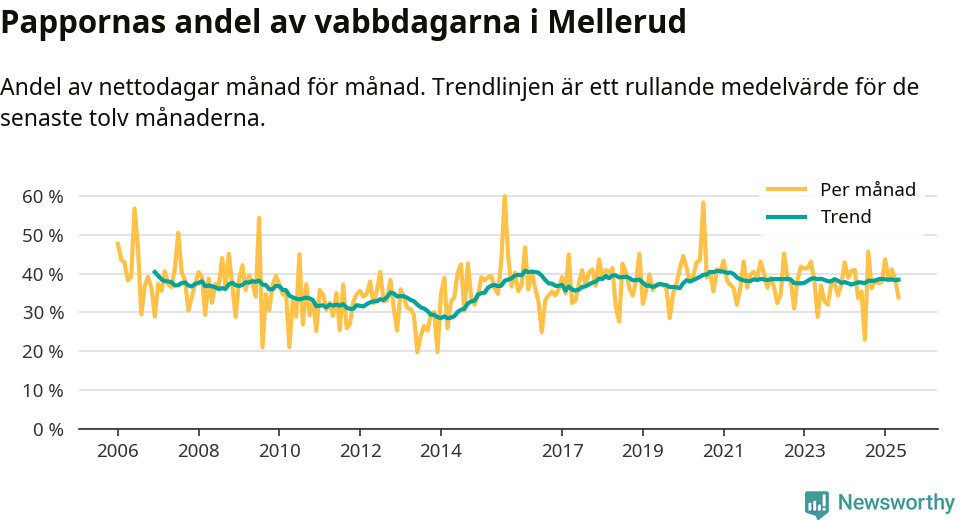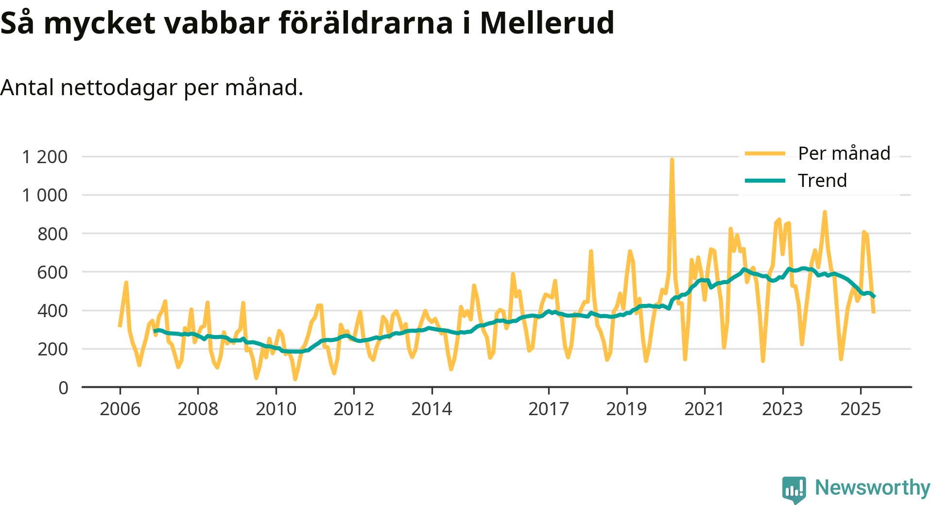 Mellerud ligger en bit från ett jämställt uttag. Under de senaste tolv månaderna har männen stått för 38 procent av all vabb i kommunen. Pappornas uttag peakade vintern 2016 då kommunens fäder var uppe i 41 procent av vabbdagarna 1.