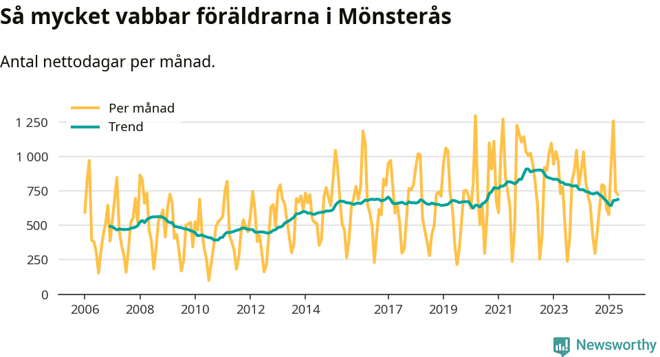 När coronapandemin drog in i mars 2020 peakade antalet vabbdagar både i Mönsterås kommun och i riket som helhet. Under de senaste två åren har vabbuttaget börjat minska igen.