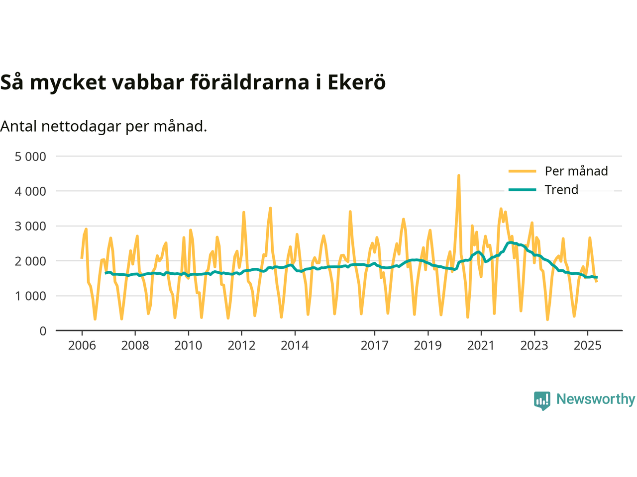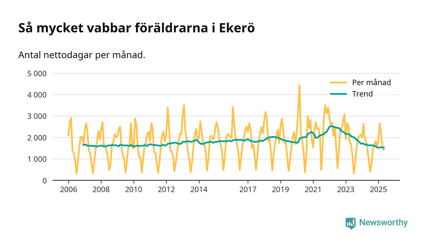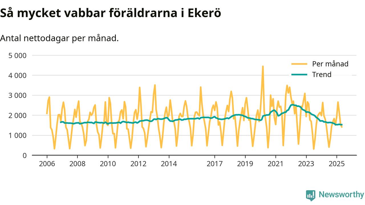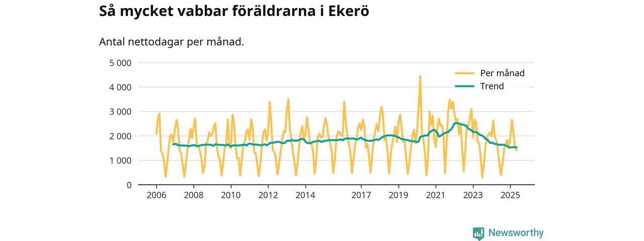 När coronapandemin drog in i mars 2020 peakade antalet vabbdagar både i Ekerö kommun och i riket som helhet. Under de senaste två åren har vabbuttaget börjat minska igen.
