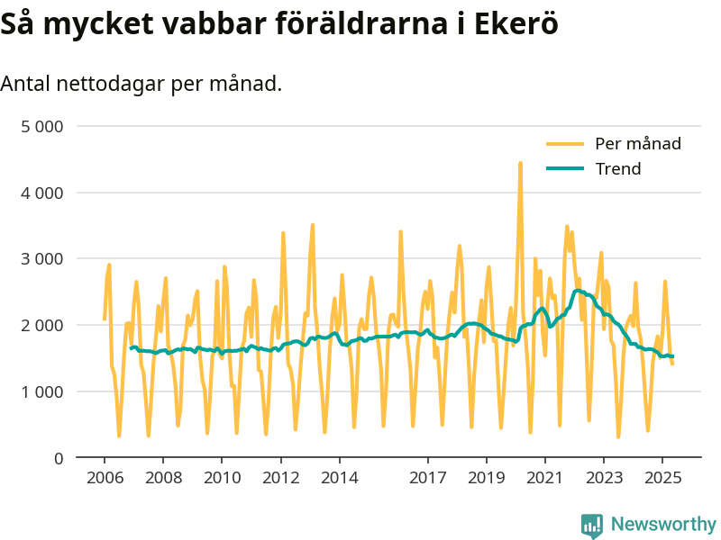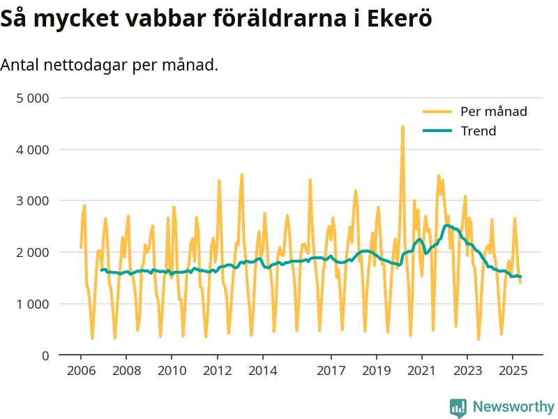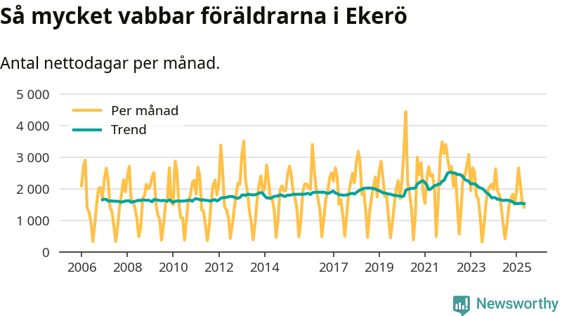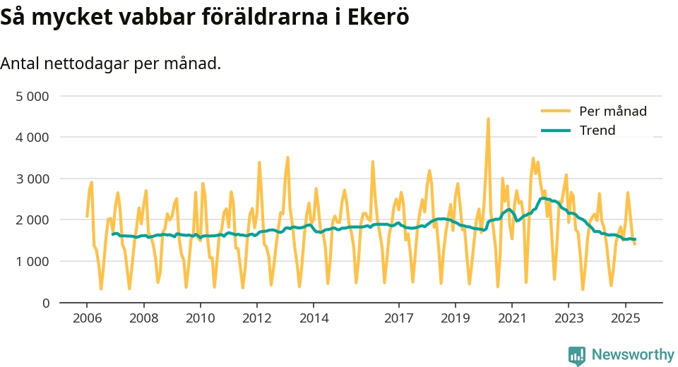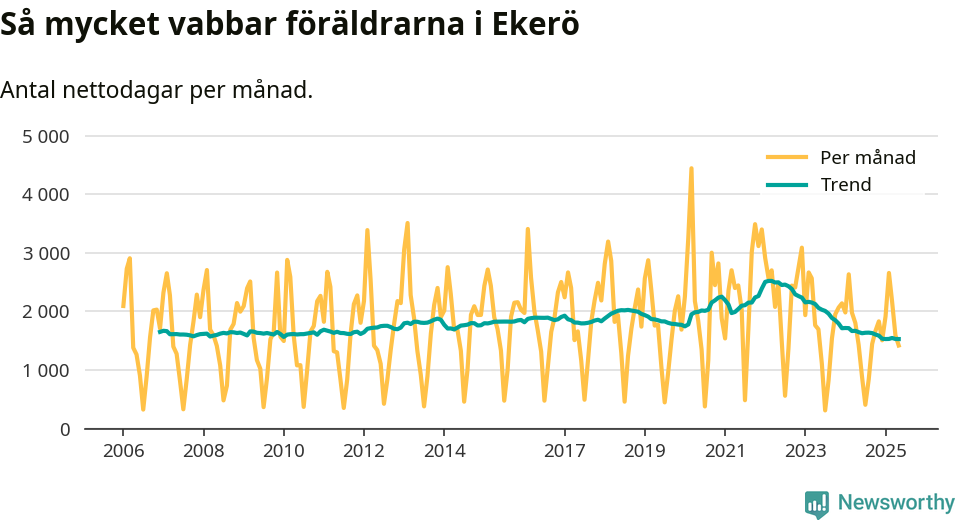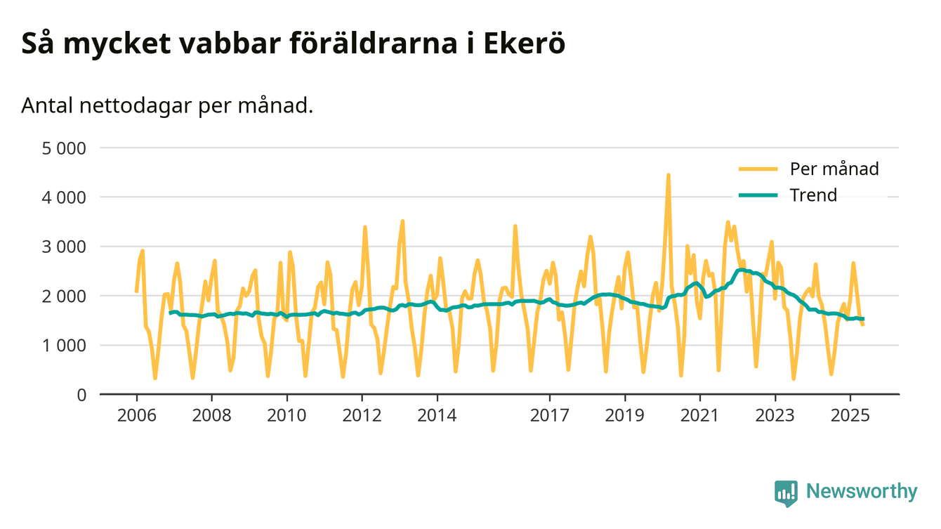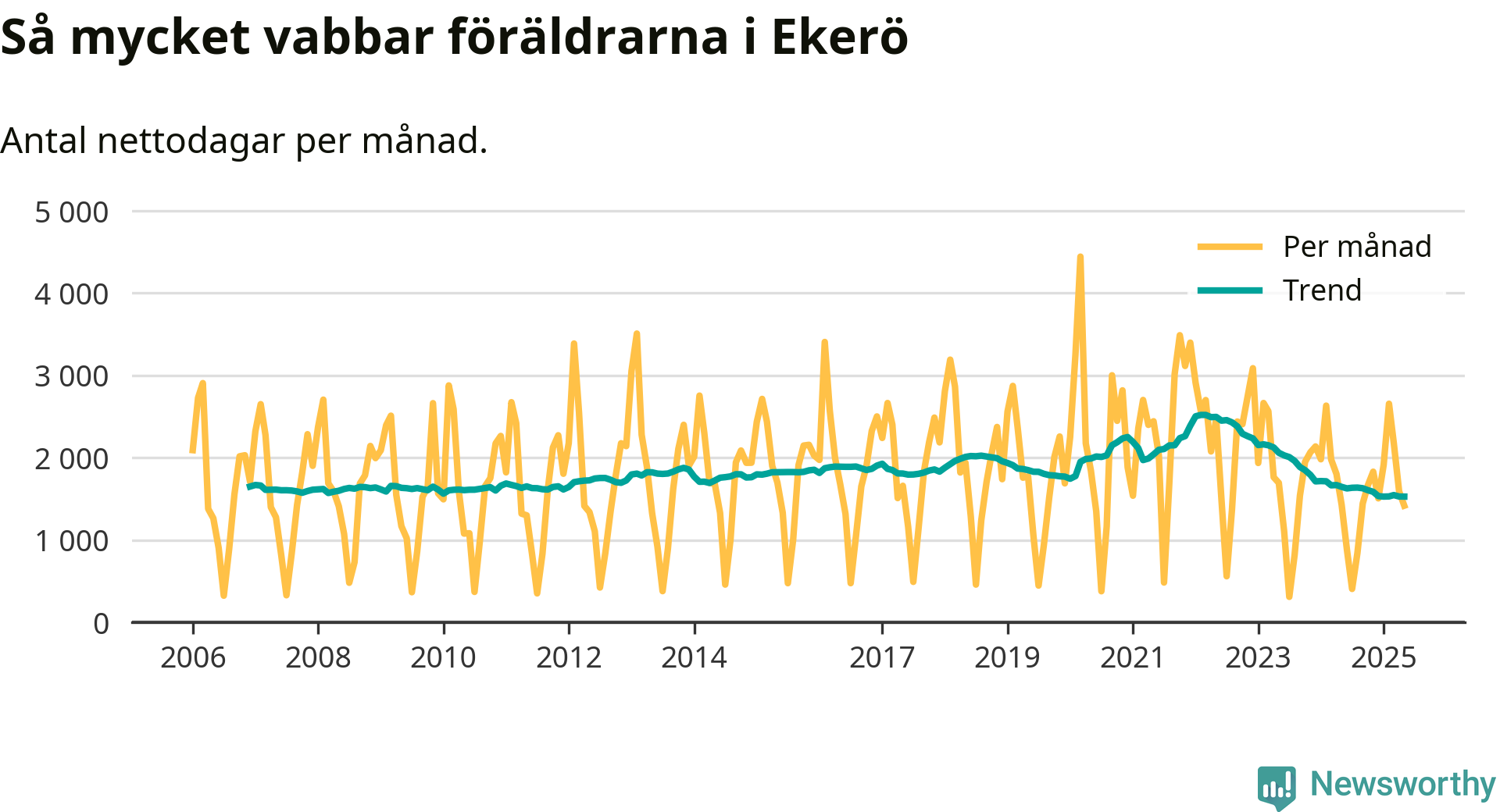När coronapandemin drog in i mars 2020 peakade antalet vabbdagar både i Ekerö kommun och i riket som helhet. Under de senaste två åren har vabbuttaget börjat minska igen.