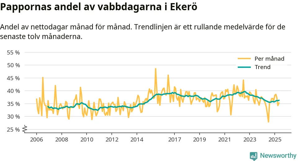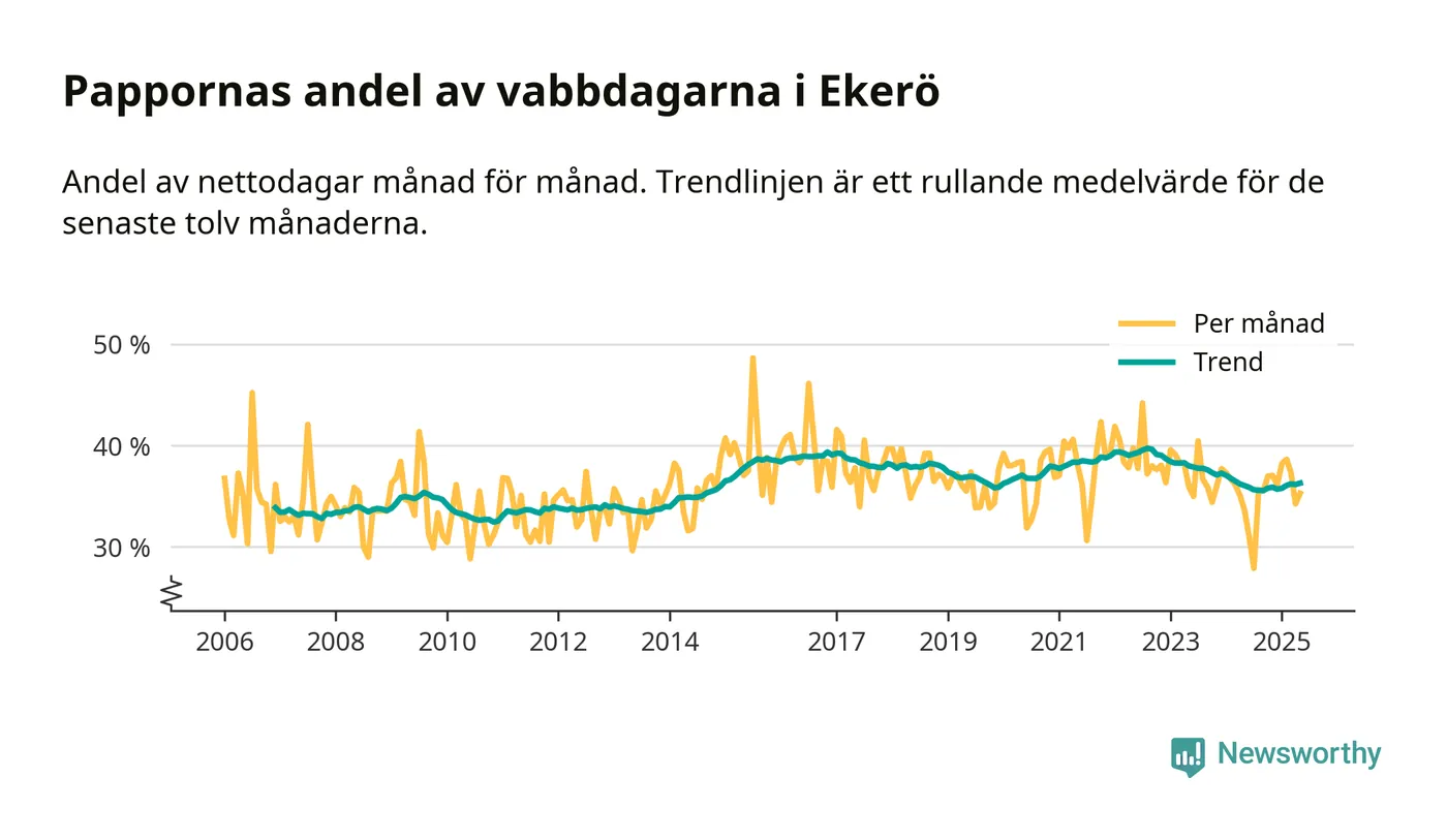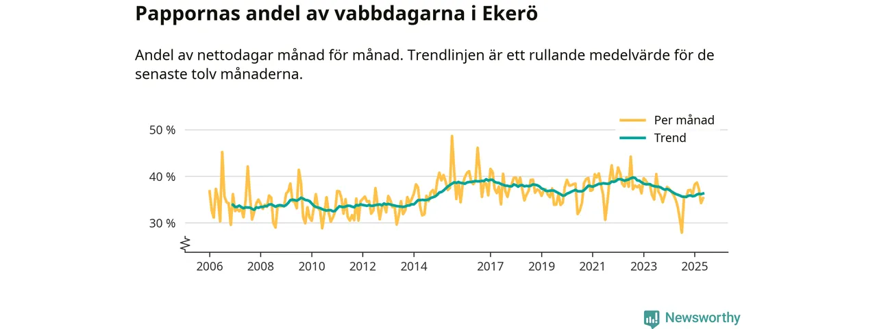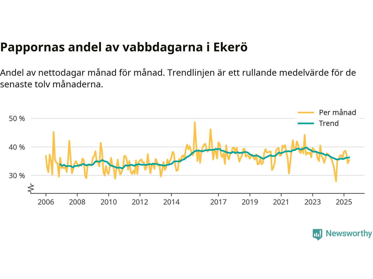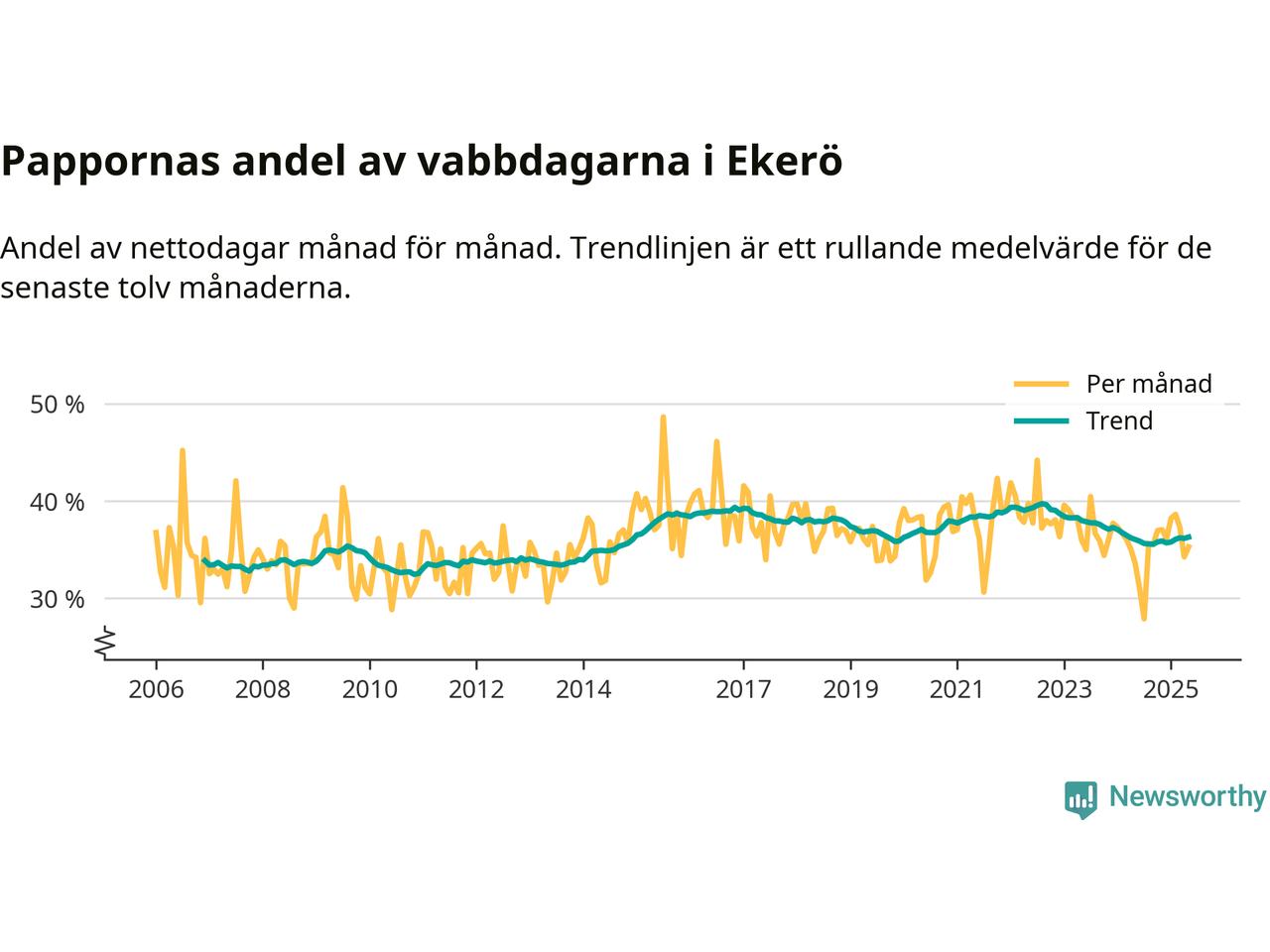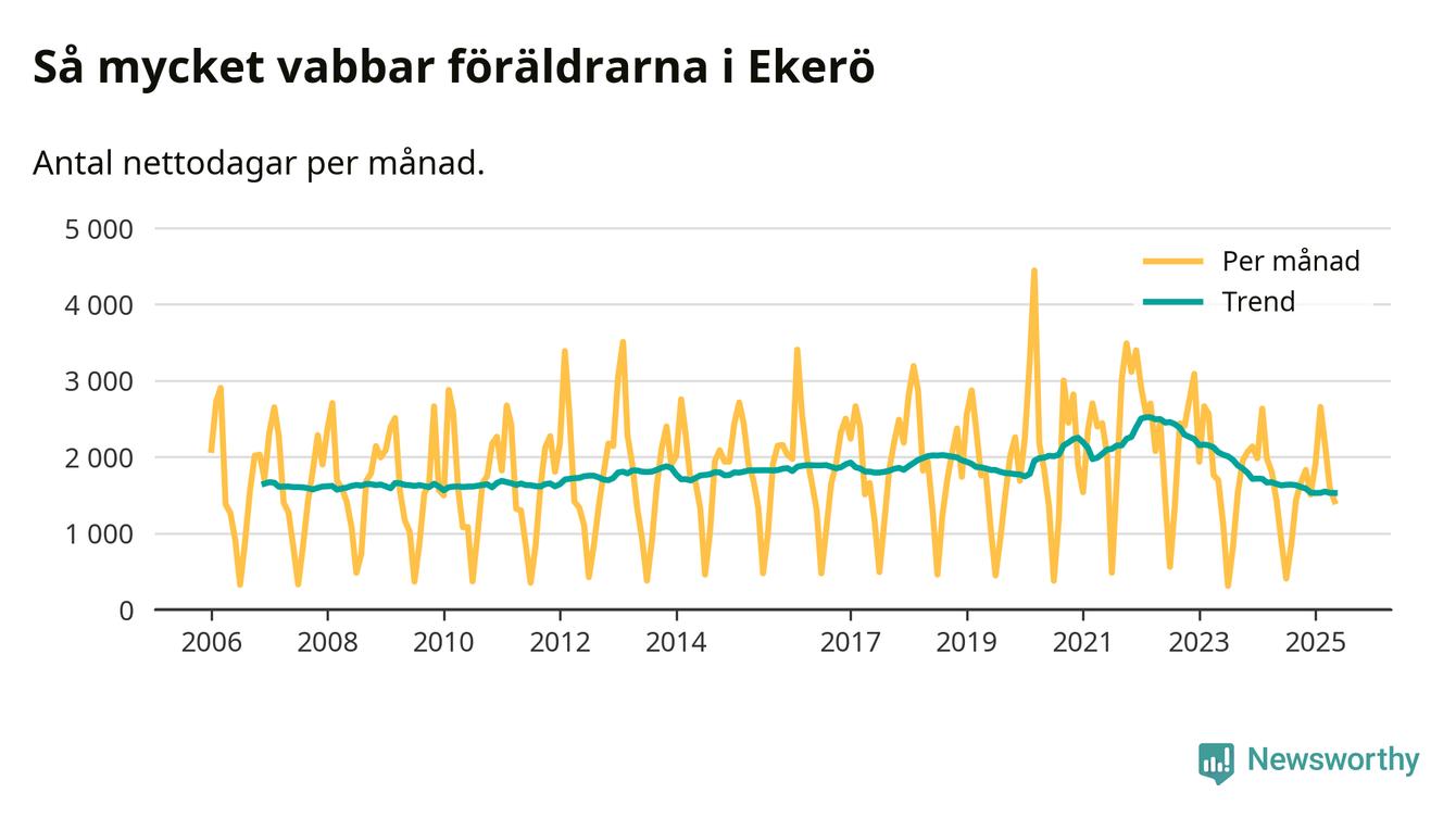 Ekerö ligger en bit från ett jämställt uttag. Under de senaste tolv månaderna har männen stått för 36 procent av all vabb i kommunen. Pappornas uttag peakade sommaren 2022 då kommunens fäder var uppe i 40 procent av vabbdagarna 1.