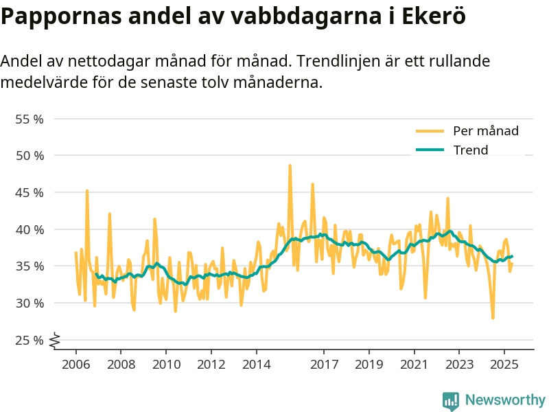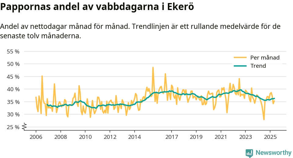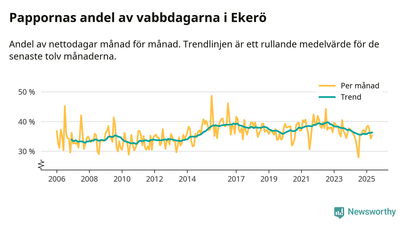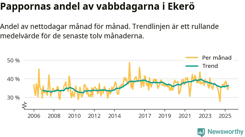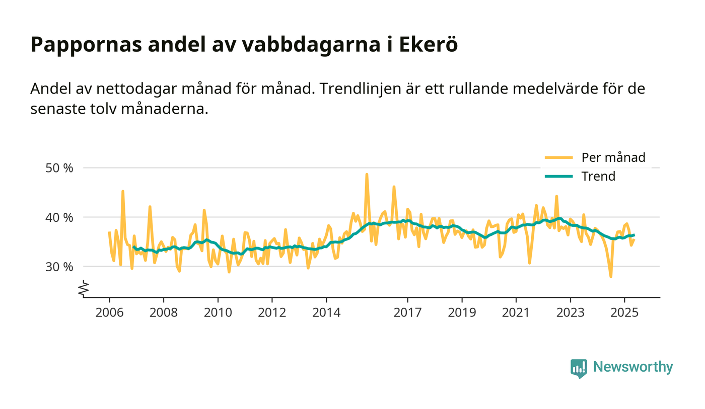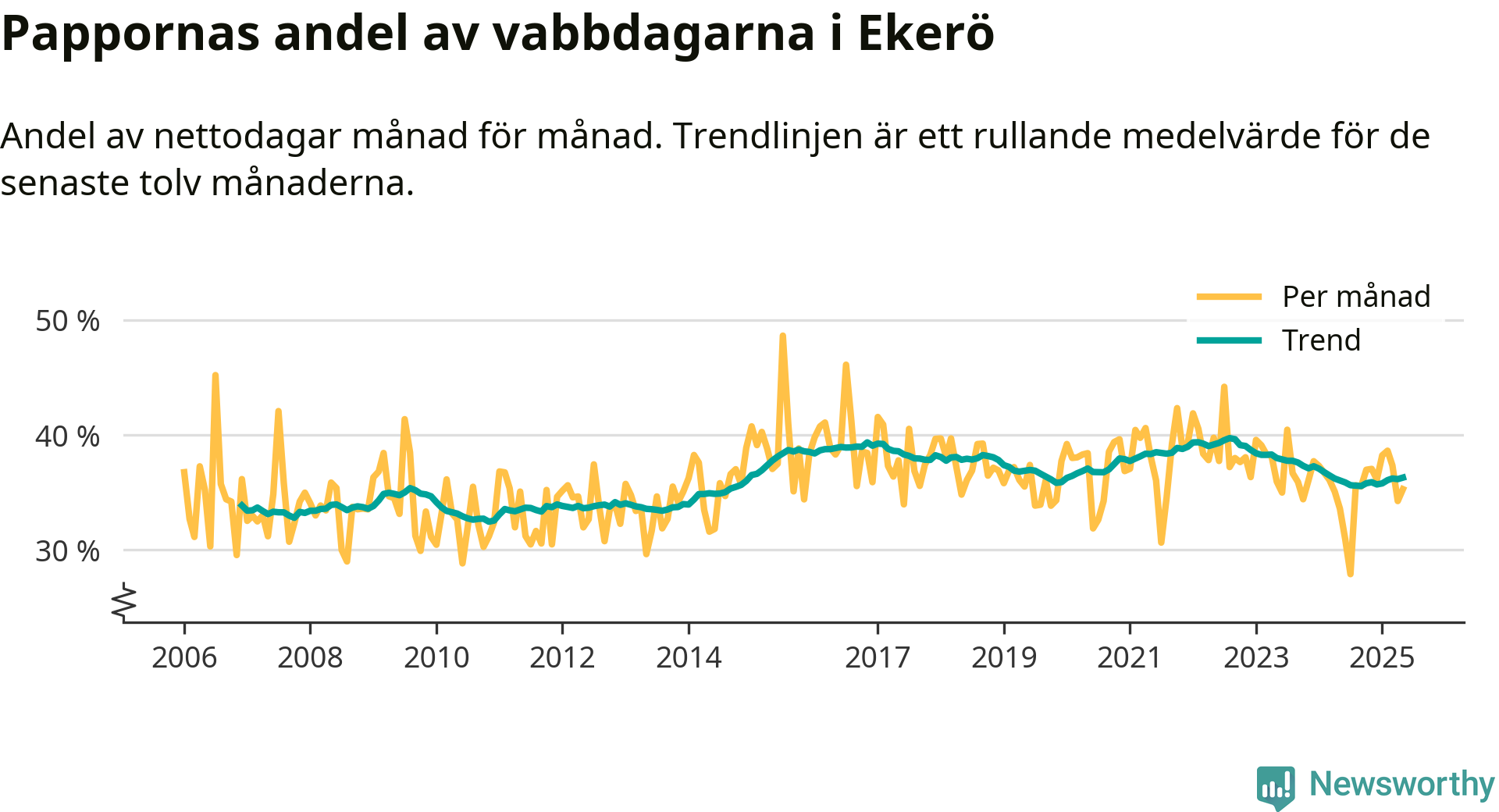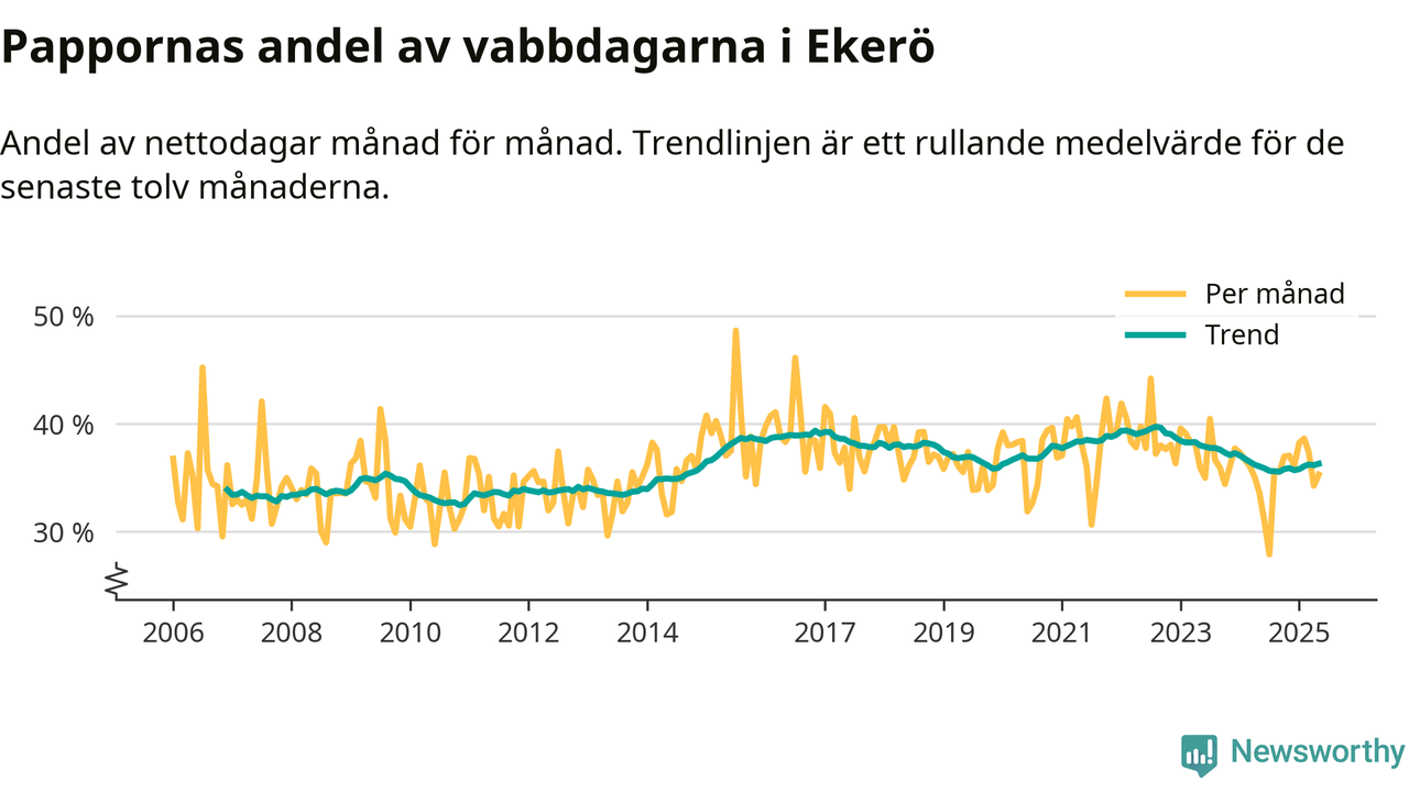 Ekerö ligger en bit från ett jämställt uttag. Under de senaste tolv månaderna har männen stått för 36 procent av all vabb i kommunen. Pappornas uttag peakade sommaren 2022 då kommunens fäder var uppe i 40 procent av vabbdagarna 1.
