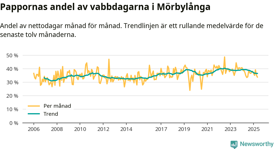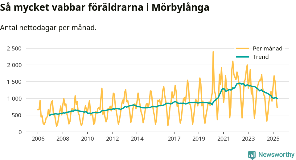 När coronapandemin drog in i mars 2020 peakade antalet vabbdagar både i Mörbylånga kommun och i riket som helhet. Under de senaste två åren har vabbuttaget börjat minska igen.