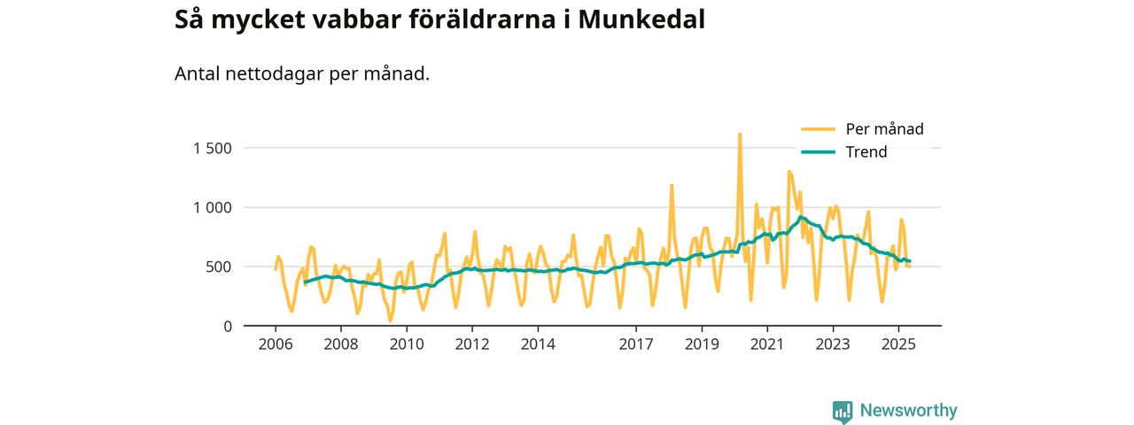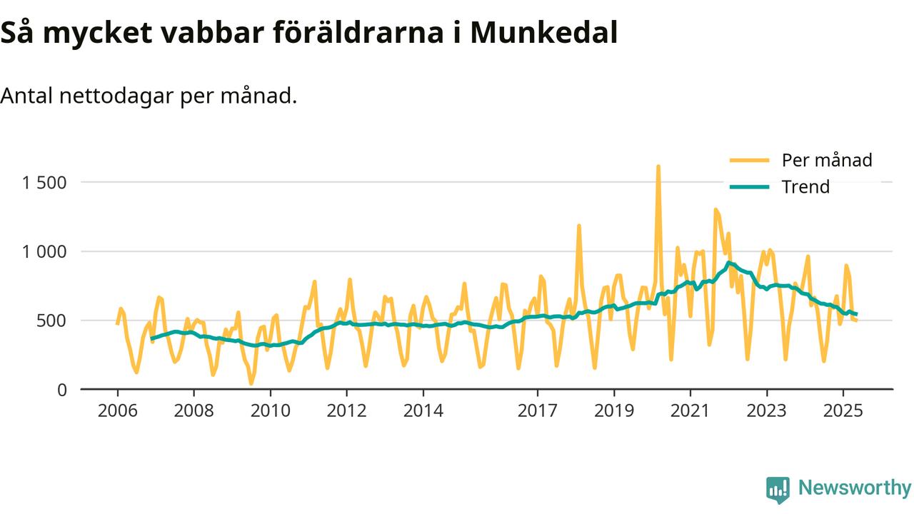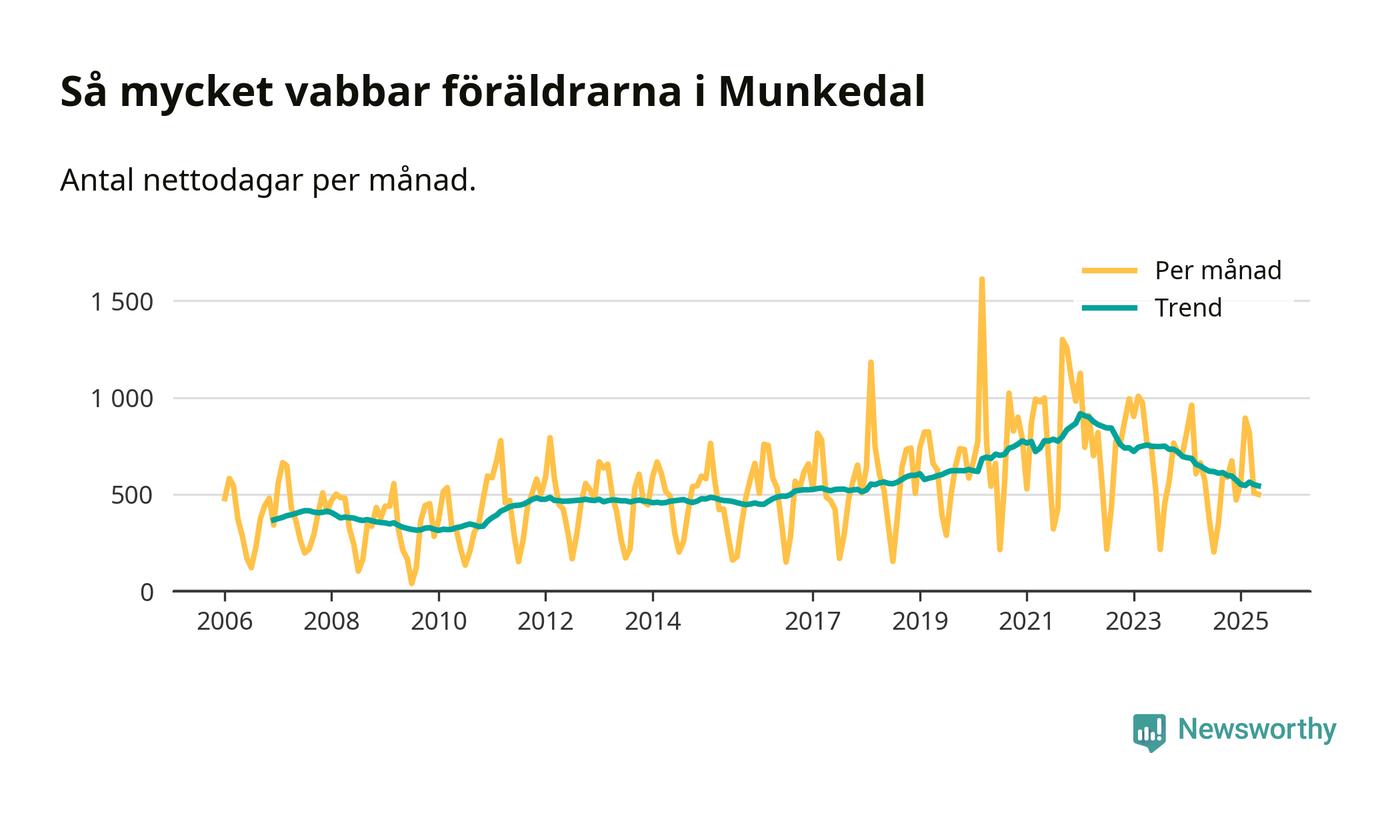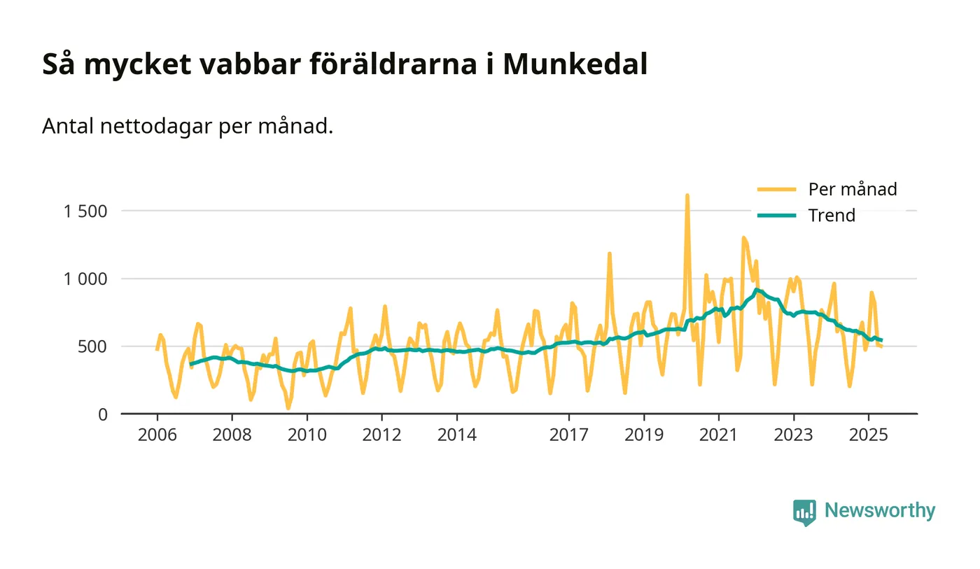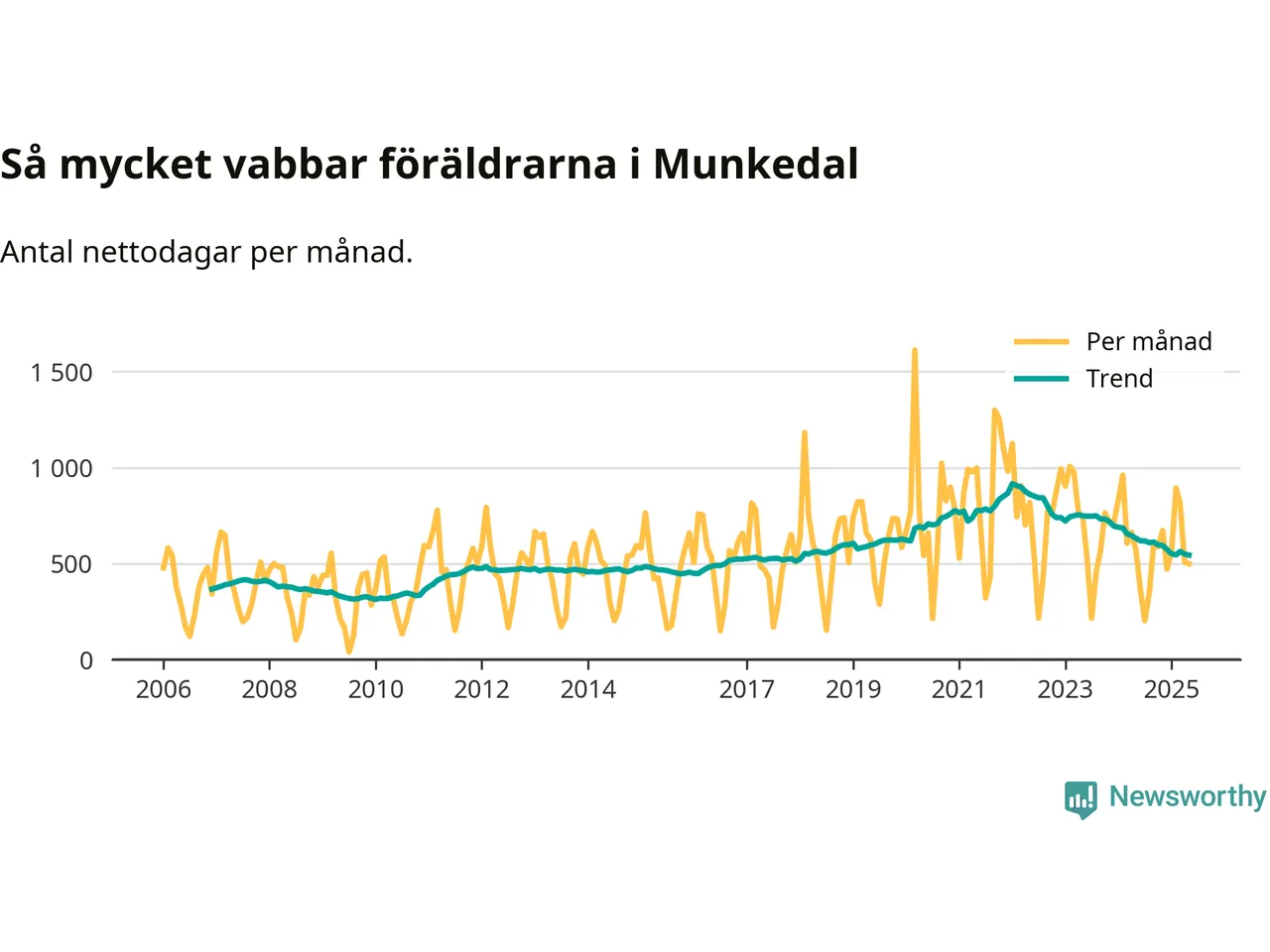 När coronapandemin drog in i mars 2020 peakade antalet vabbdagar både i Munkedals kommun och i riket som helhet. Under de senaste två åren har vabbuttaget börjat minska igen.