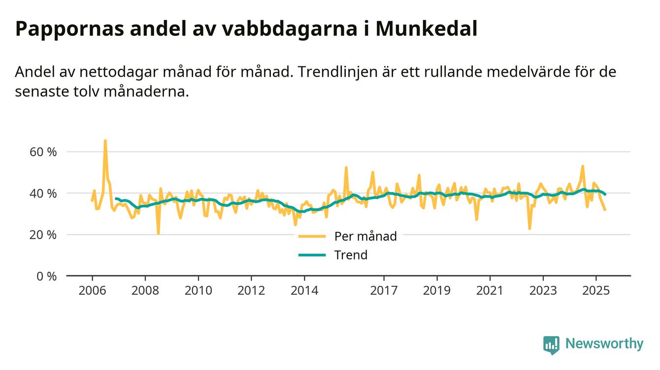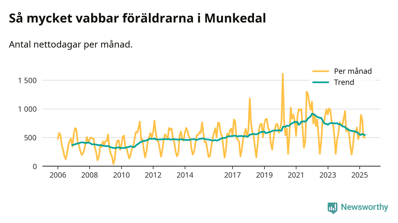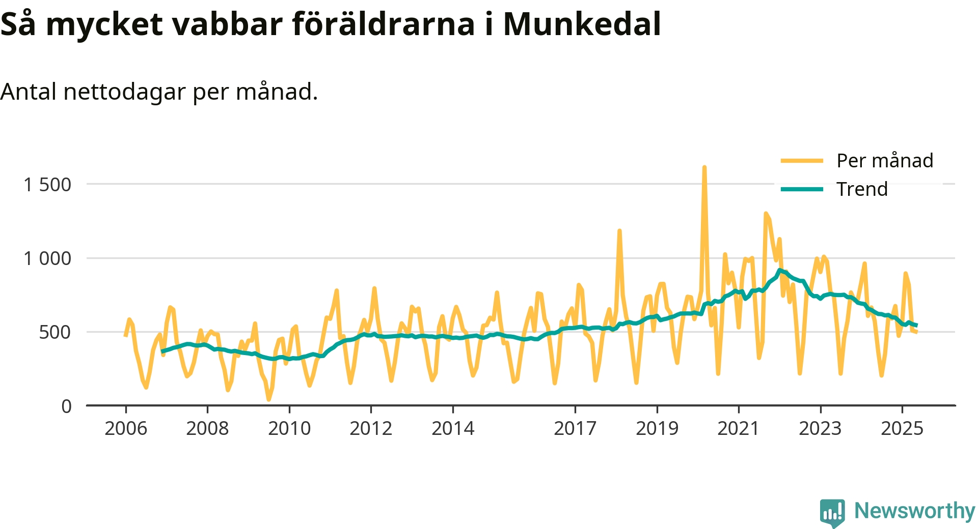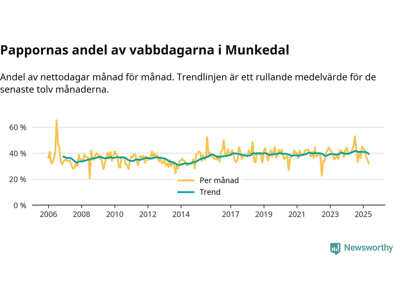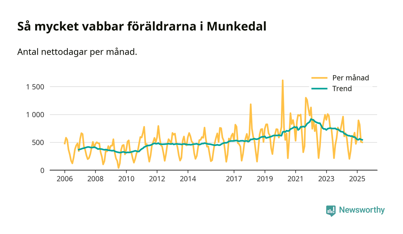 När coronapandemin drog in i mars 2020 peakade antalet vabbdagar både i Munkedals kommun och i riket som helhet. Under de senaste två åren har vabbuttaget börjat minska igen.