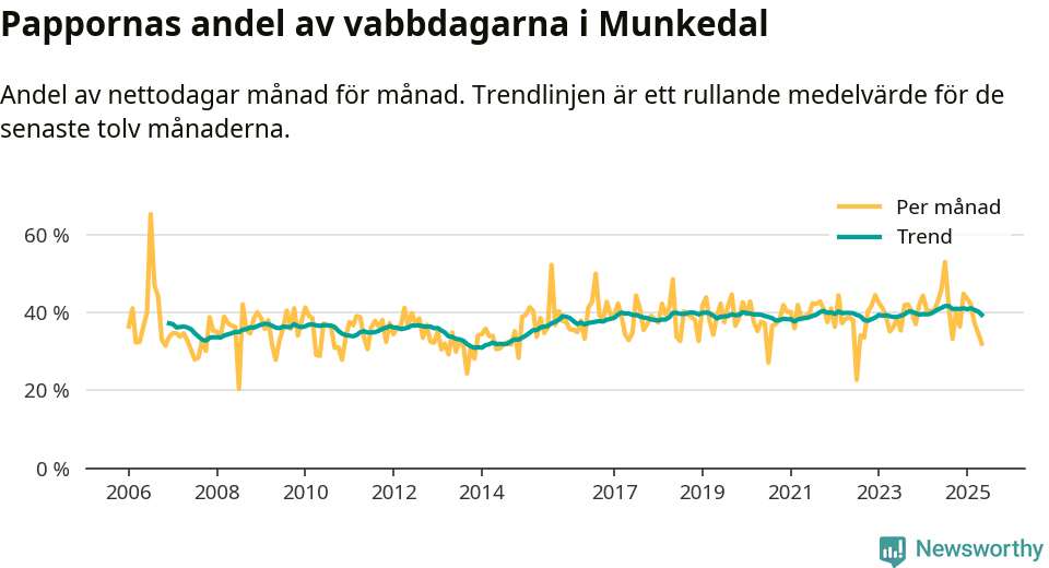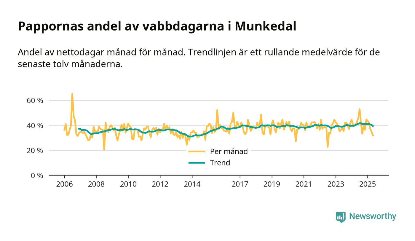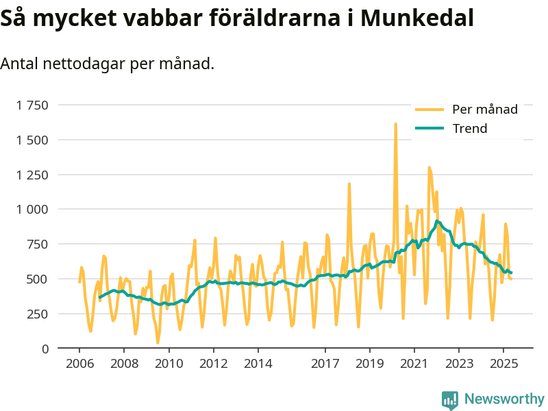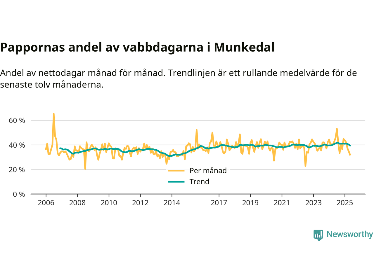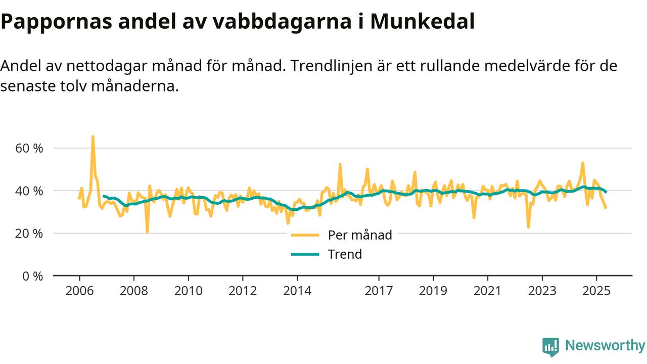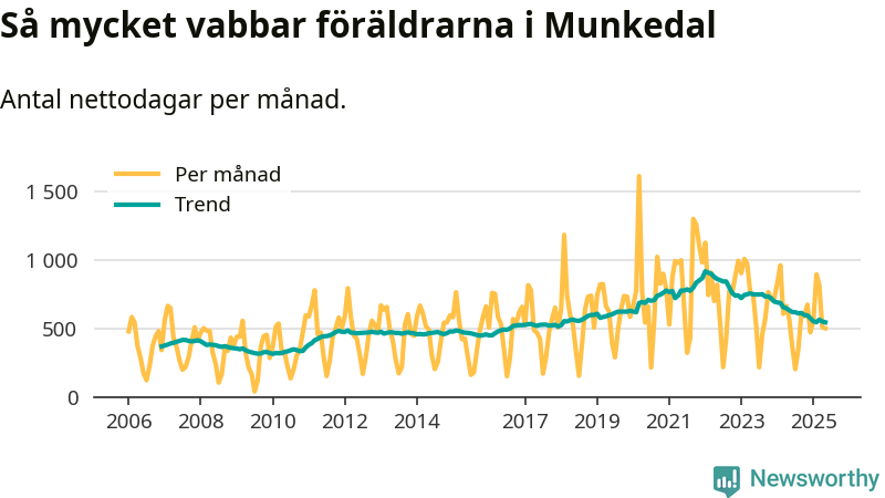 När coronapandemin drog in i mars 2020 peakade antalet vabbdagar både i Munkedals kommun och i riket som helhet. Under de senaste två åren har vabbuttaget börjat minska igen.