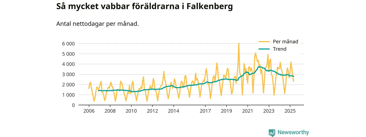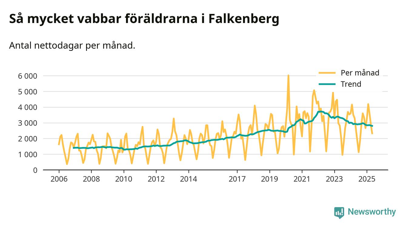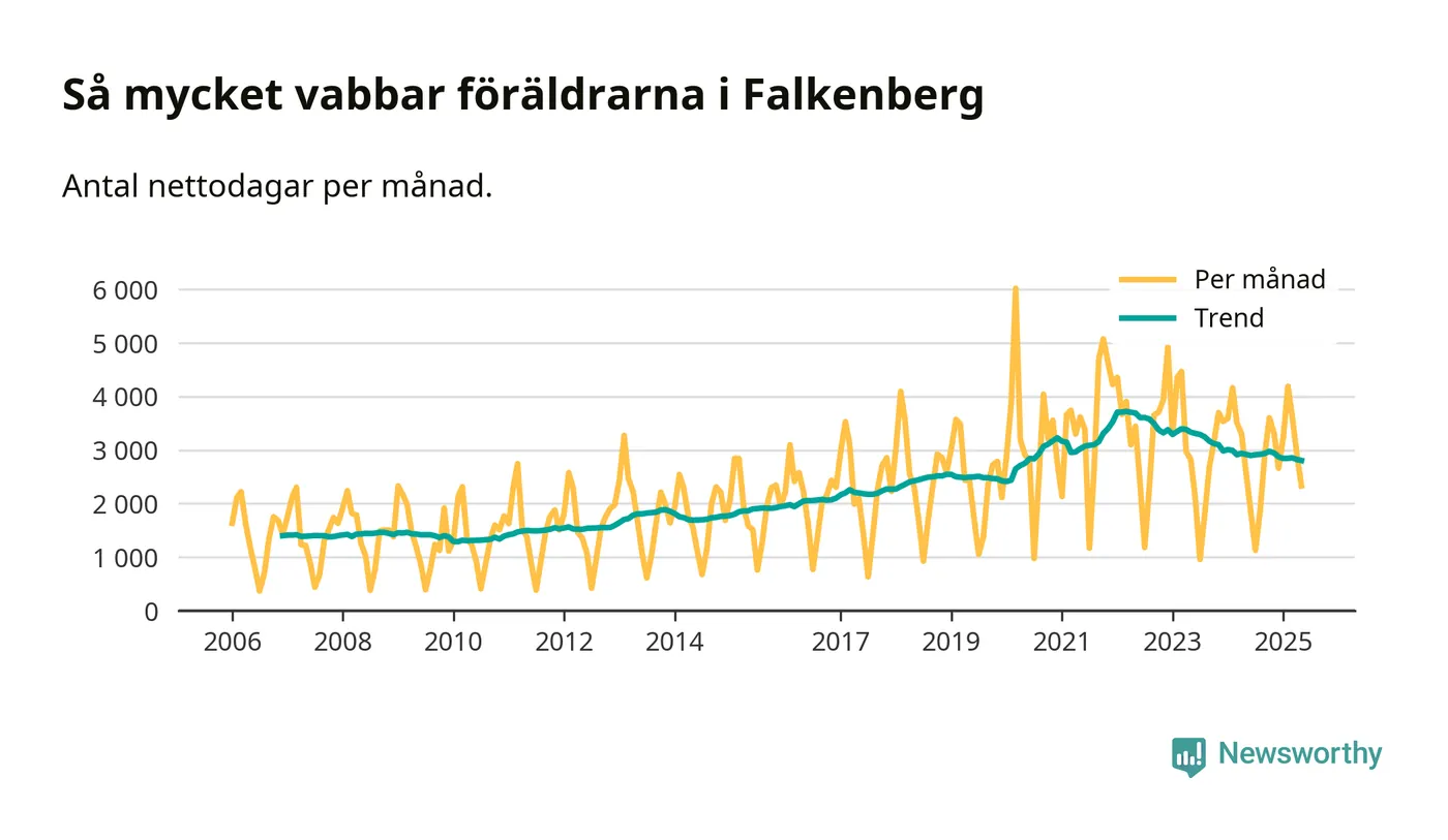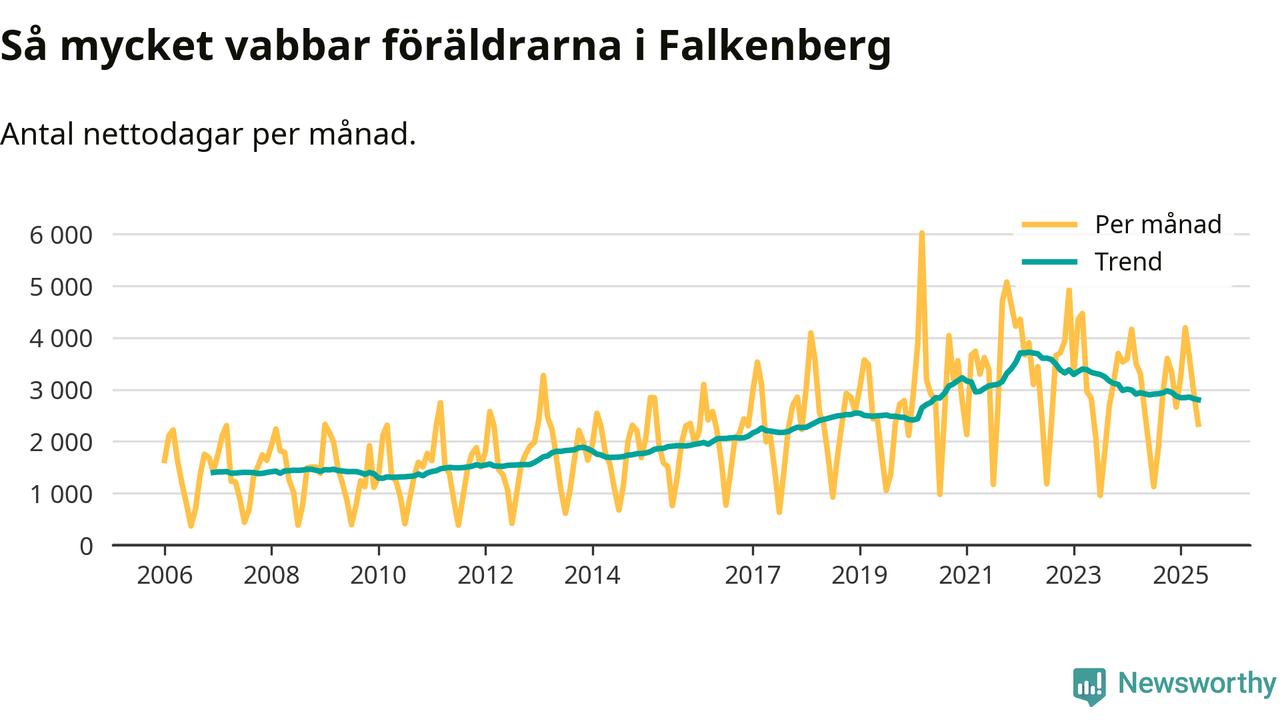 När coronapandemin drog in i mars 2020 peakade antalet vabbdagar både i Falkenbergs kommun och i riket som helhet. Under de senaste två åren har vabbuttaget börjat minska igen.