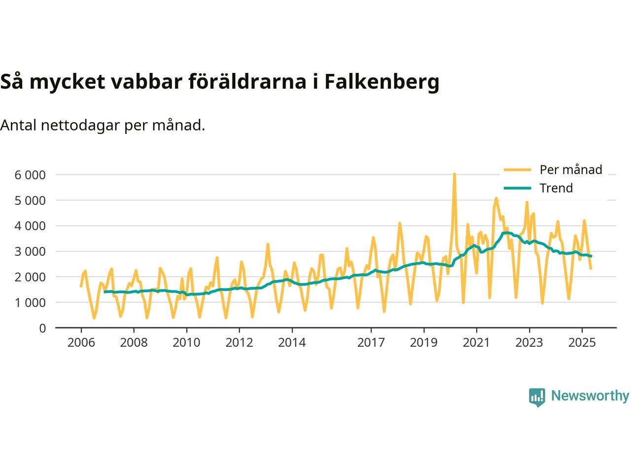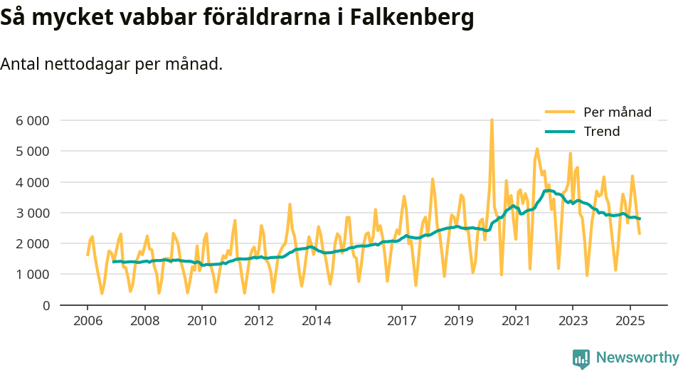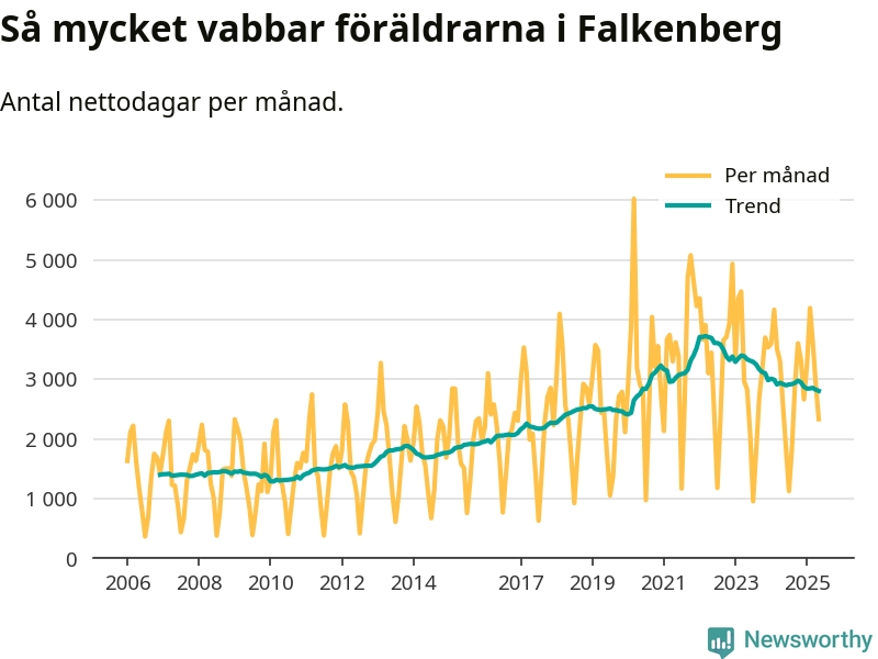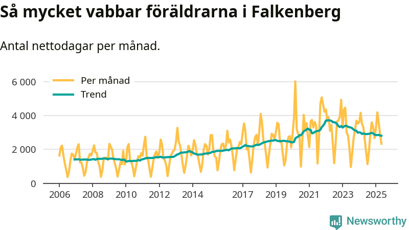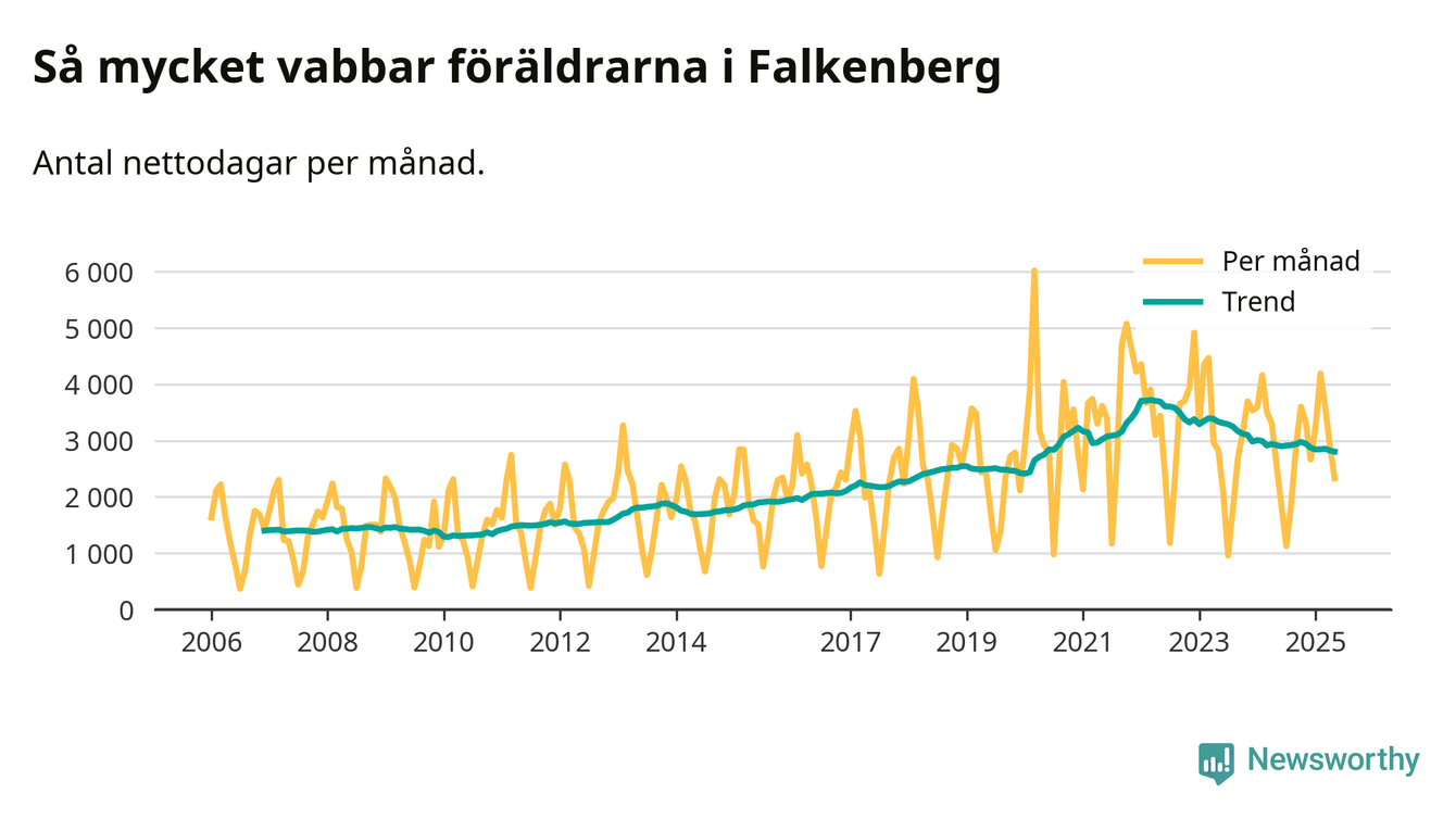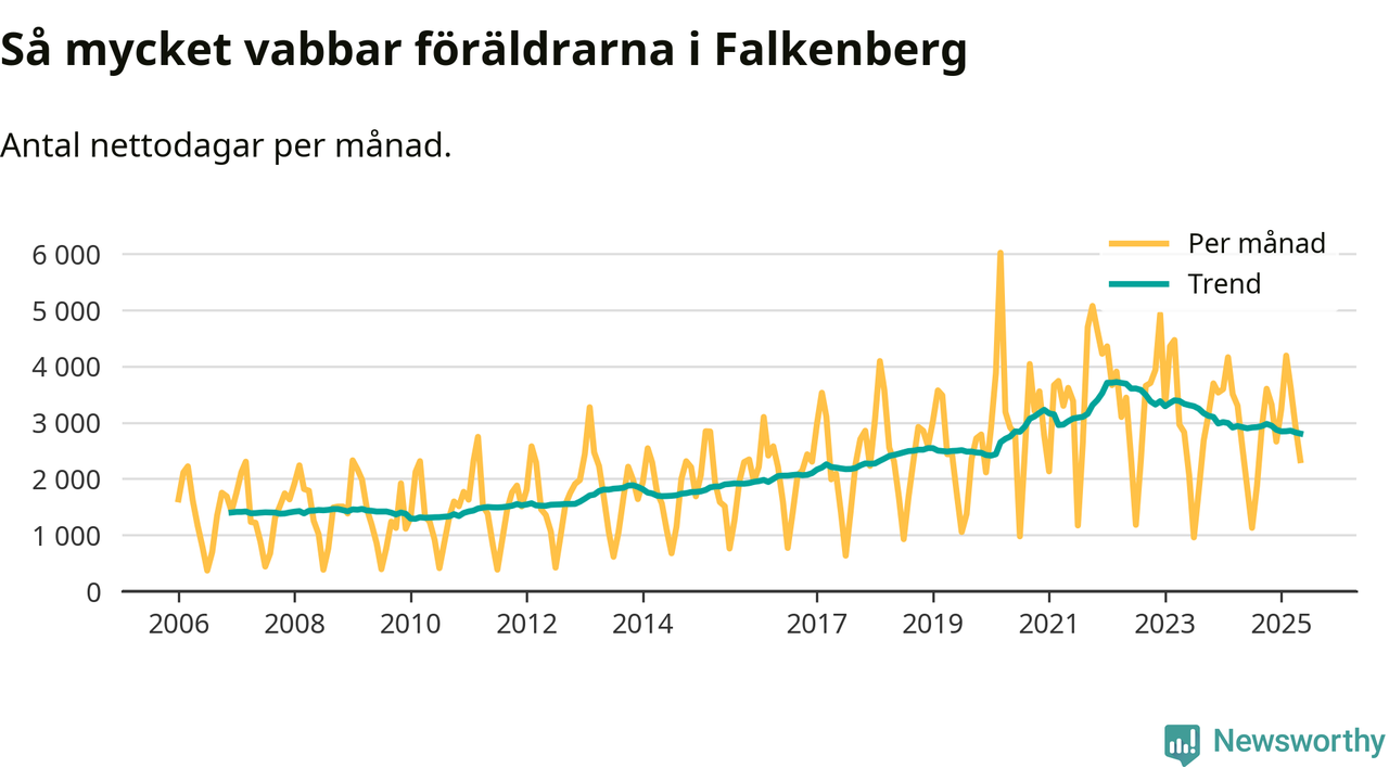 När coronapandemin drog in i mars 2020 peakade antalet vabbdagar både i Falkenbergs kommun och i riket som helhet. Under de senaste två åren har vabbuttaget börjat minska igen.