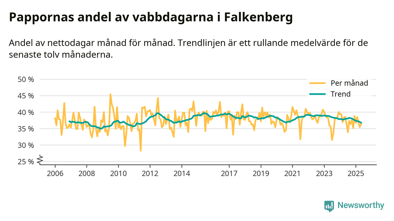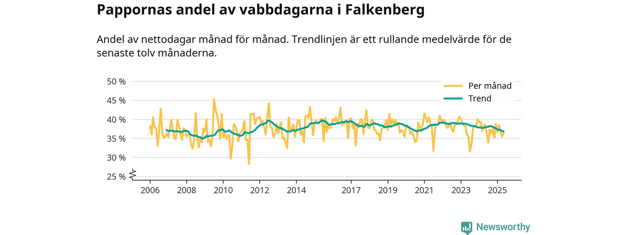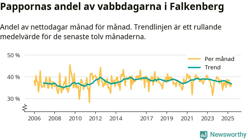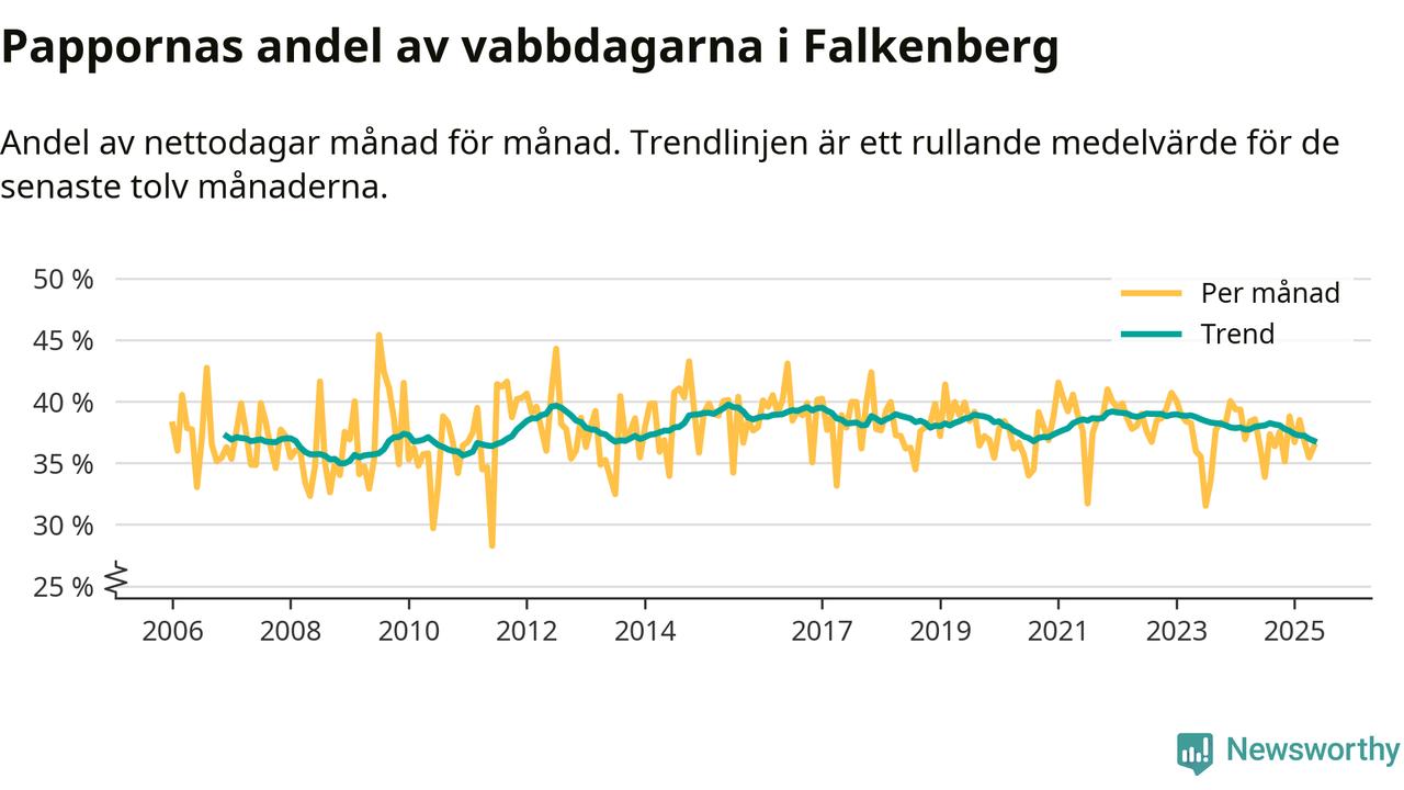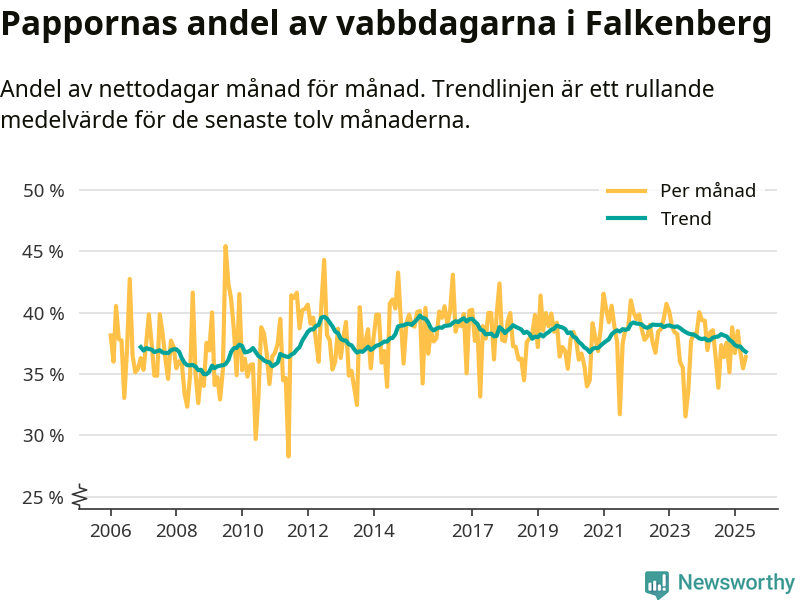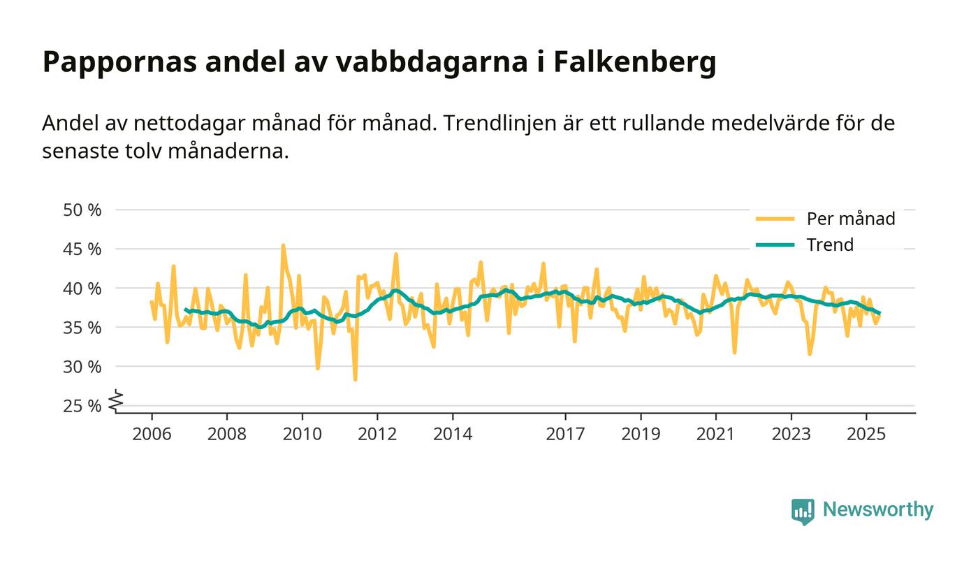Falkenberg ligger en bit från ett jämställt uttag. Under de senaste tolv månaderna har männen stått för 37 procent av all vabb i kommunen. Det är en lägre andel än på nästan fem år.
