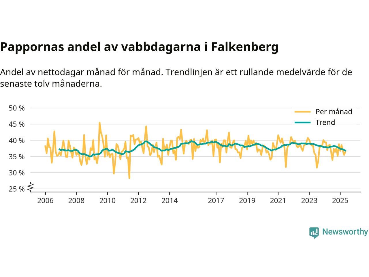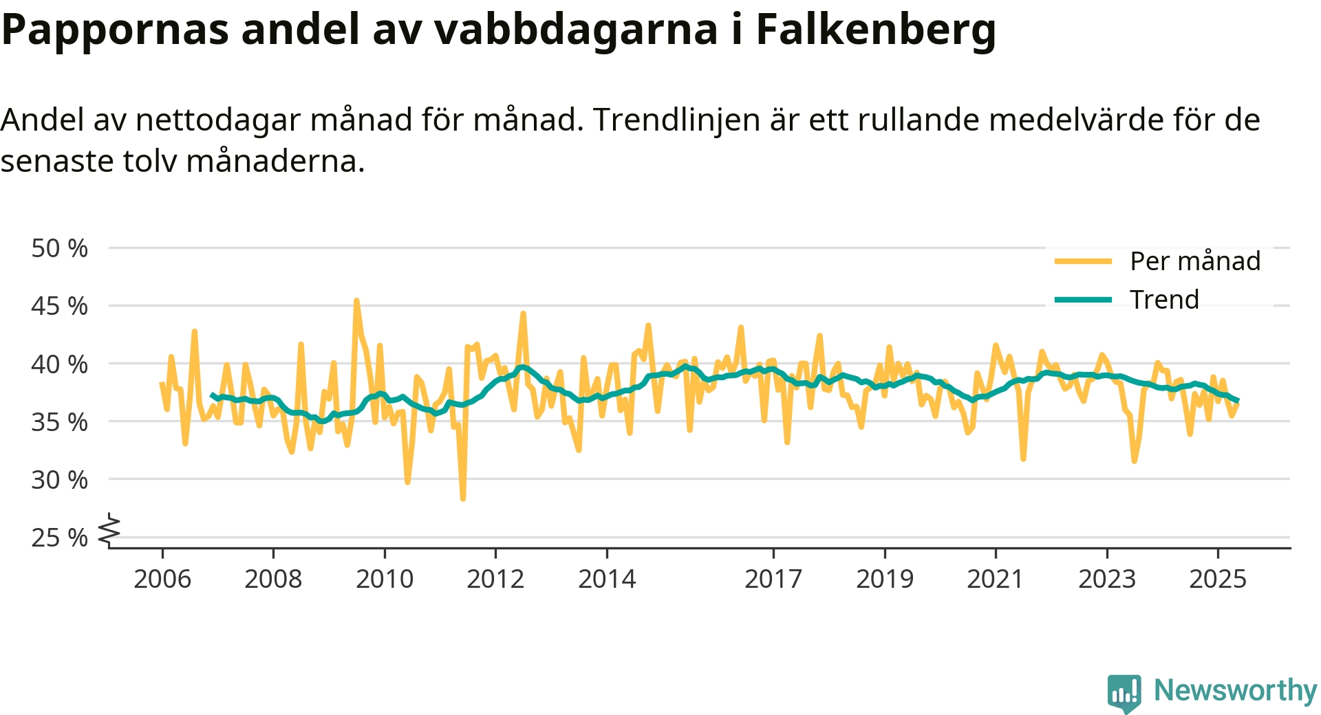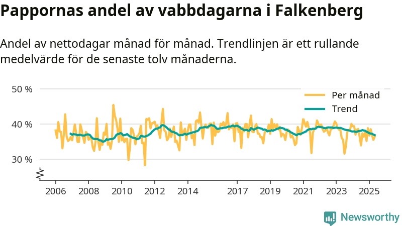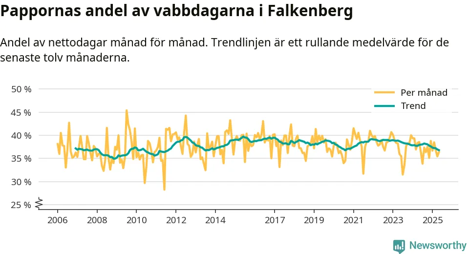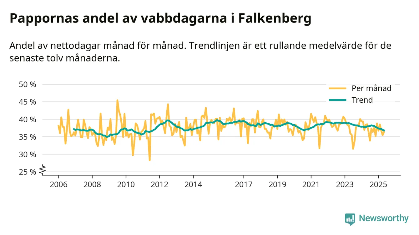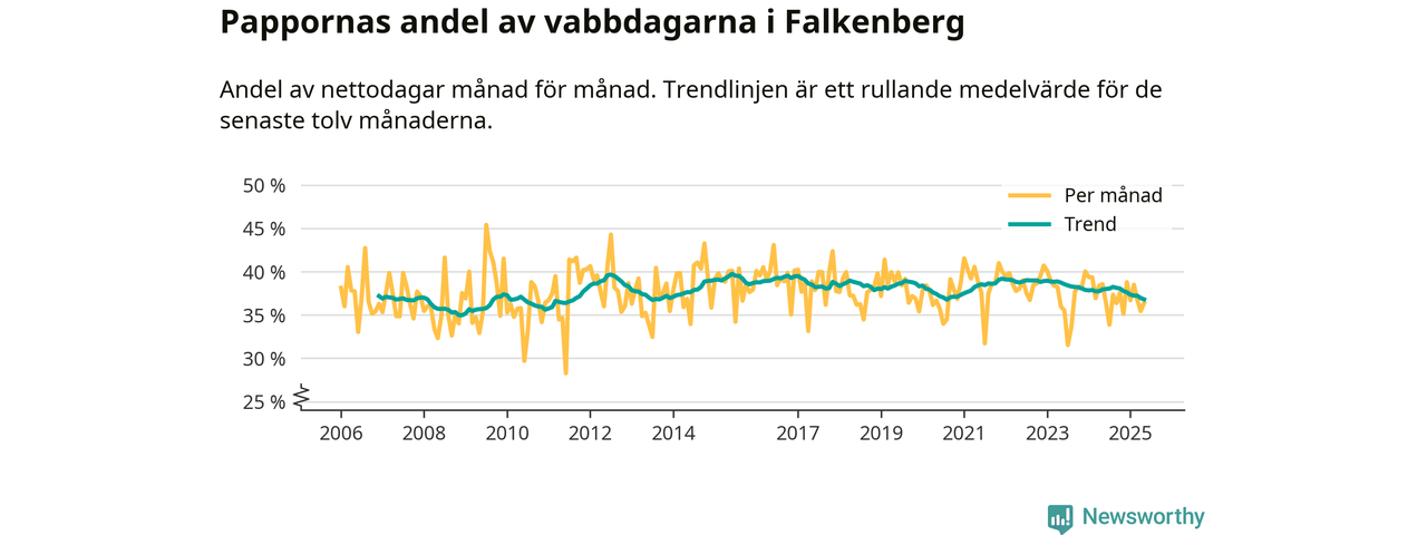 Falkenberg ligger en bit från ett jämställt uttag. Under de senaste tolv månaderna har männen stått för 37 procent av all vabb i kommunen. Det är en lägre andel än på nästan fem år.