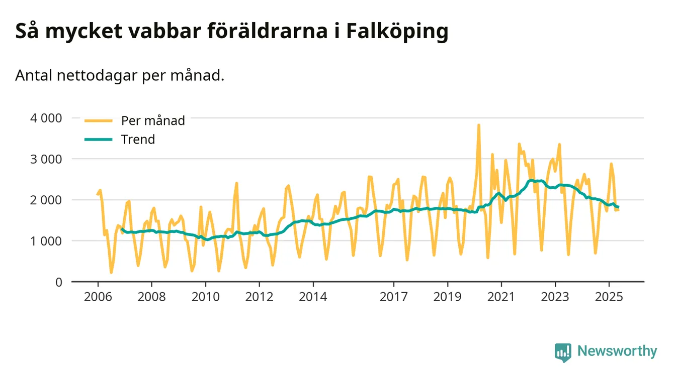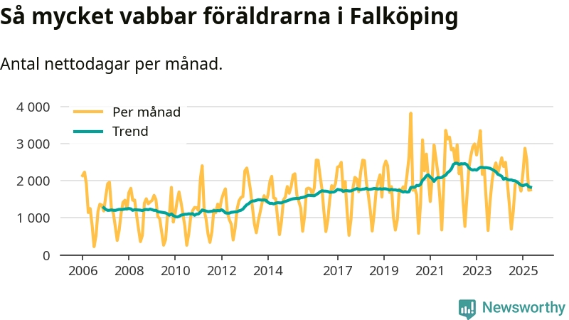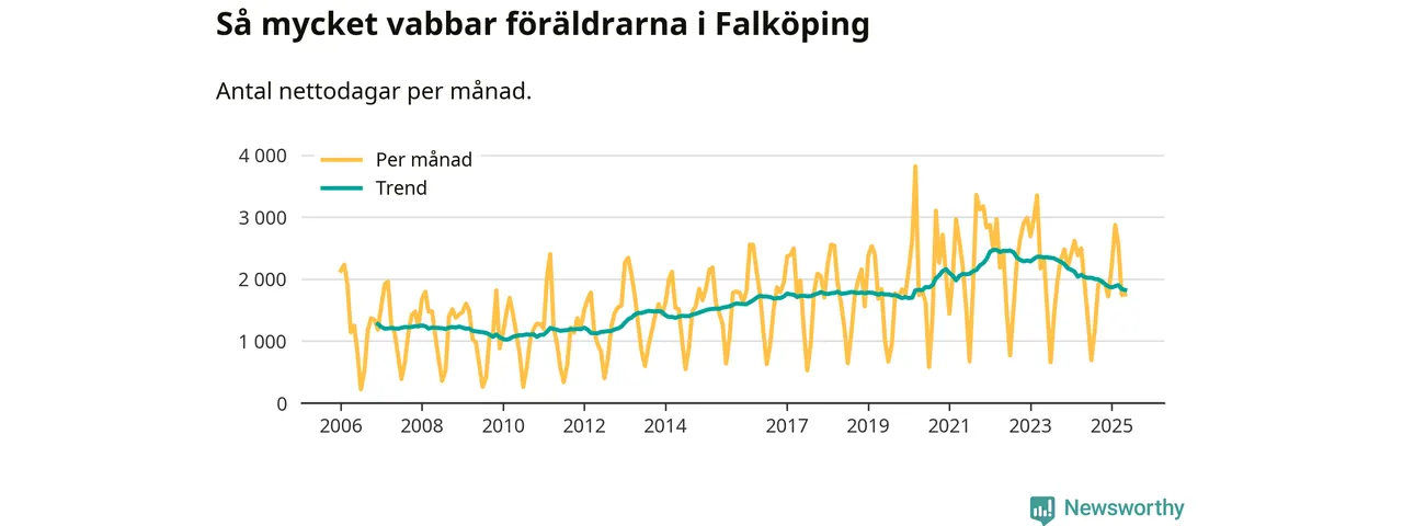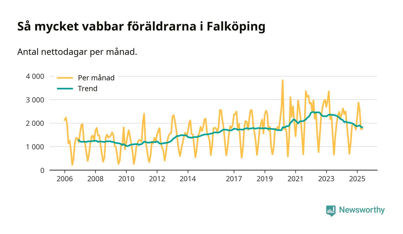 När coronapandemin drog in i mars 2020 peakade antalet vabbdagar både i Falköpings kommun och i riket som helhet. Under de senaste två åren har vabbuttaget börjat minska igen.