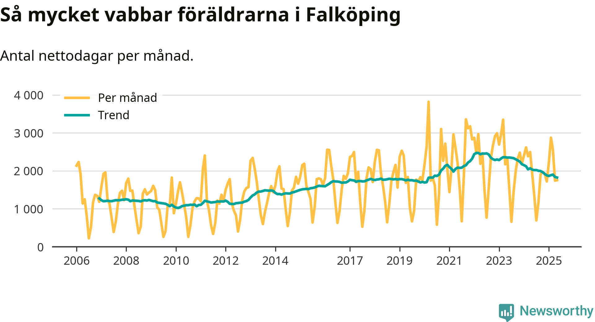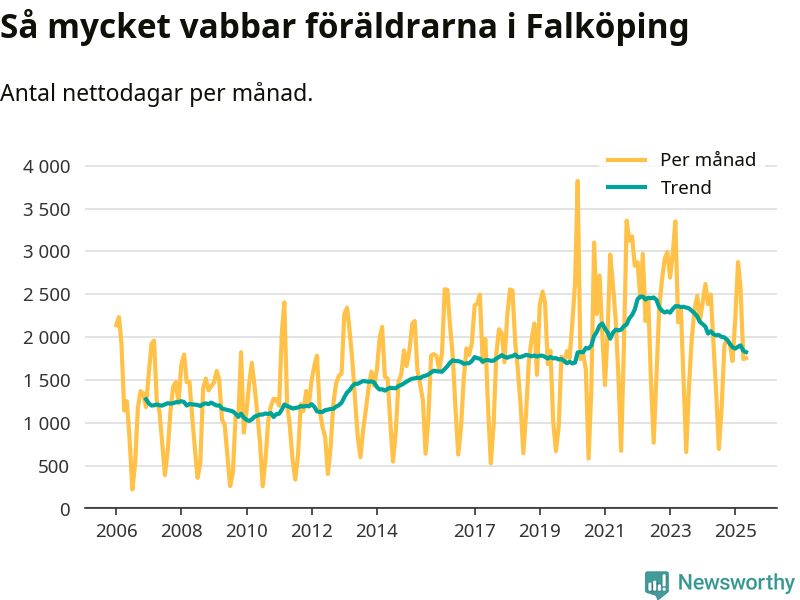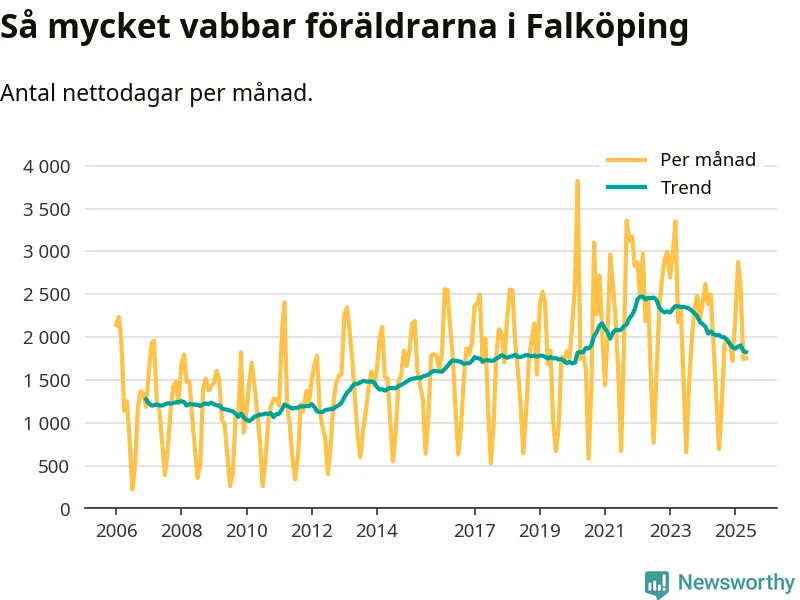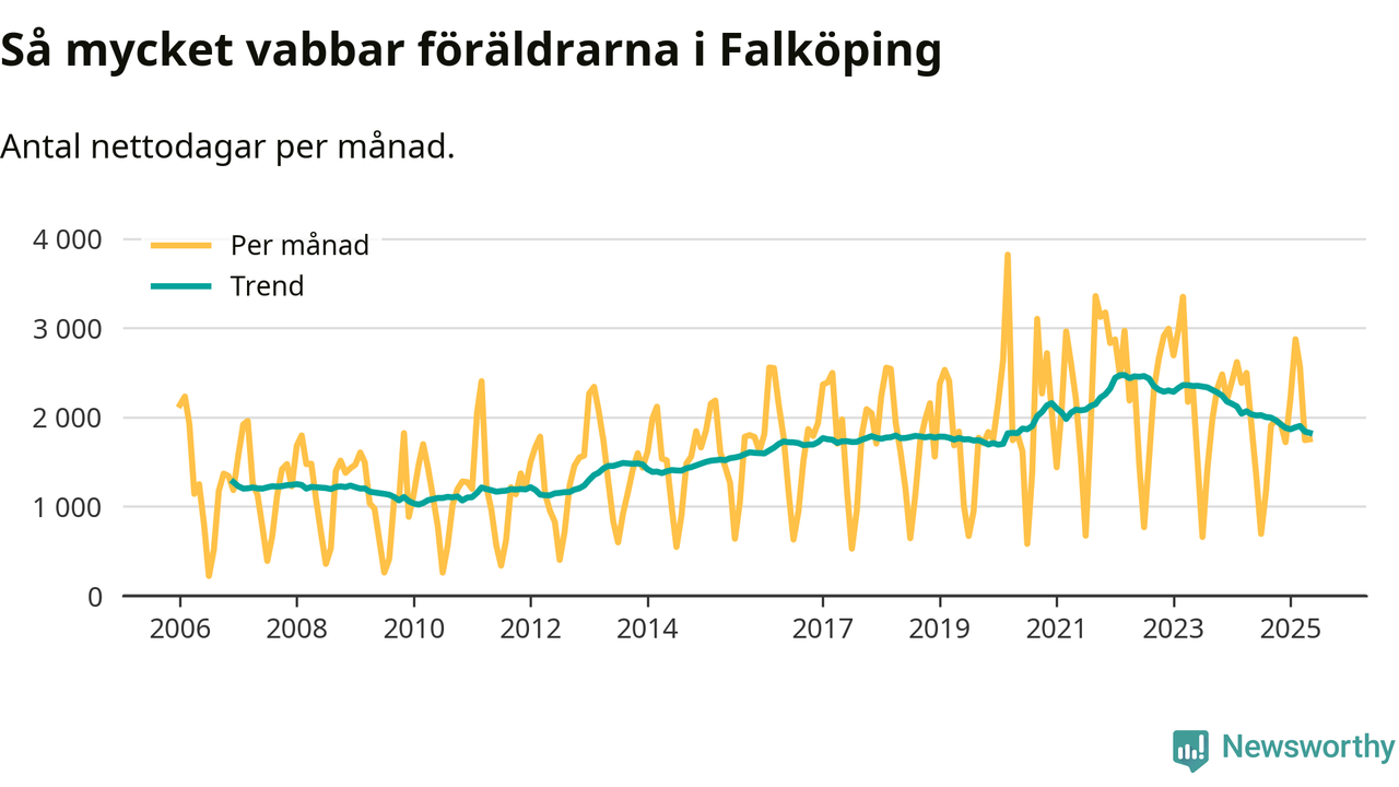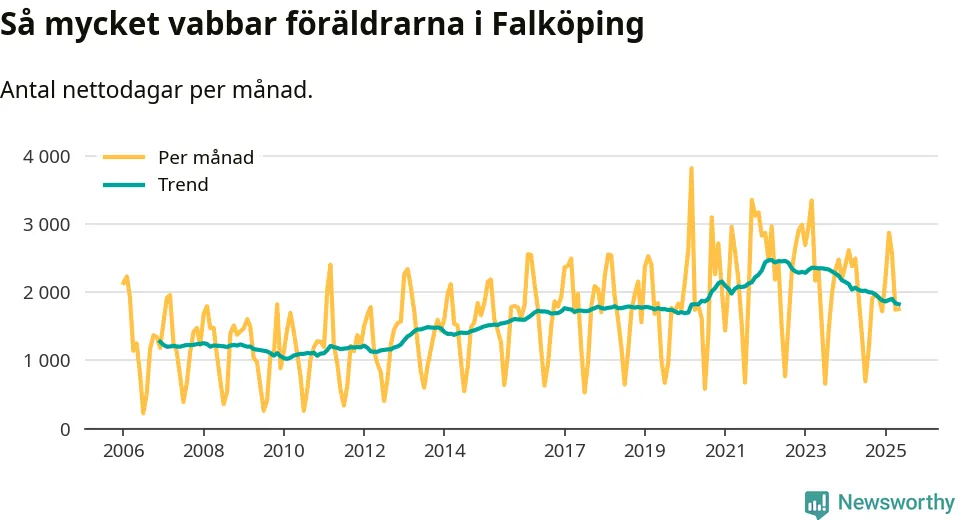 När coronapandemin drog in i mars 2020 peakade antalet vabbdagar både i Falköpings kommun och i riket som helhet. Under de senaste två åren har vabbuttaget börjat minska igen.