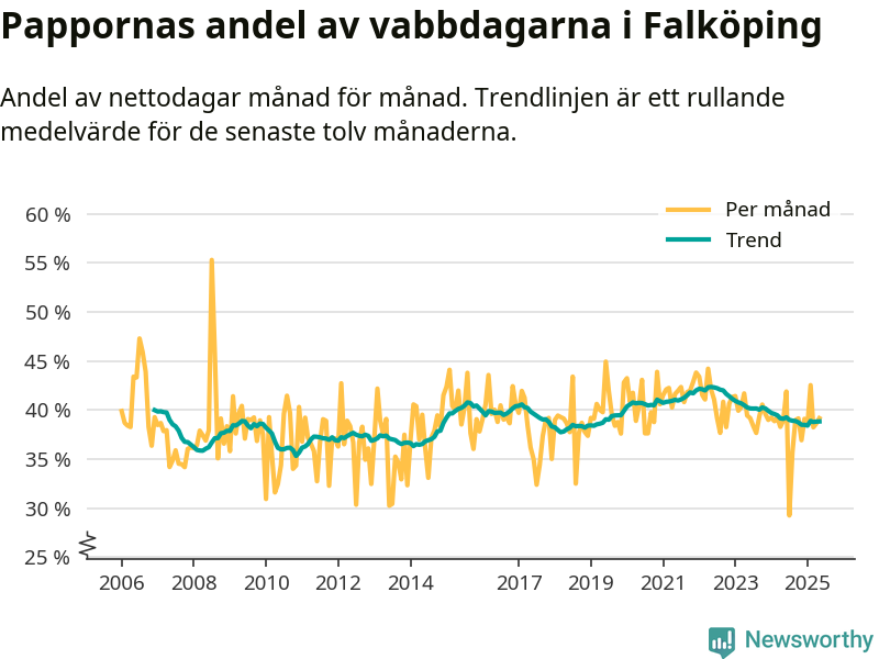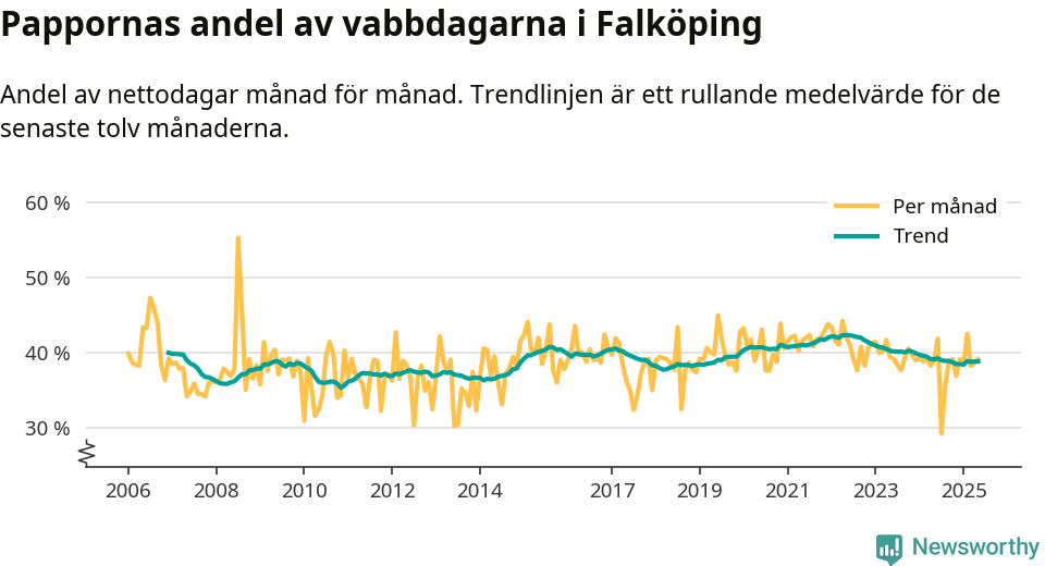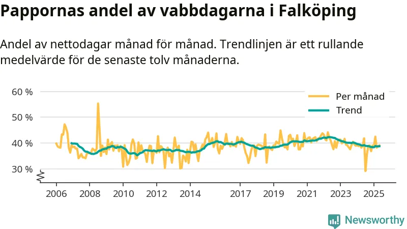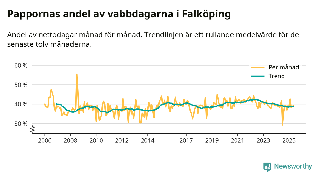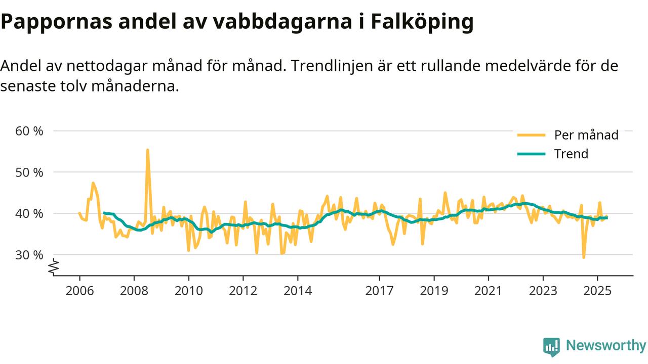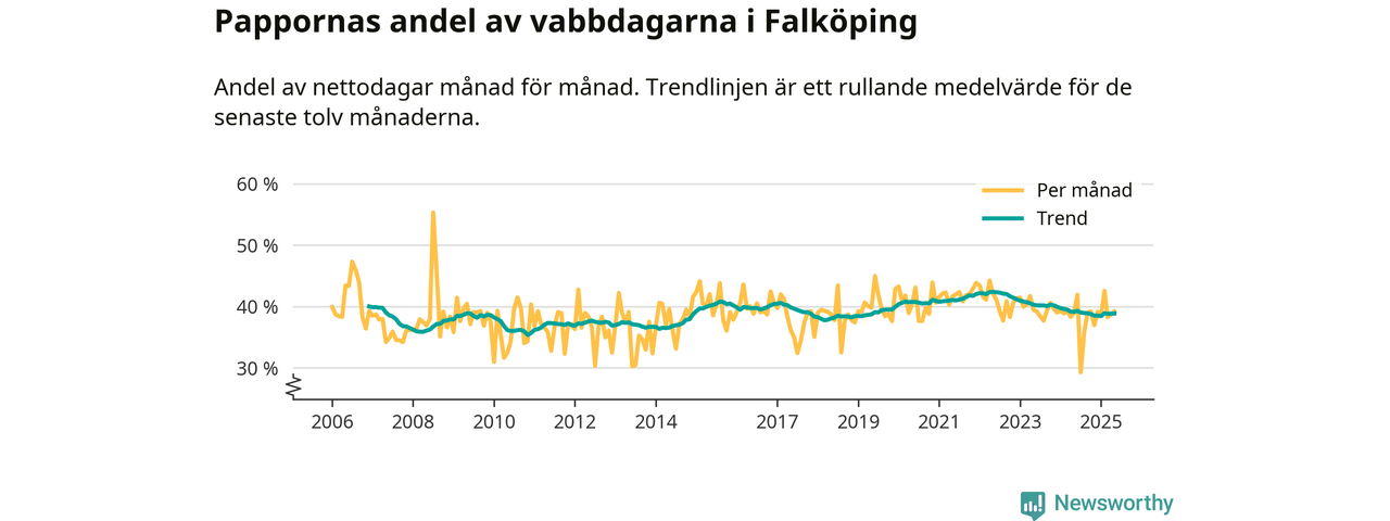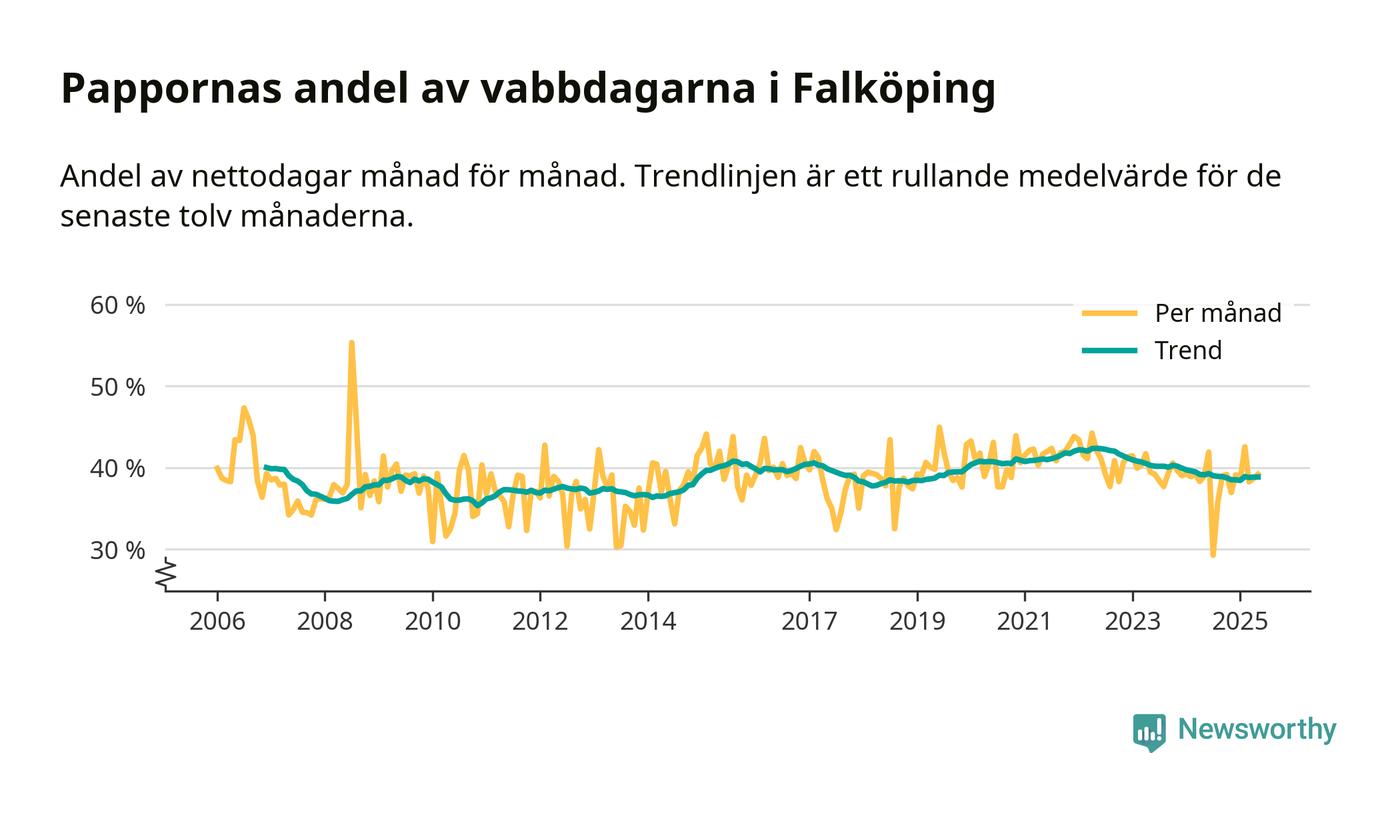 Falköping ligger en bit från ett jämställt uttag. Under de senaste tolv månaderna har männen stått för 39 procent av all vabb i kommunen. Pappornas uttag peakade våren 2022 då kommunens fäder var uppe i 42 procent av vabbdagarna 1.