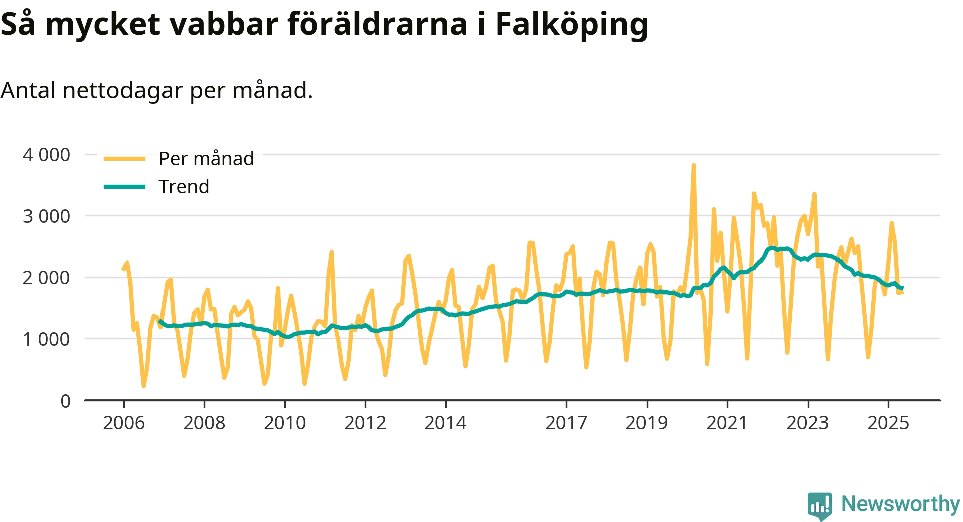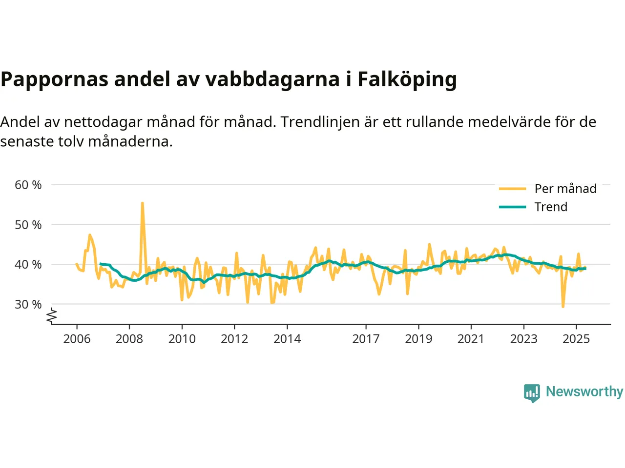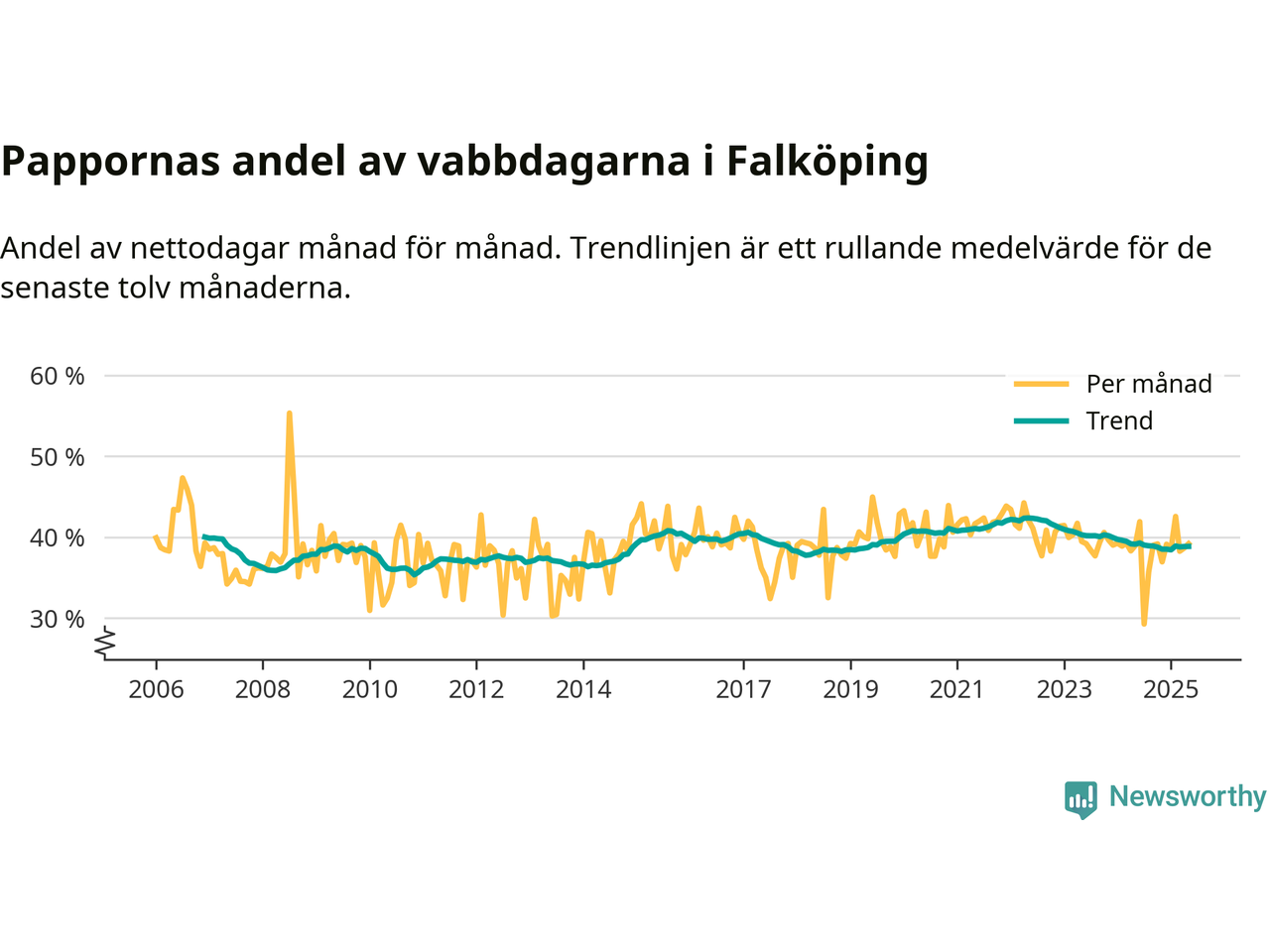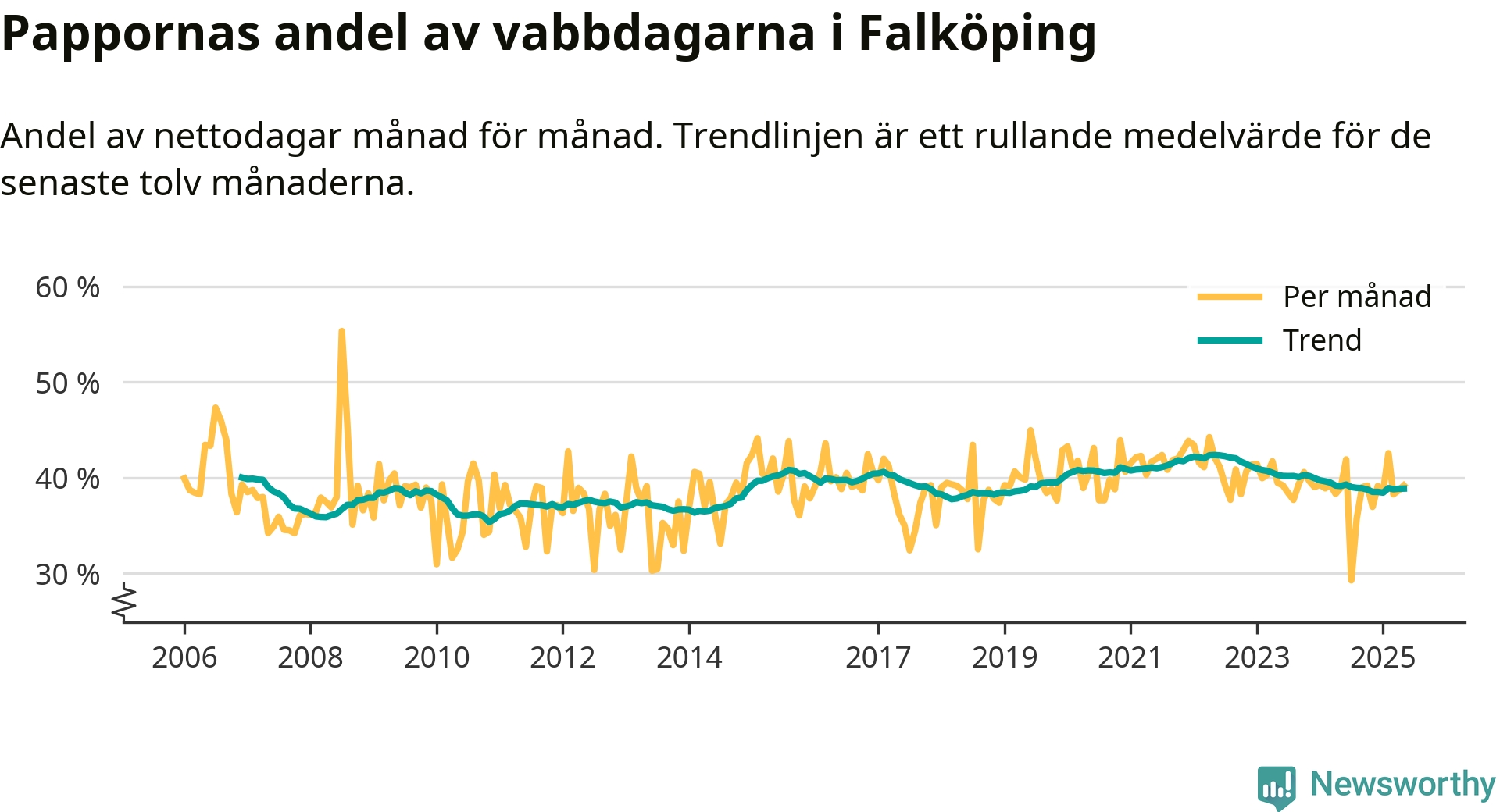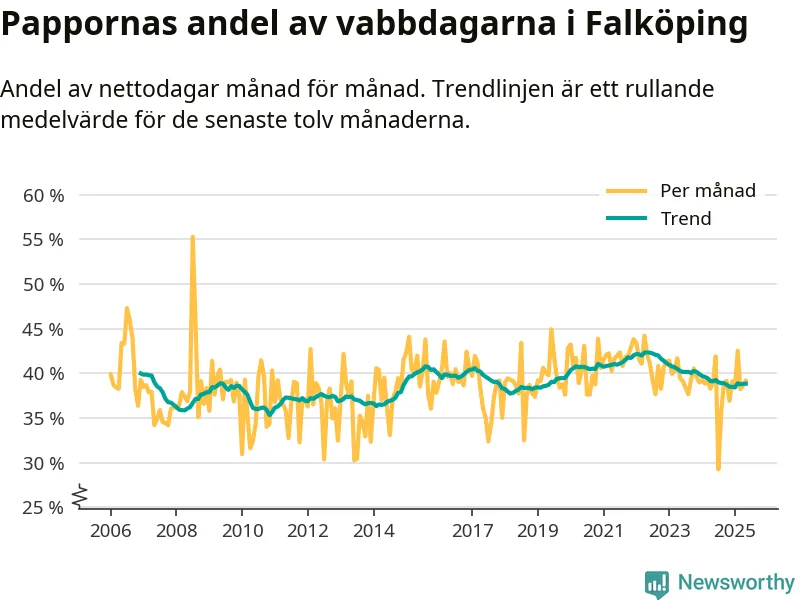 Falköping ligger en bit från ett jämställt uttag. Under de senaste tolv månaderna har männen stått för 39 procent av all vabb i kommunen. Pappornas uttag peakade våren 2022 då kommunens fäder var uppe i 42 procent av vabbdagarna 1.