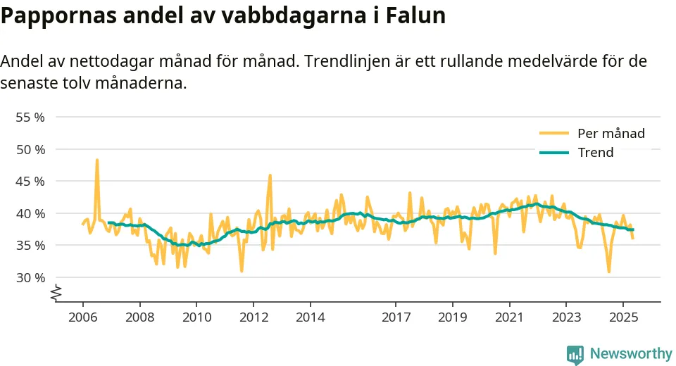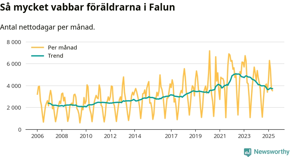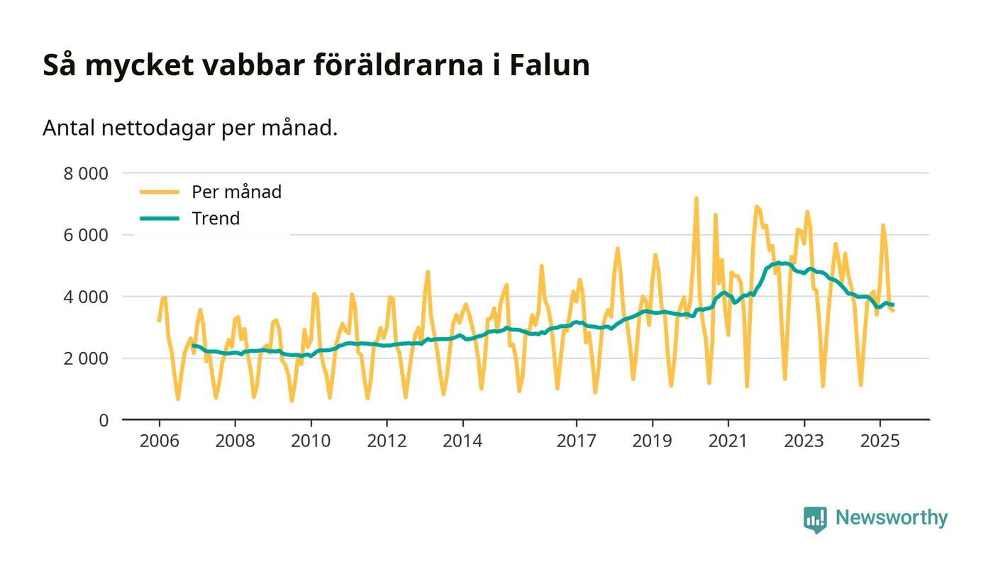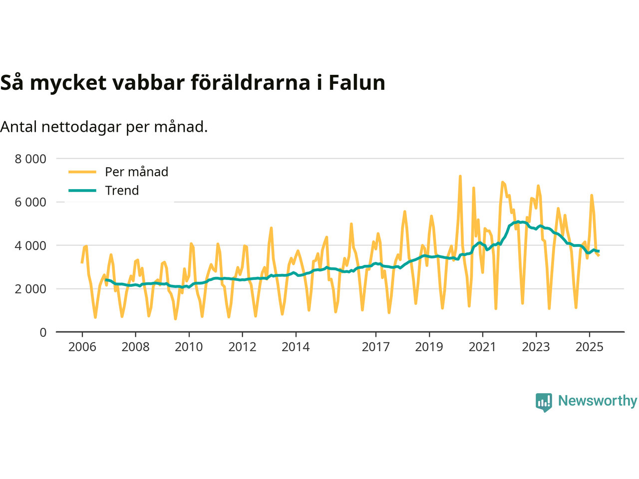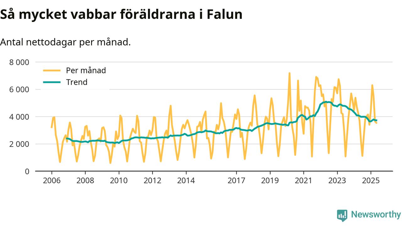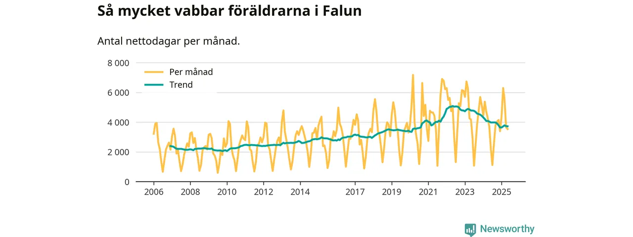 När coronapandemin drog in i mars 2020 peakade antalet vabbdagar både i Falu kommun och i riket som helhet. Under de senaste två åren har vabbuttaget börjat minska igen.