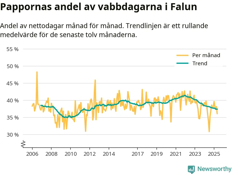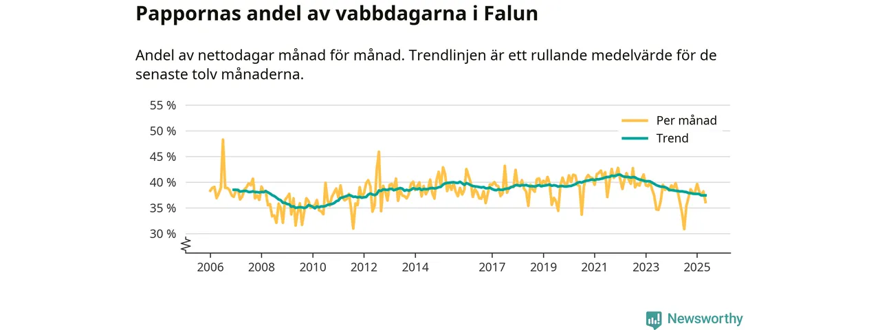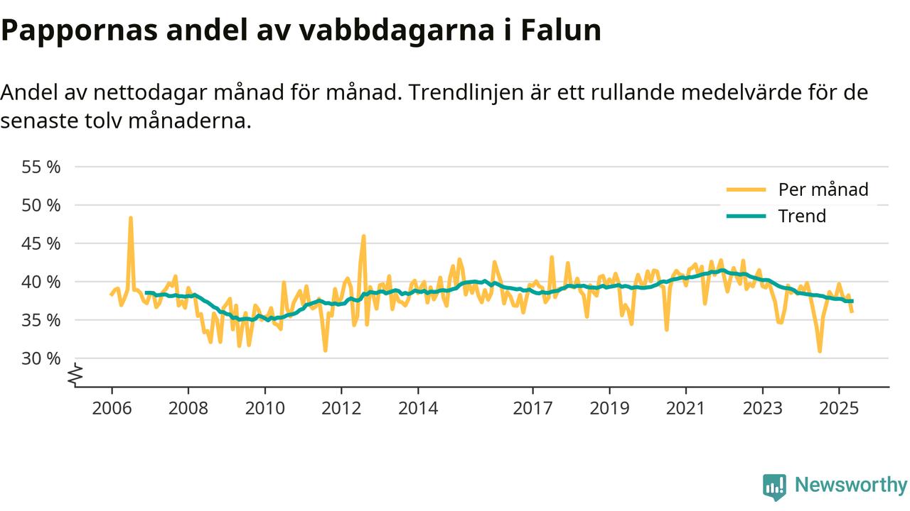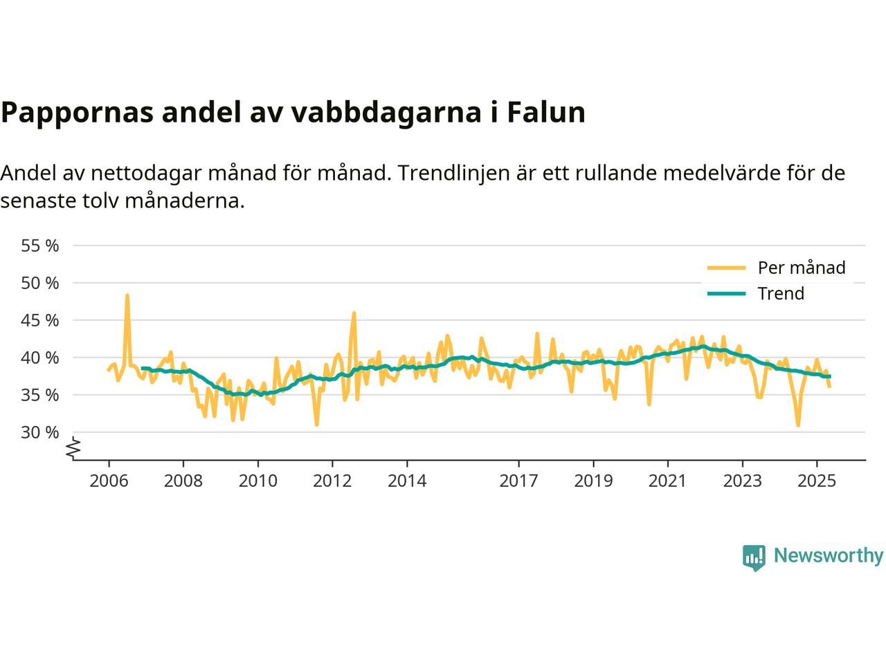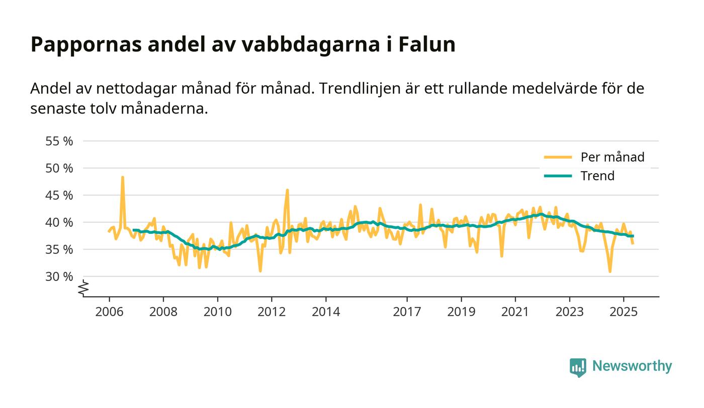 Falun ligger en bit från ett jämställt uttag. Under de senaste tolv månaderna har männen stått för 37 procent av all vabb i kommunen. I år har andelen varit lägre än på över 13 år.