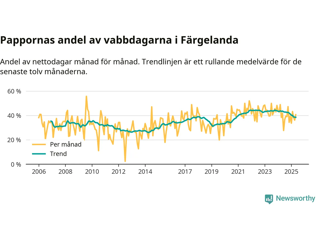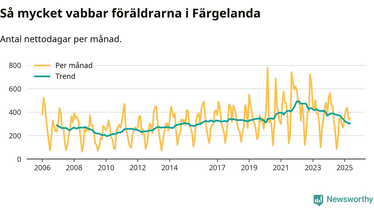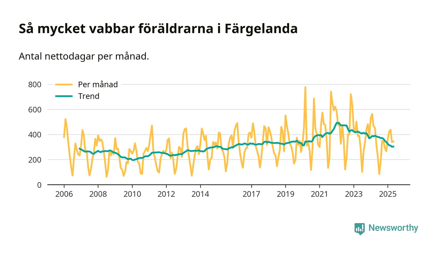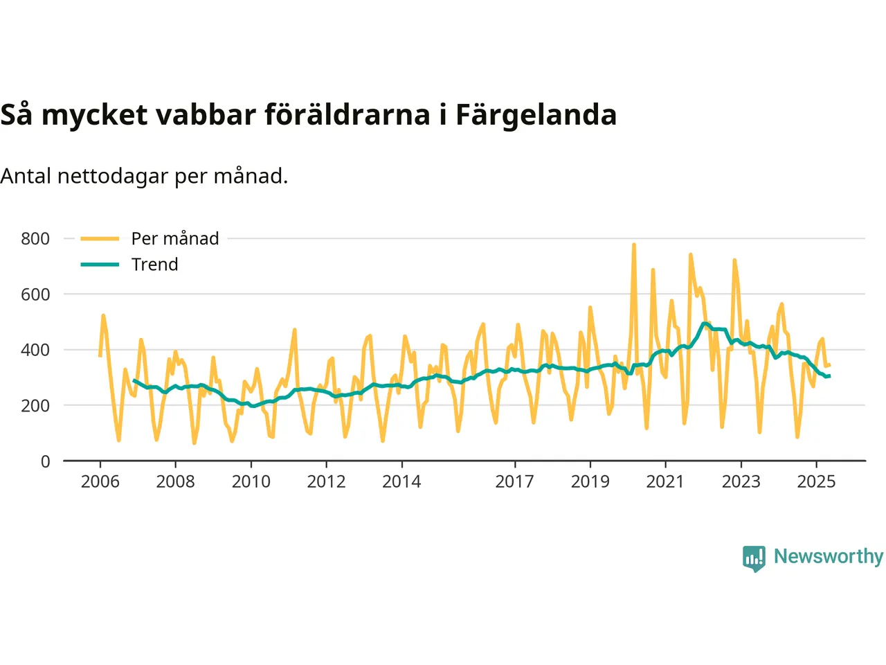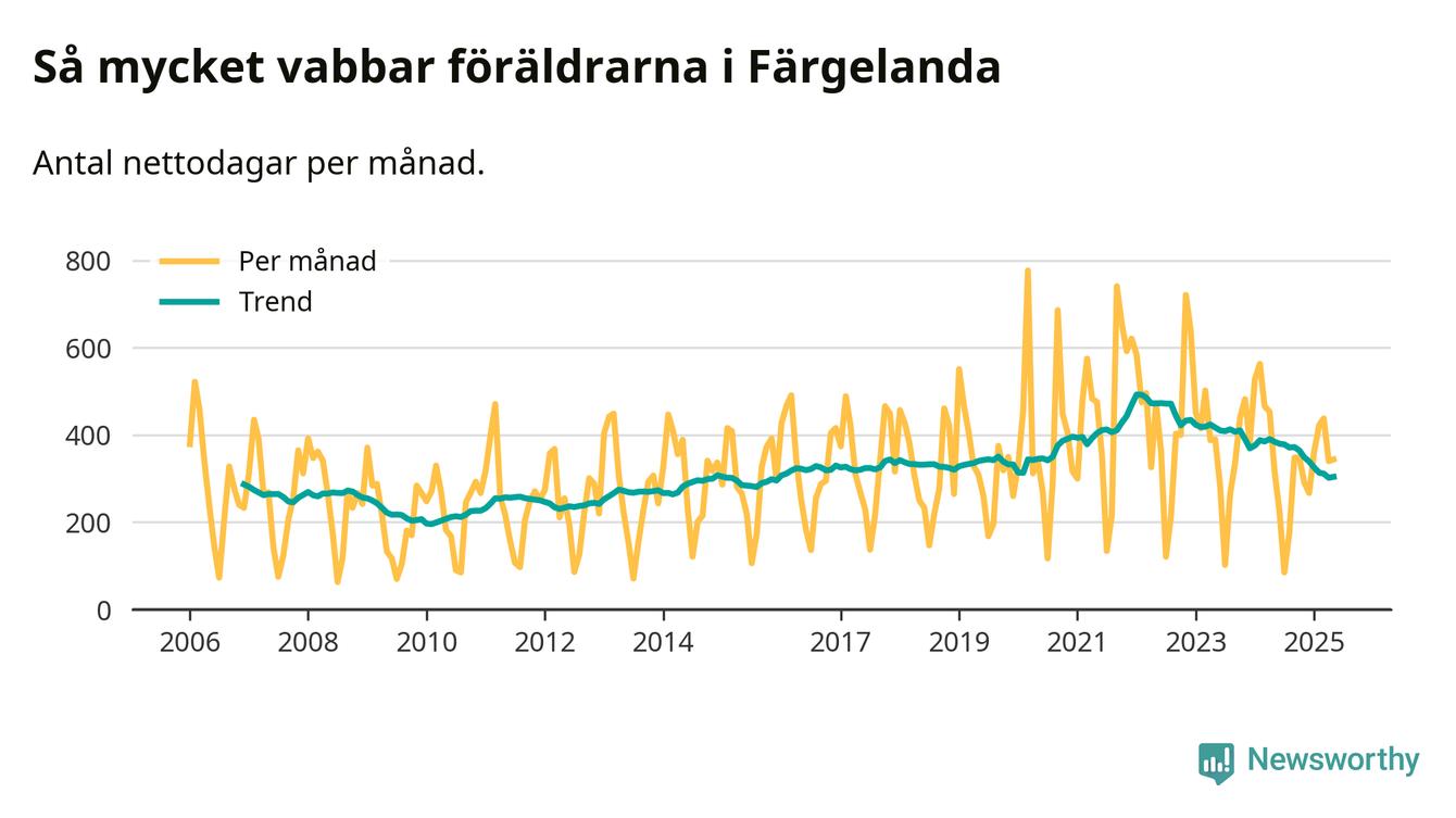 När coronapandemin drog in i mars 2020 peakade antalet vabbdagar både i Färgelanda kommun och i riket som helhet. Under de senaste två åren har vabbuttaget börjat minska igen.