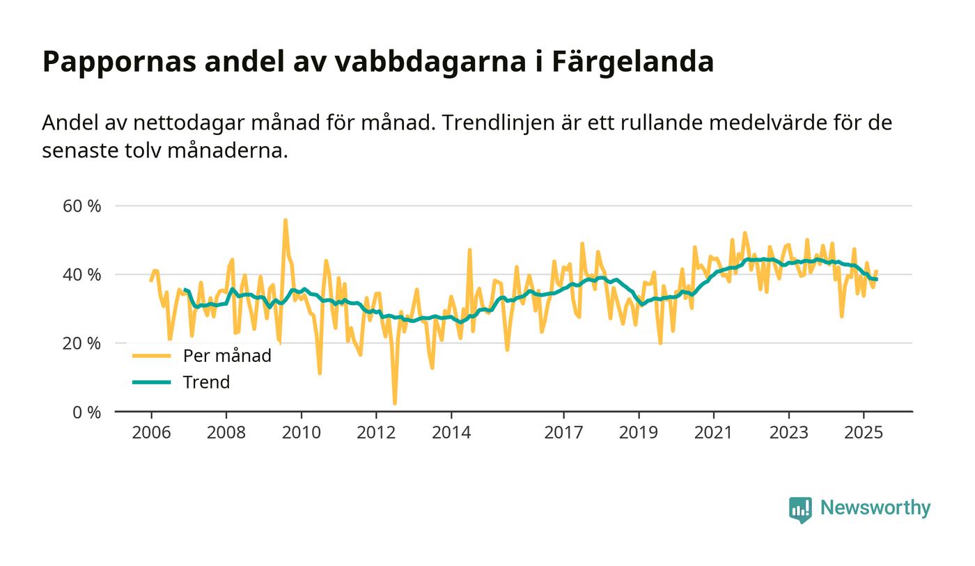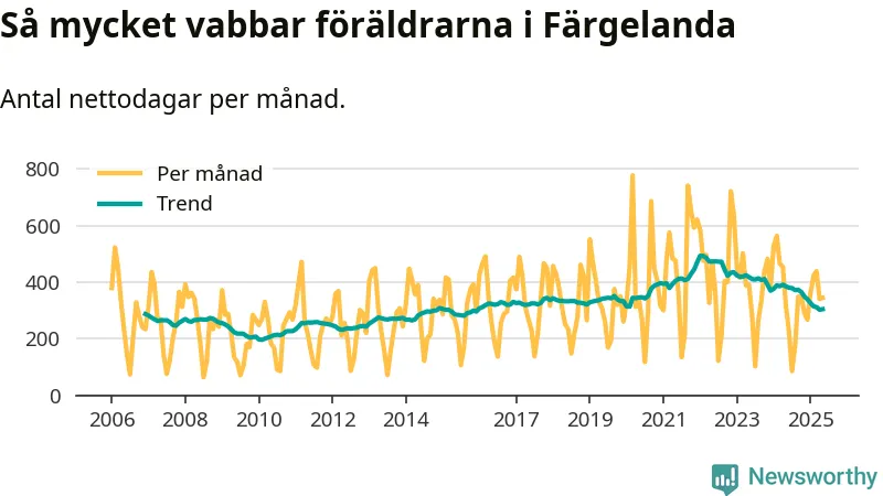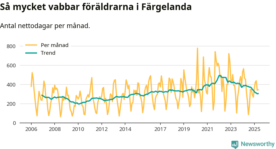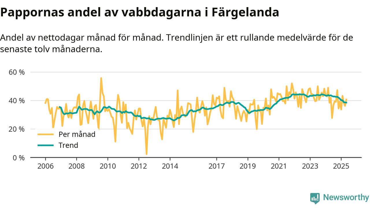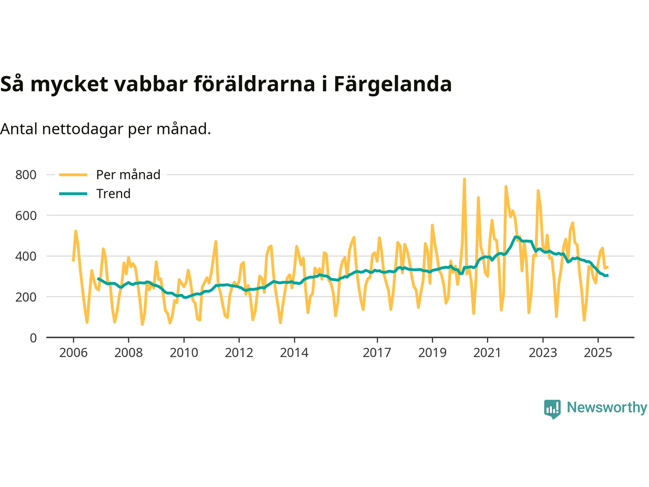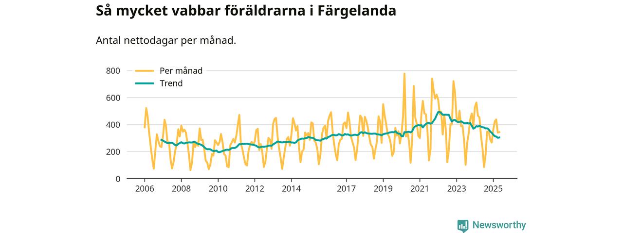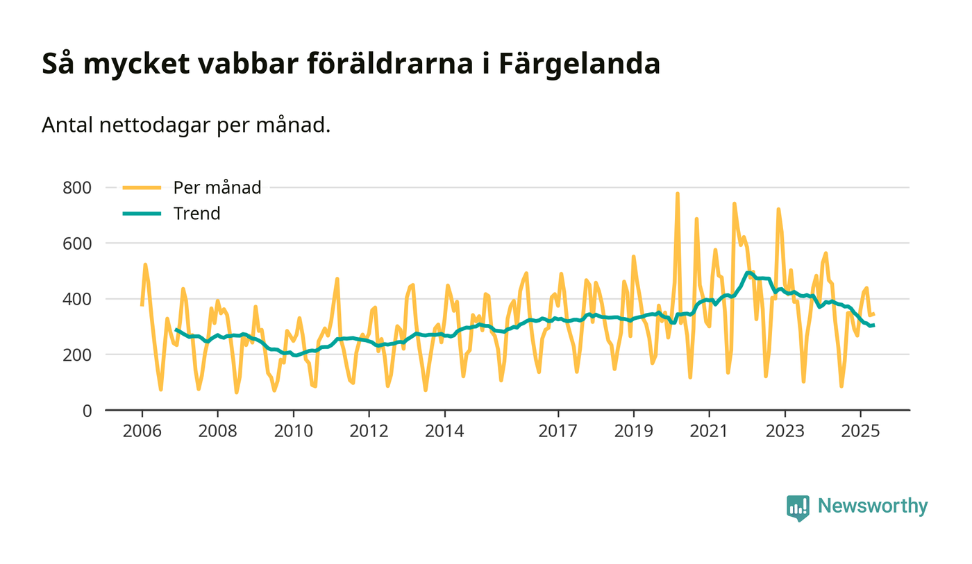 När coronapandemin drog in i mars 2020 peakade antalet vabbdagar både i Färgelanda kommun och i riket som helhet. Under de senaste två åren har vabbuttaget börjat minska igen.