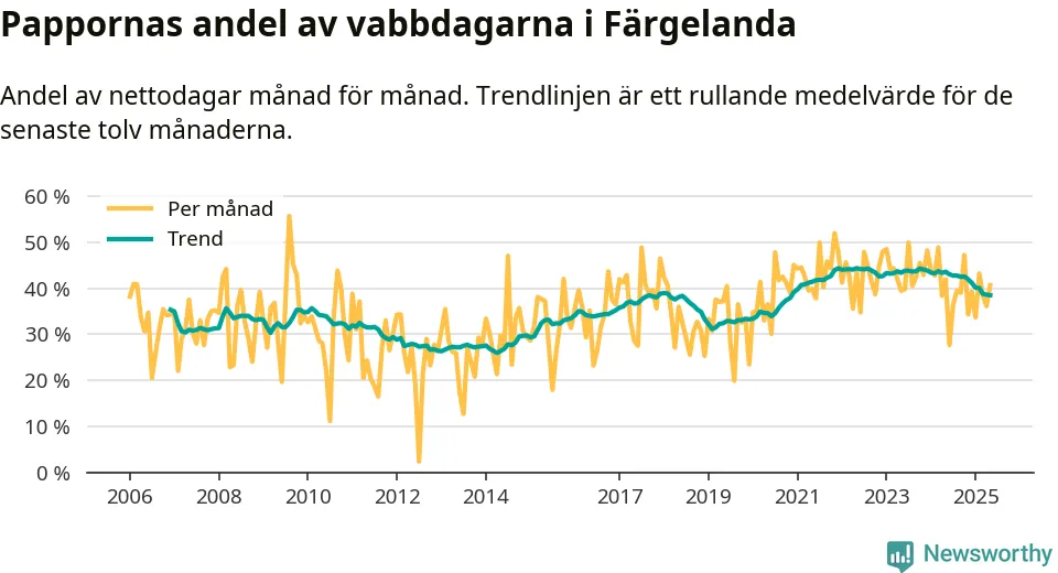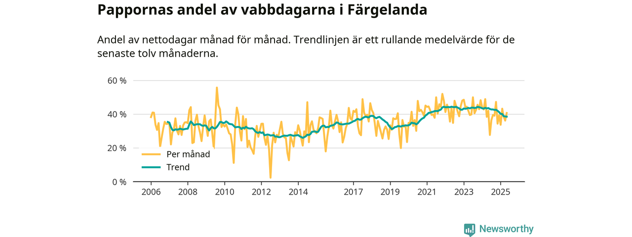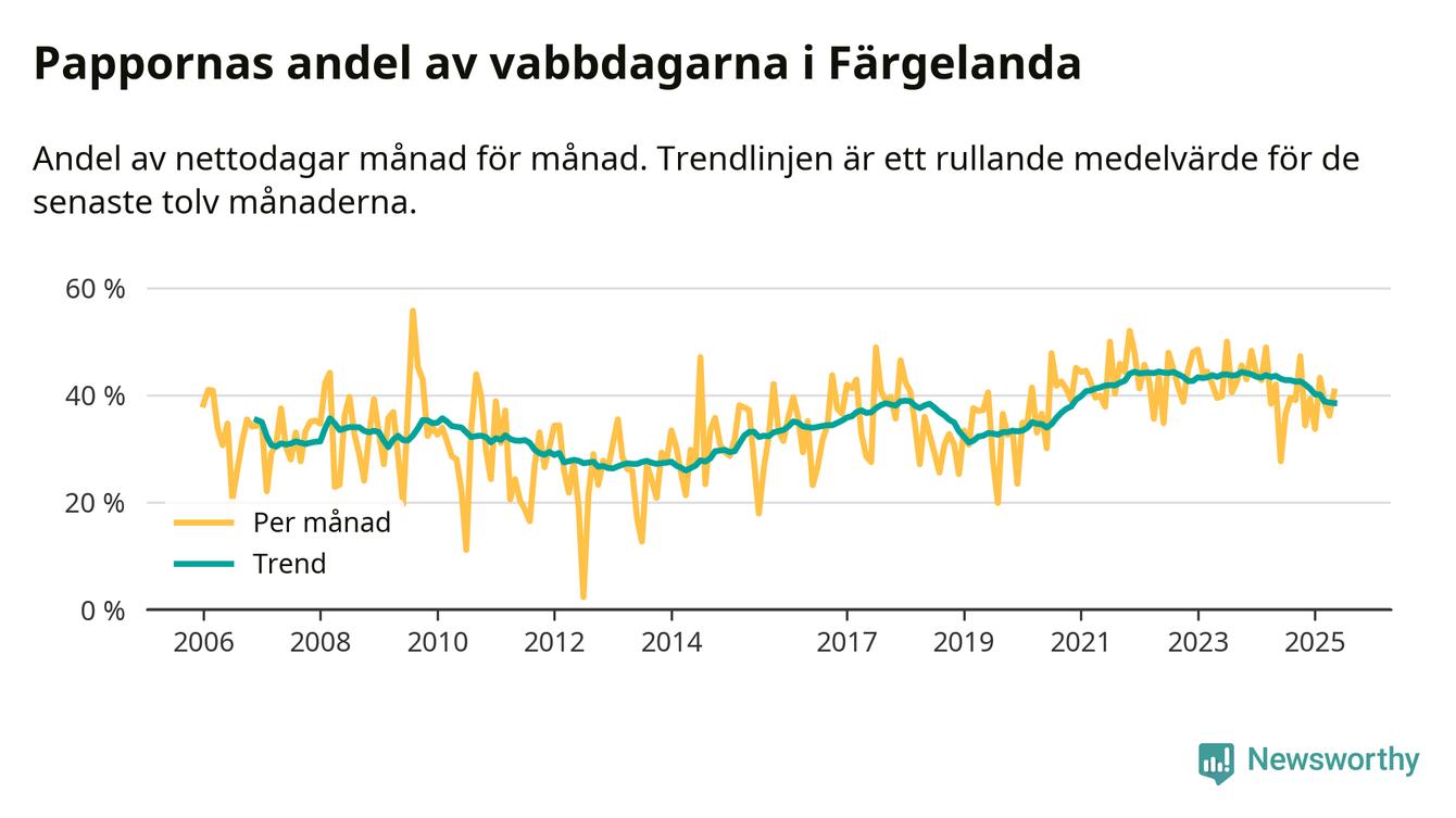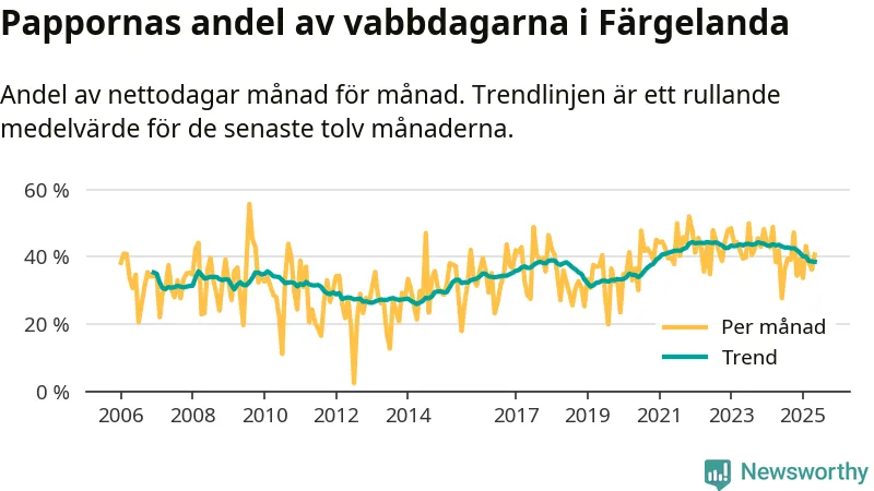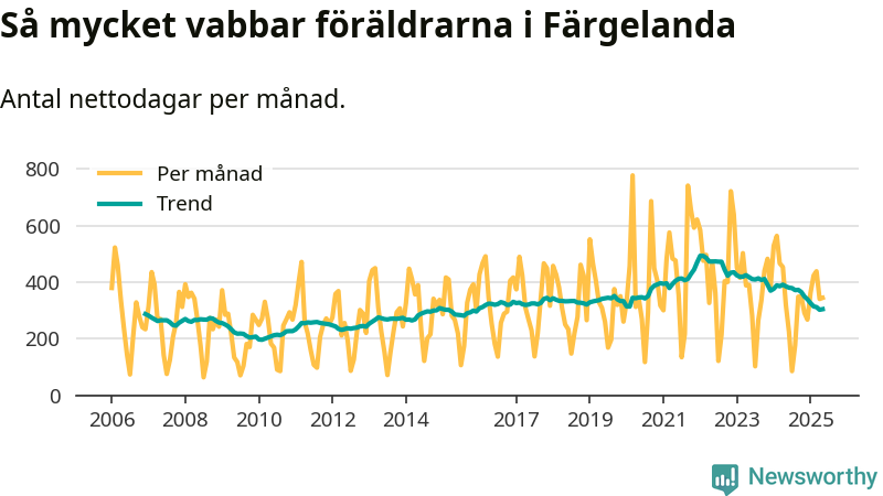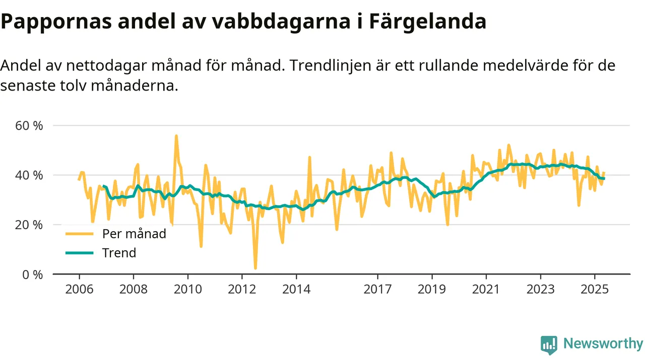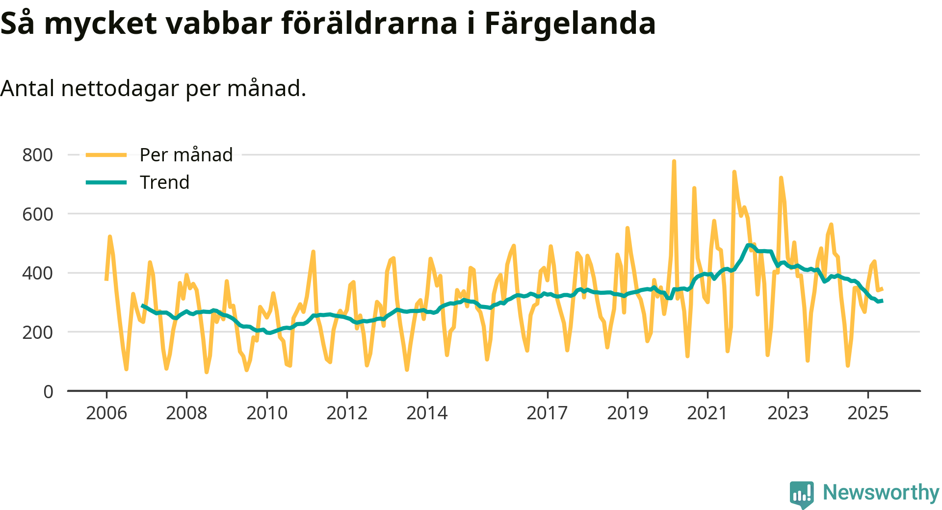 När coronapandemin drog in i mars 2020 peakade antalet vabbdagar både i Färgelanda kommun och i riket som helhet. Under de senaste två åren har vabbuttaget börjat minska igen.
