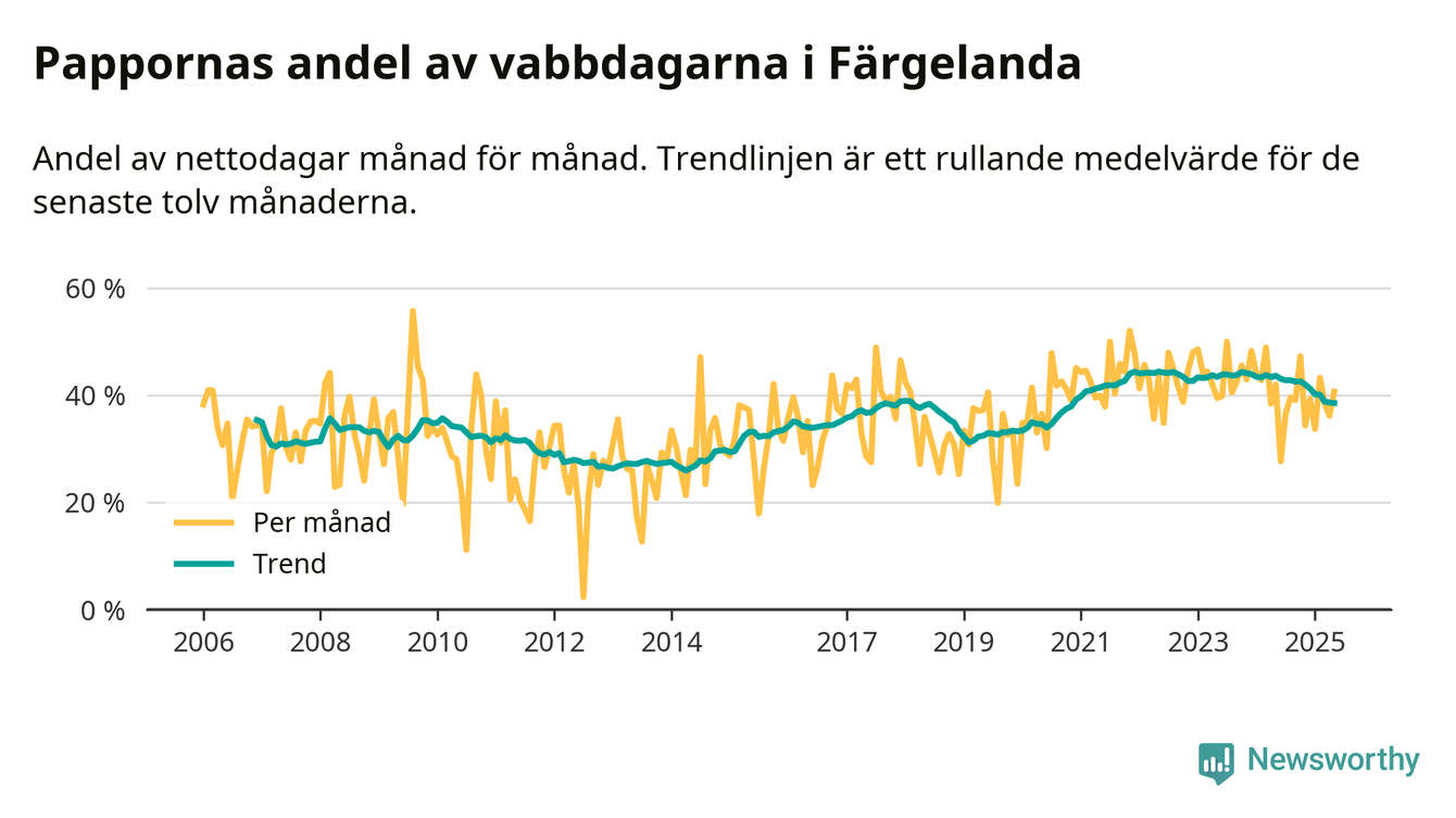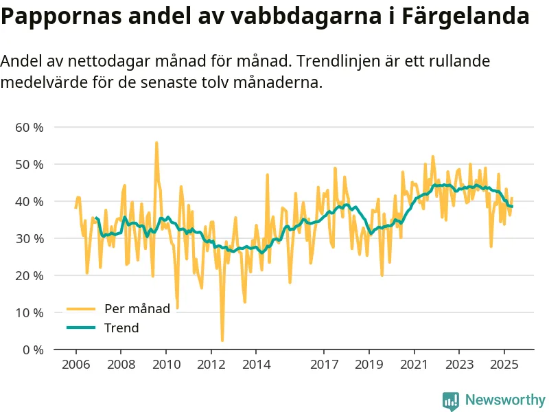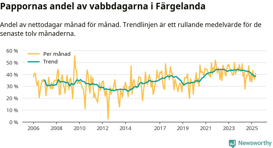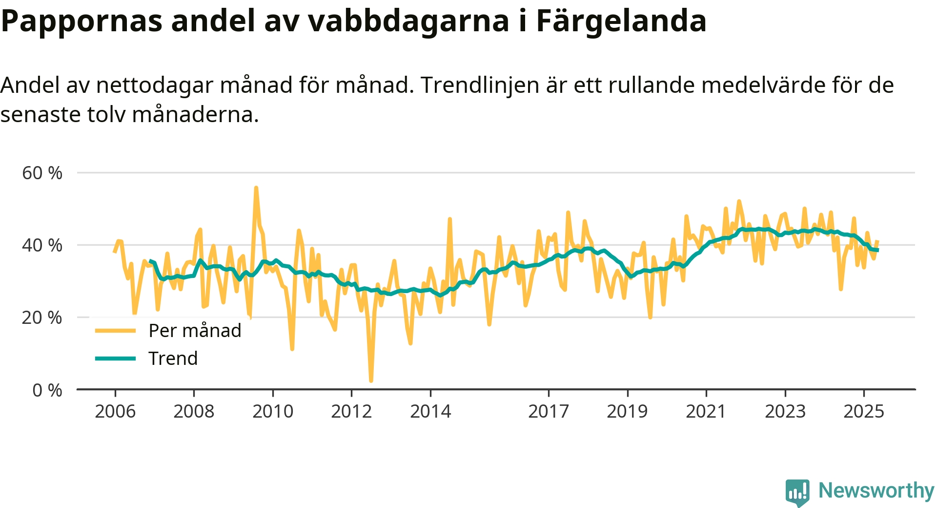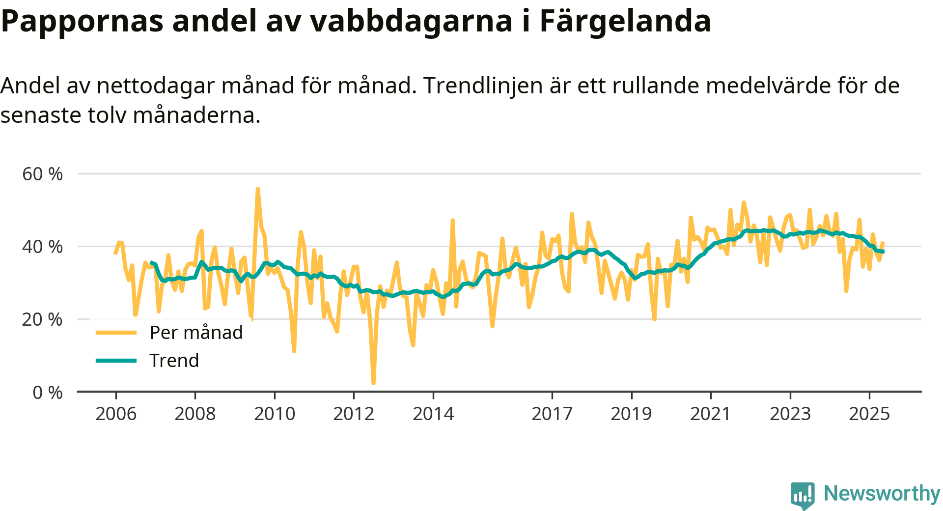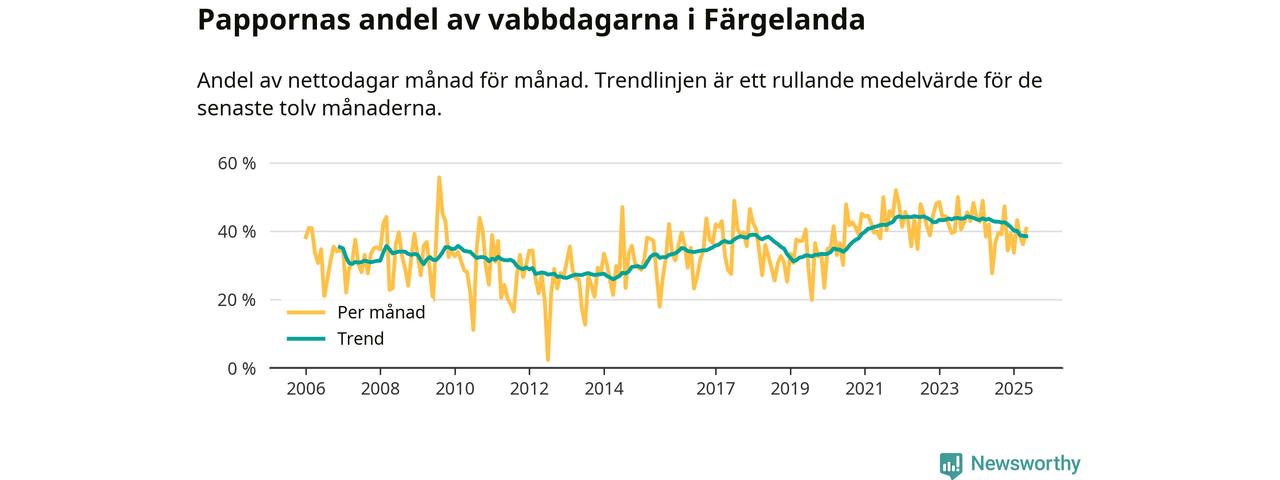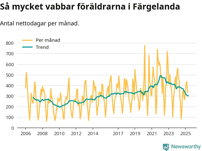 När coronapandemin drog in i mars 2020 peakade antalet vabbdagar både i Färgelanda kommun och i riket som helhet. Under de senaste två åren har vabbuttaget börjat minska igen.