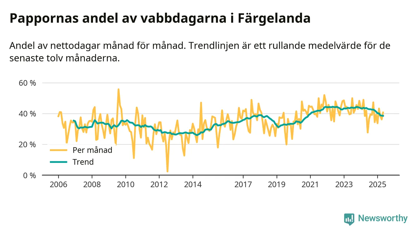 Färgelanda ligger en bit från ett jämställt uttag. Under de senaste tolv månaderna har männen stått för 39 procent av all vabb i kommunen. Det är en lägre andel än på över fyra år.
