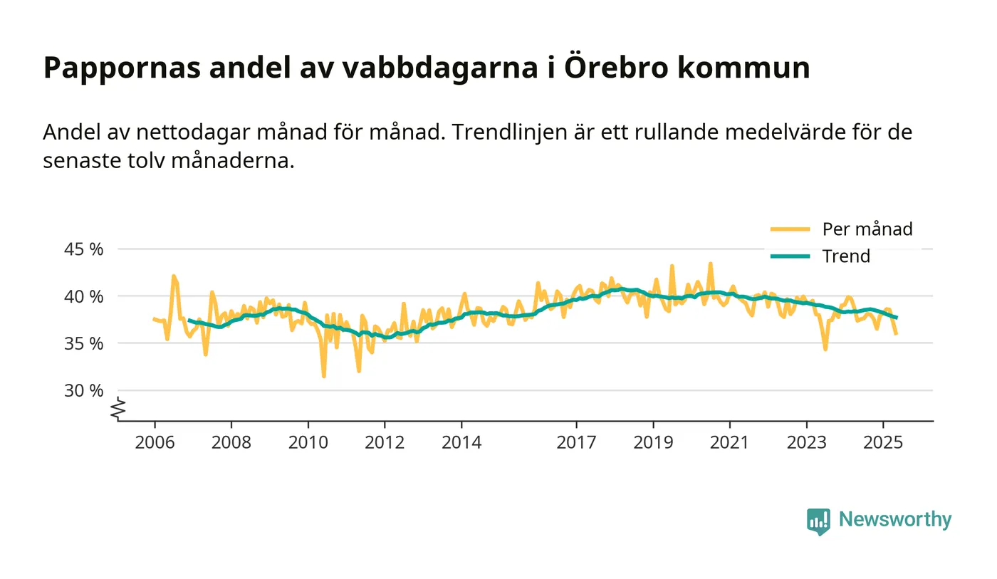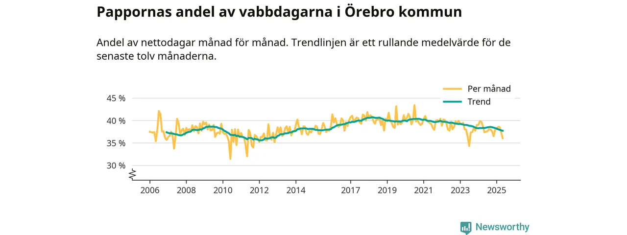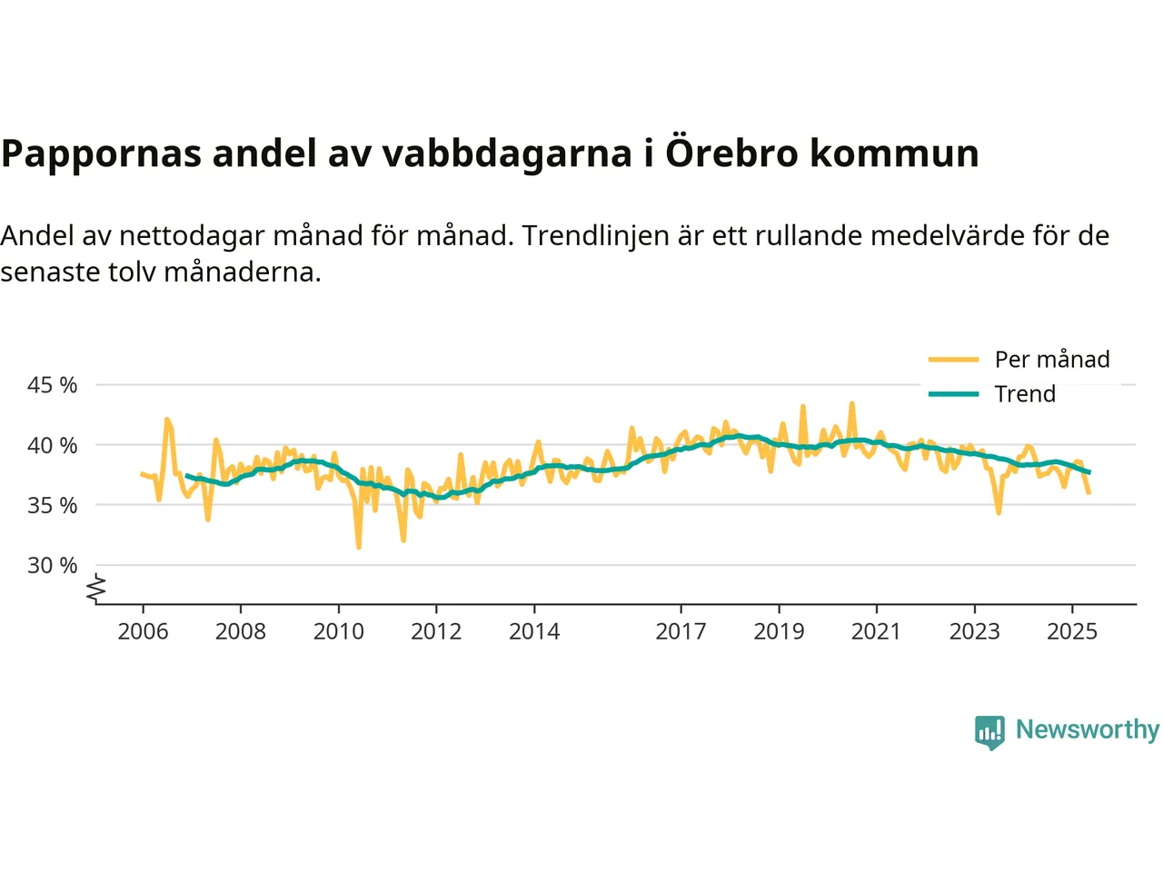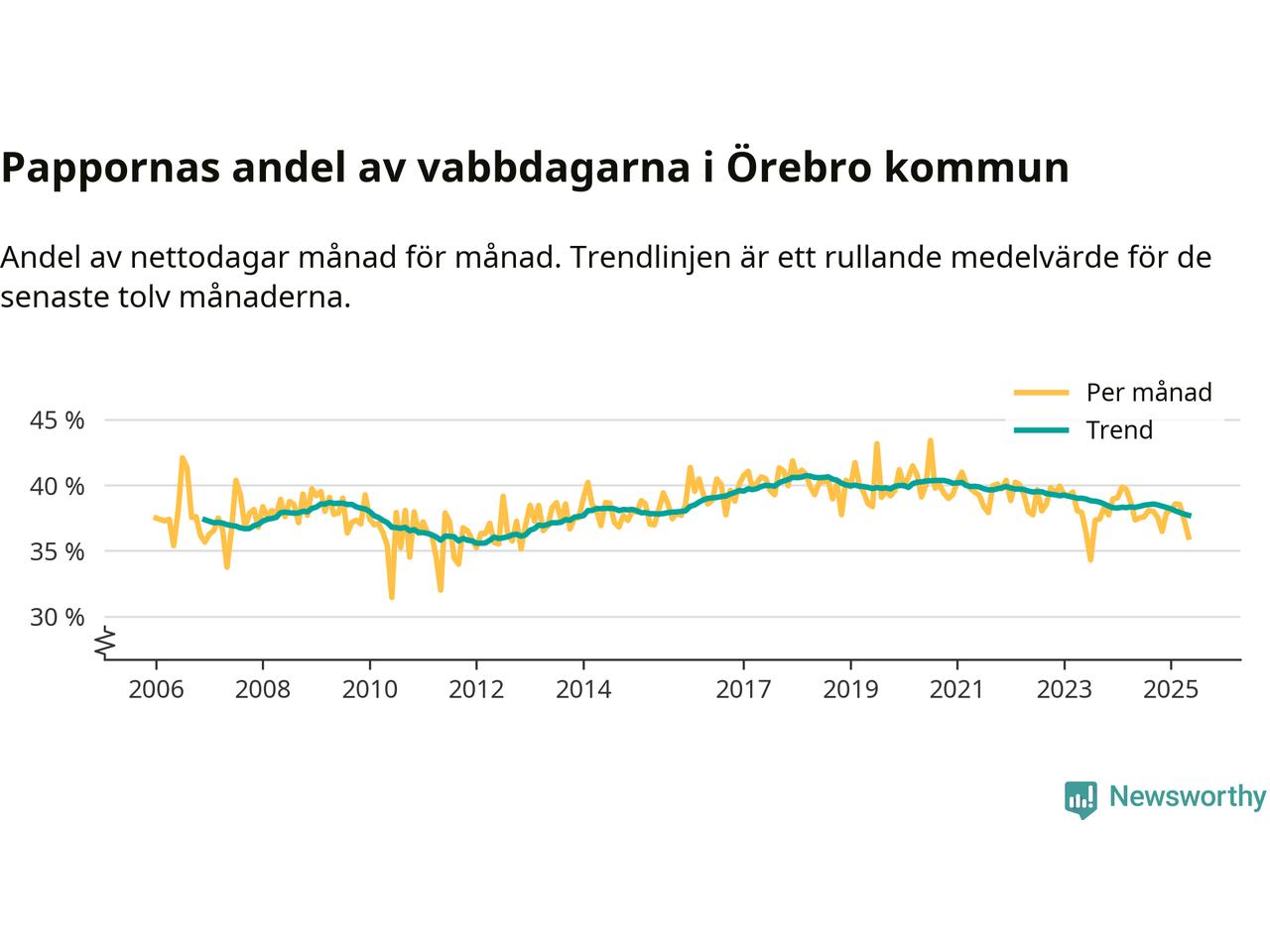 Örebro ligger en bit från ett jämställt uttag. Under de senaste tolv månaderna har männen stått för 38 procent av all vabb i kommunen. Det är en lägre andel än på över elva år.