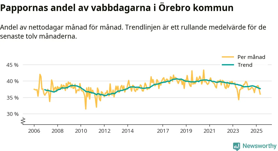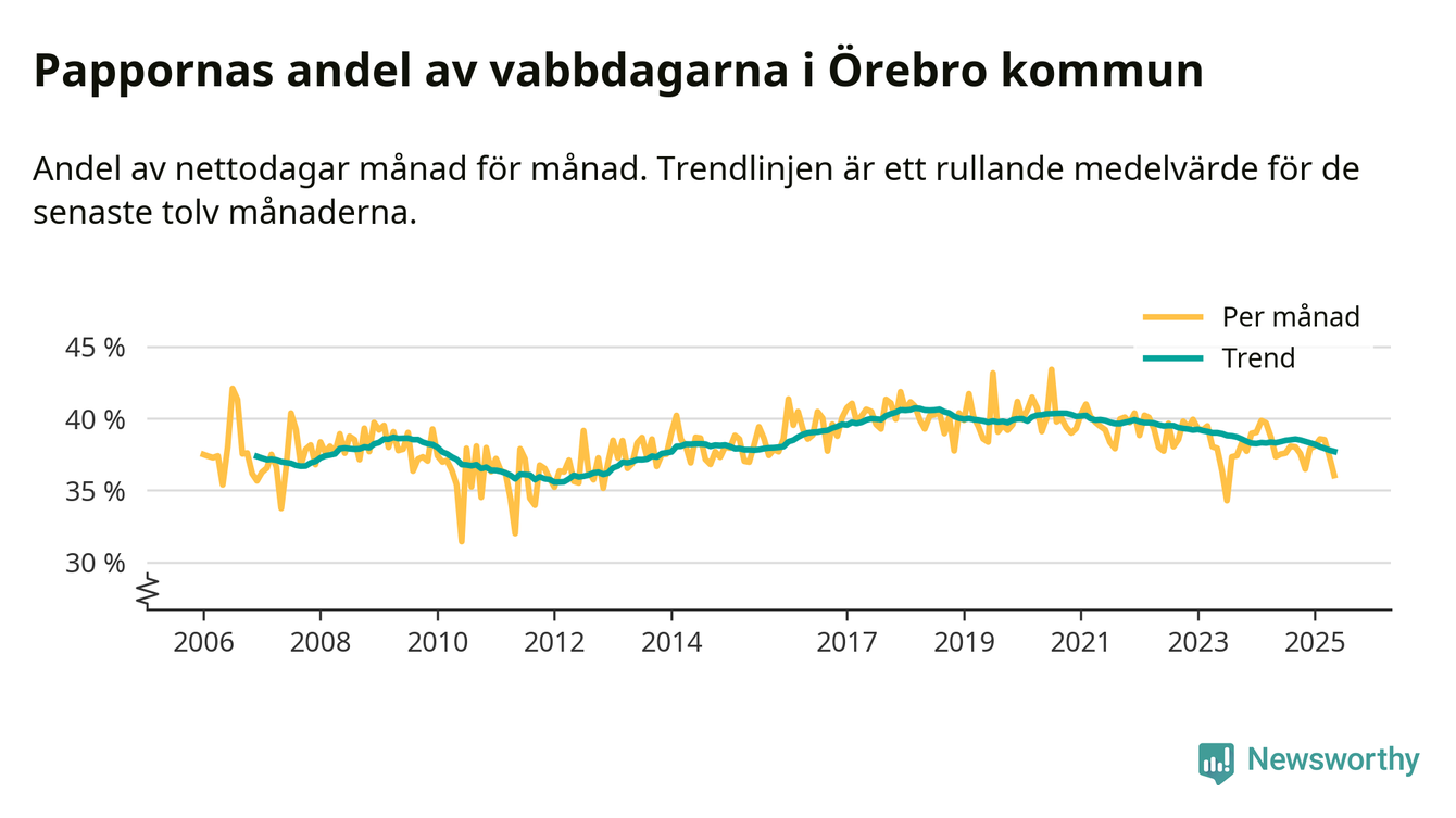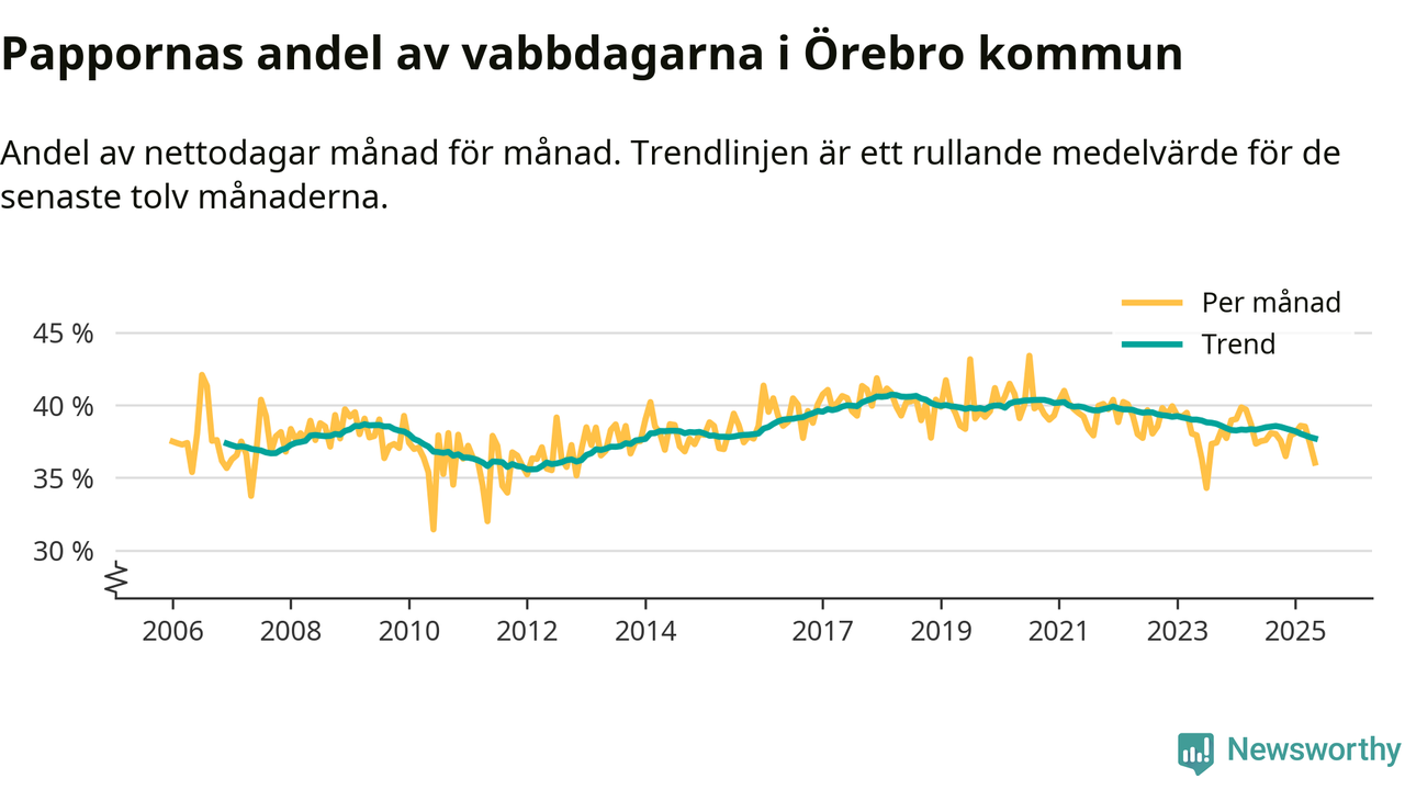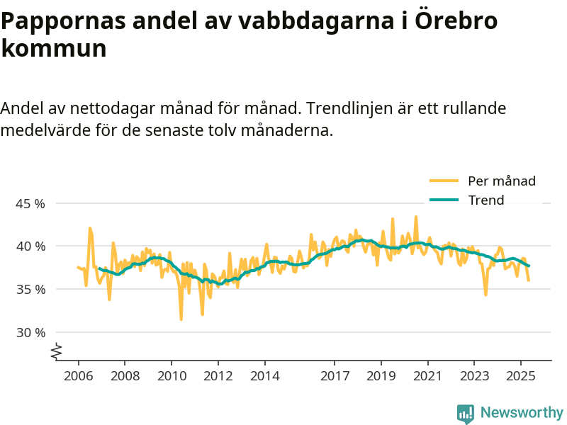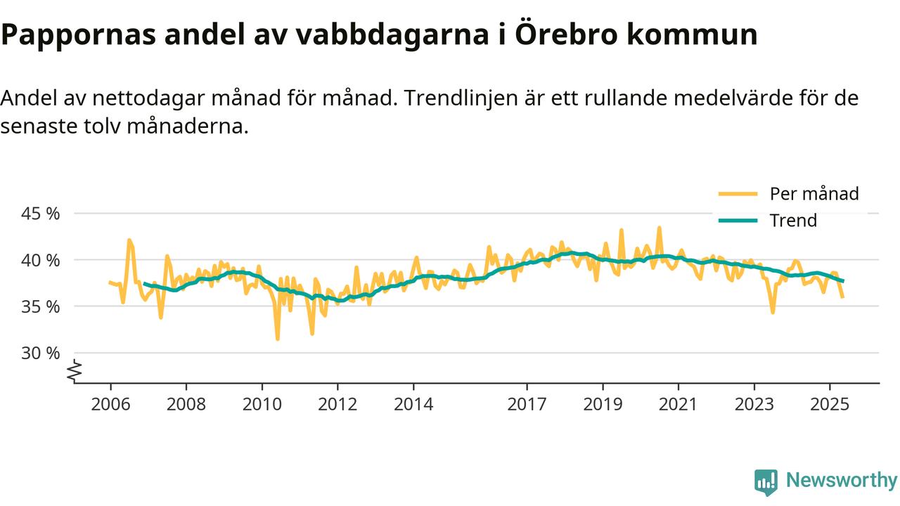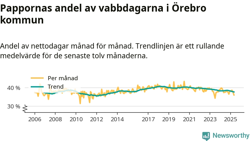 Örebro ligger en bit från ett jämställt uttag. Under de senaste tolv månaderna har männen stått för 38 procent av all vabb i kommunen. Det är en lägre andel än på över elva år.