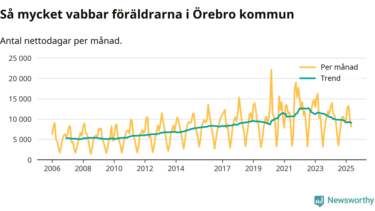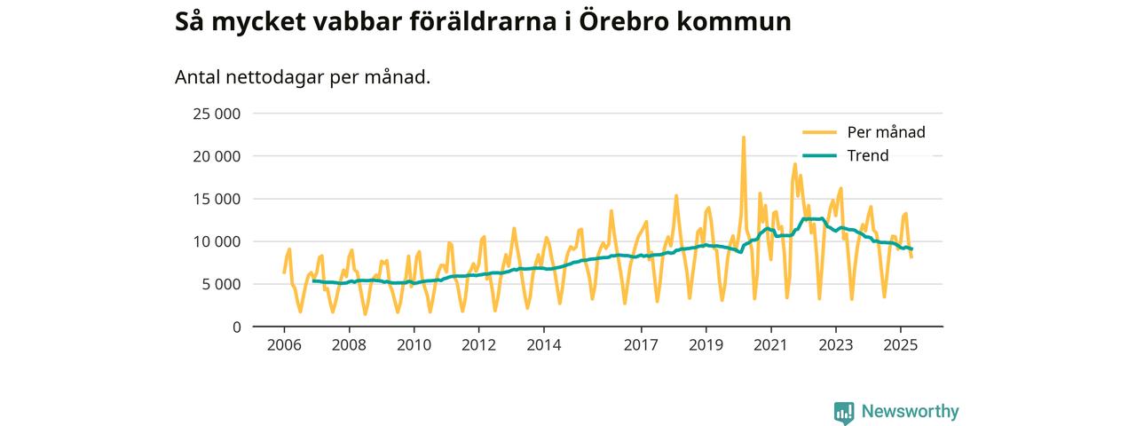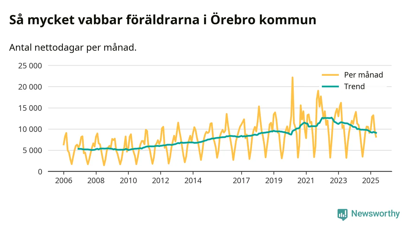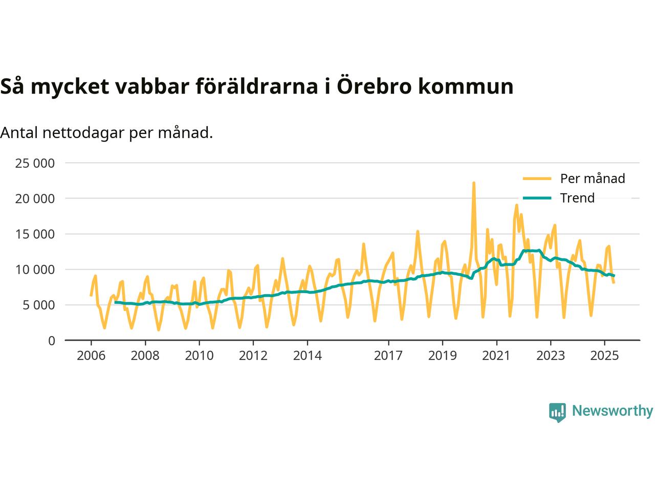 När coronapandemin drog in i mars 2020 peakade antalet vabbdagar både i Örebro kommun och i riket som helhet. Under de senaste två åren har vabbuttaget börjat minska igen.