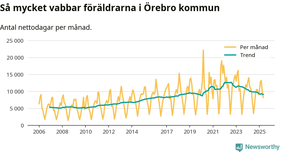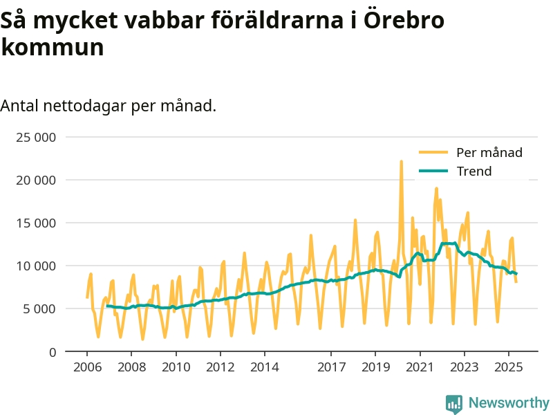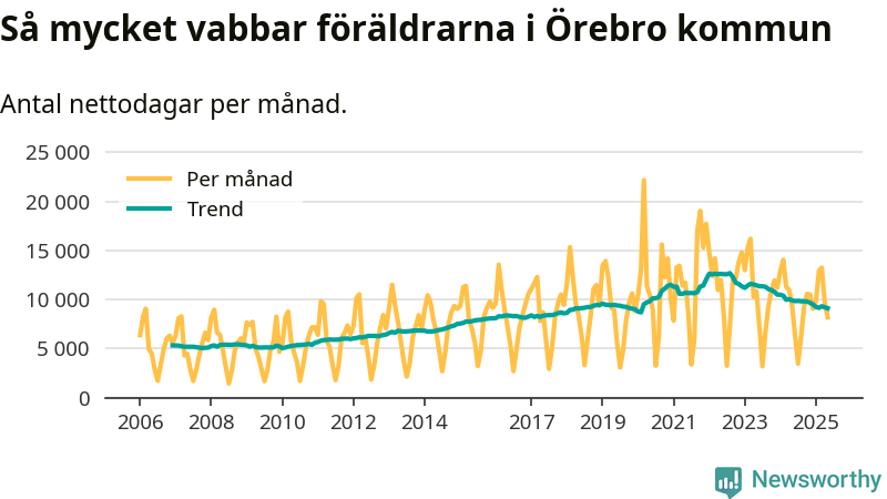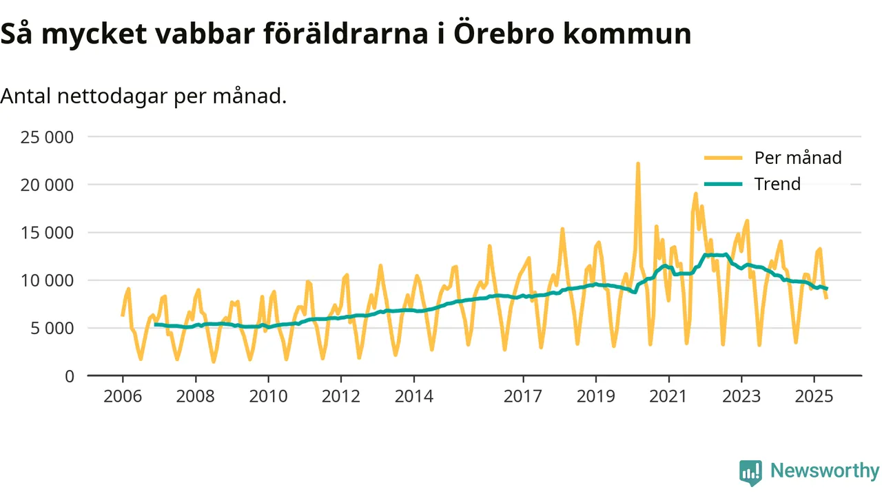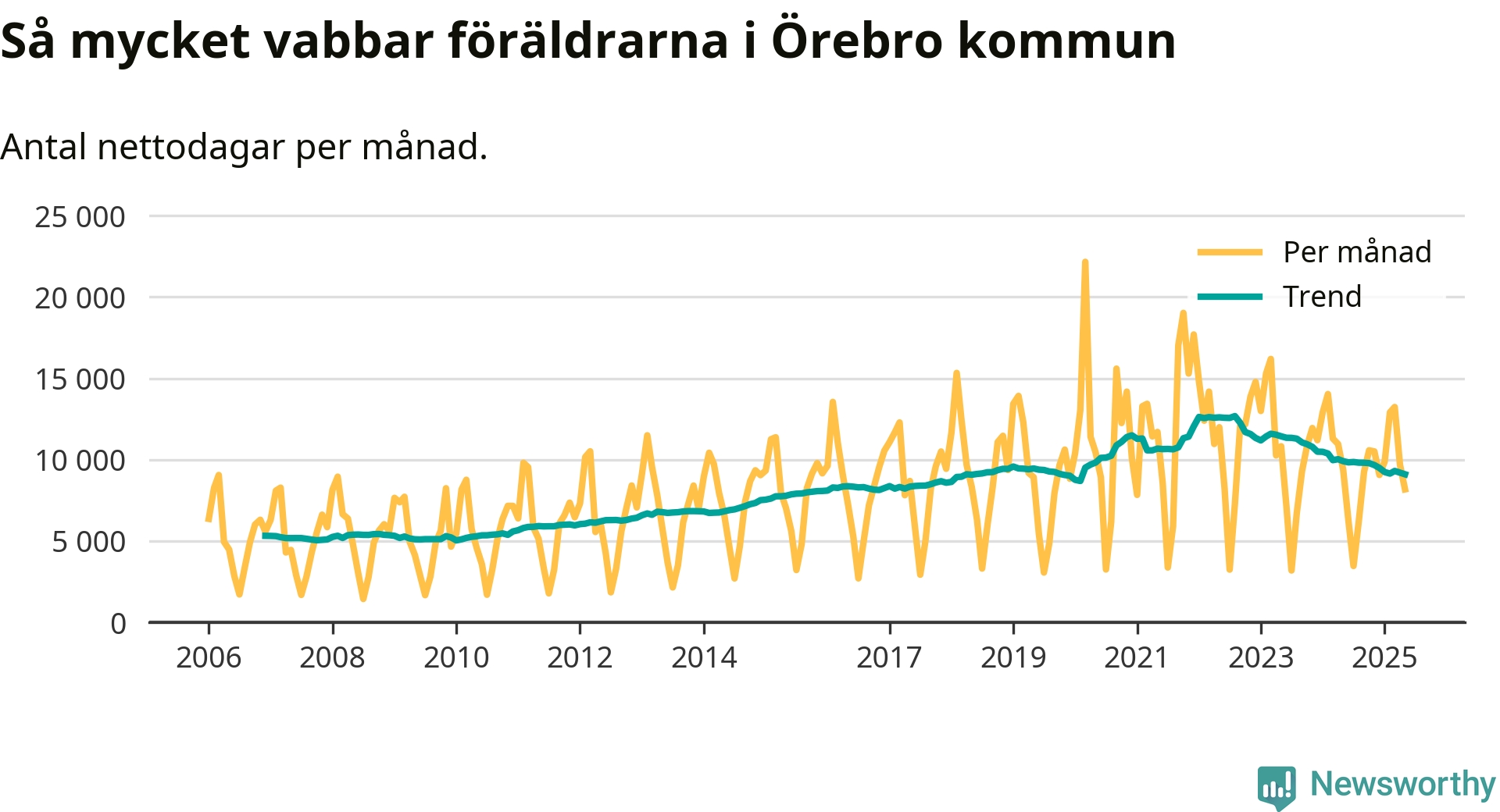När coronapandemin drog in i mars 2020 peakade antalet vabbdagar både i Örebro kommun och i riket som helhet. Under de senaste två åren har vabbuttaget börjat minska igen.