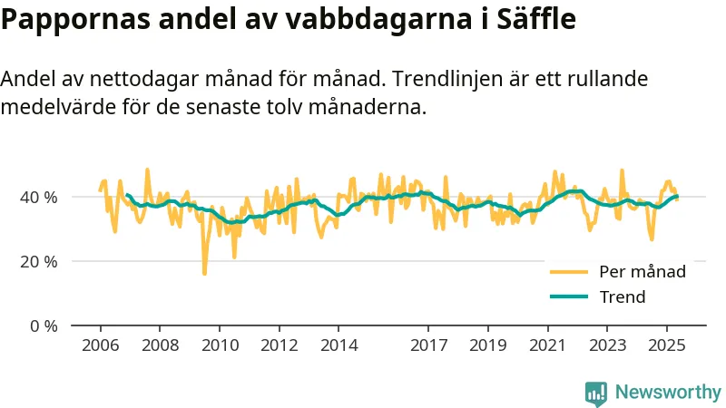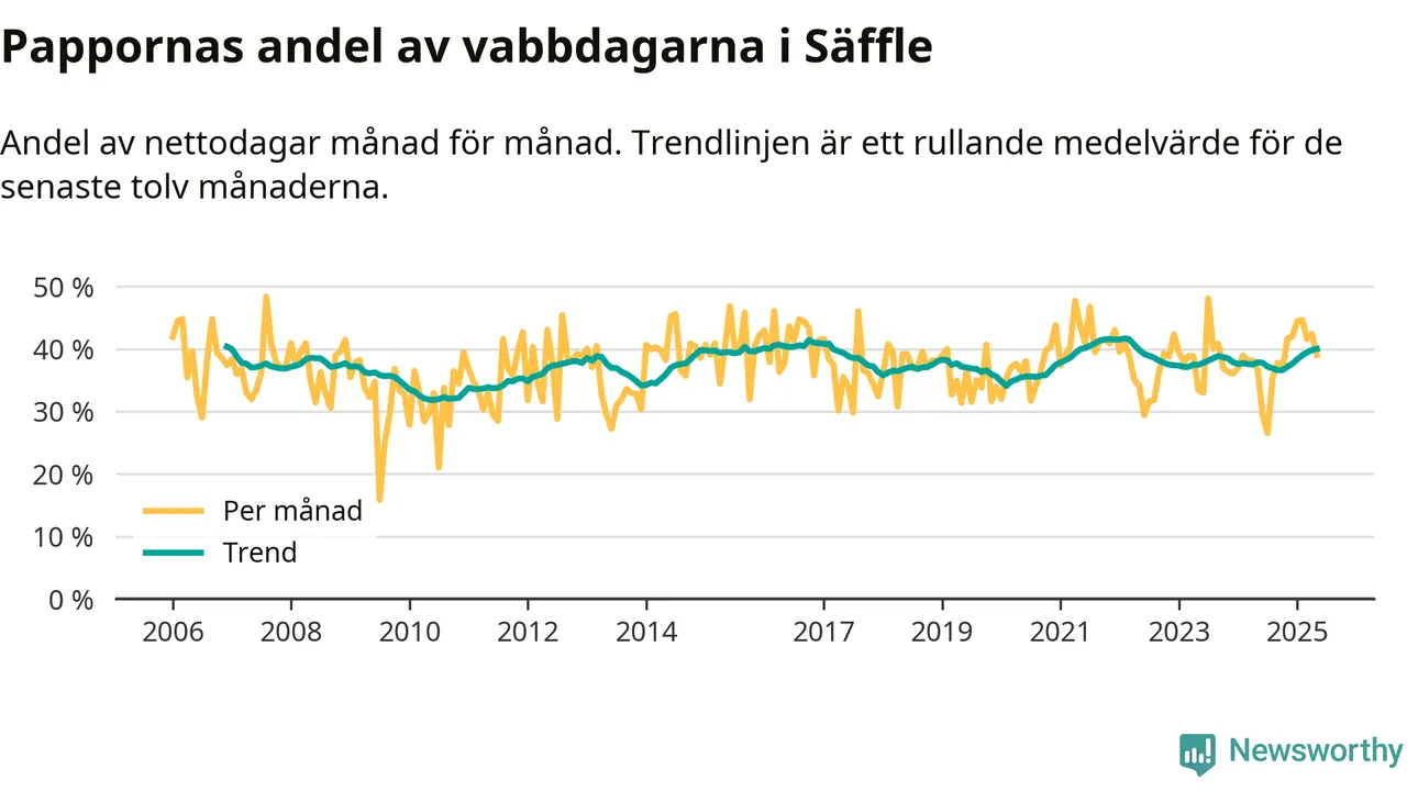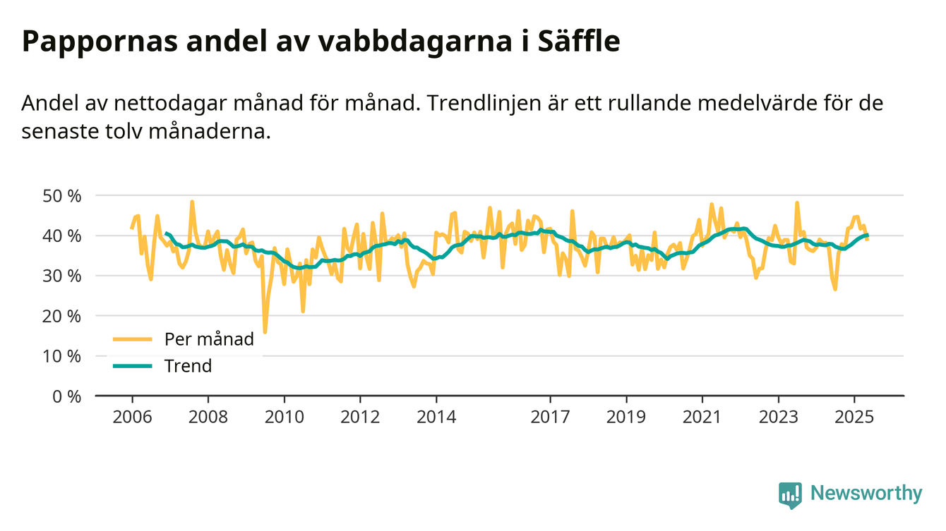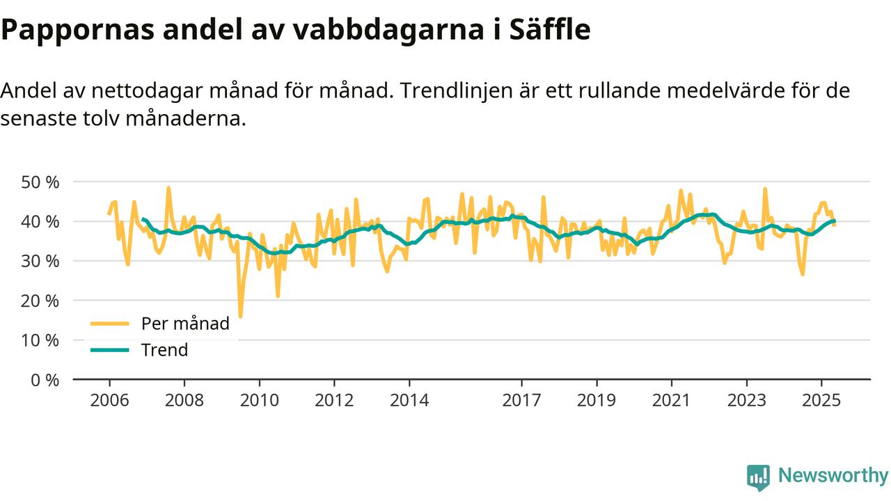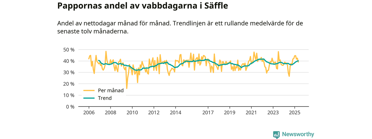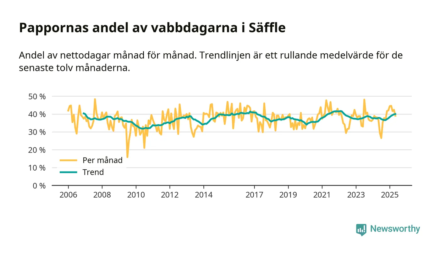 Pappor i Säffle vabbar mer än rikssnittet (38 procent) och även mer än andra män i Värmlands län (38 procent). Andelen är näst högst i länet. Skillnaderna inom landet är stora. Dorotea är den enda kommun i landet som når 50–50-fördelning.