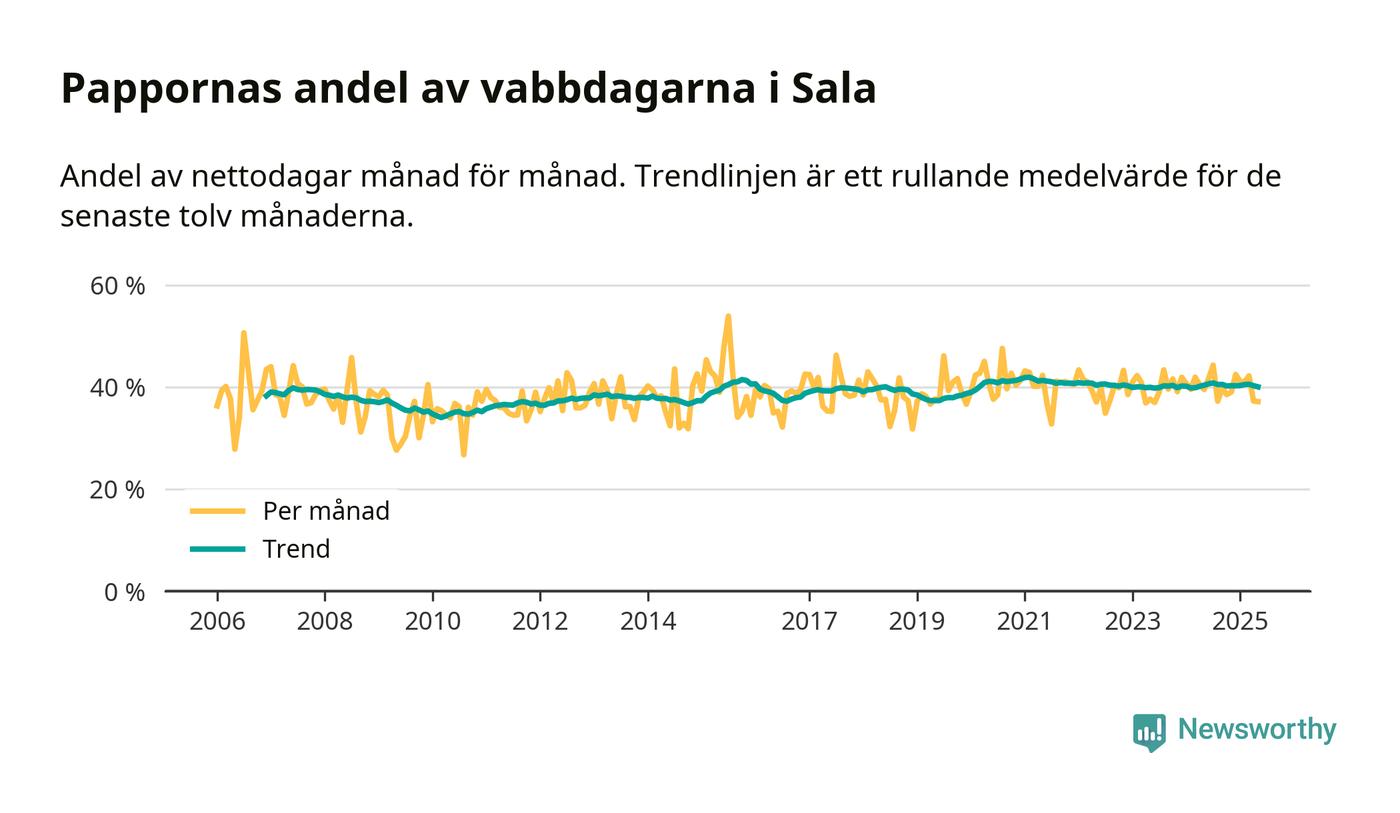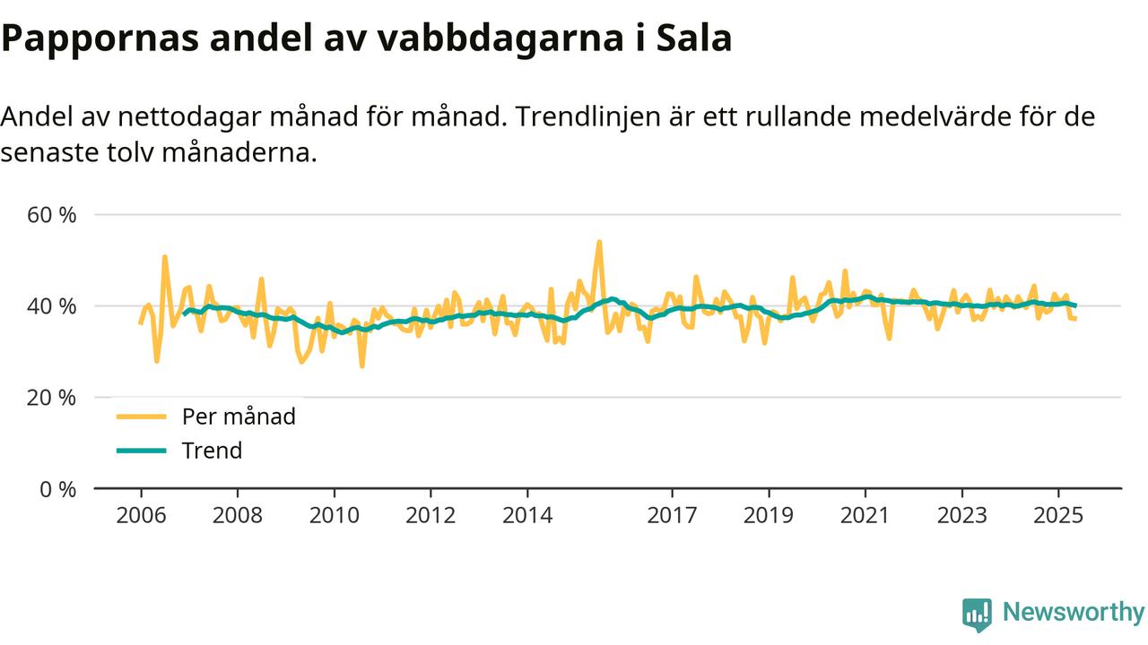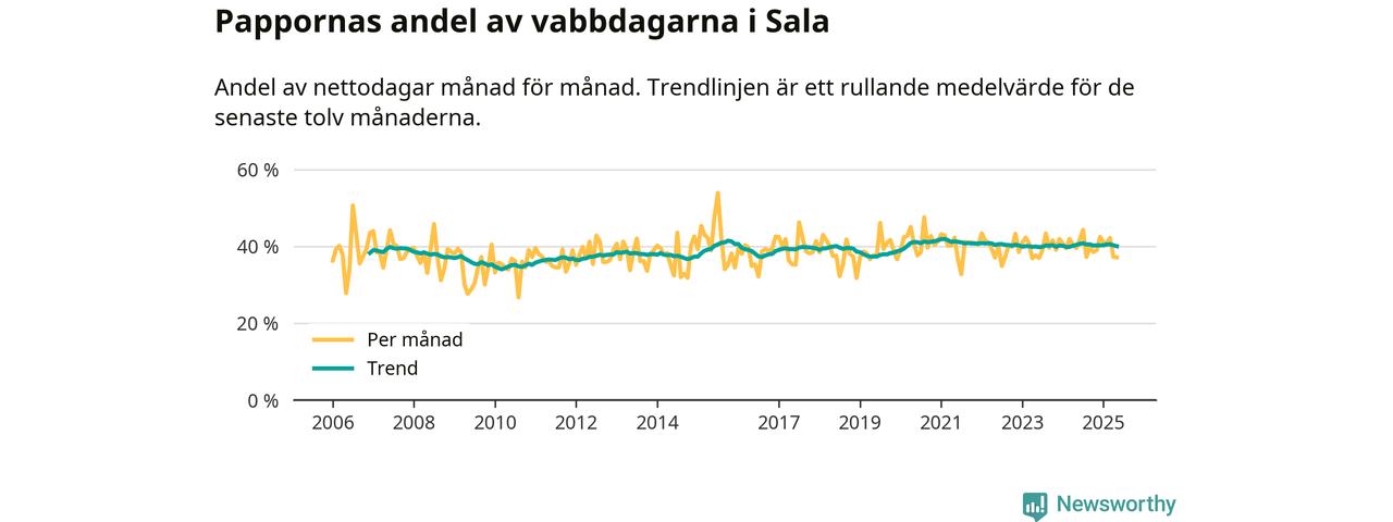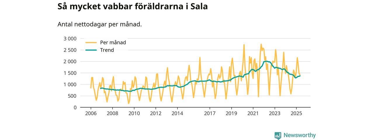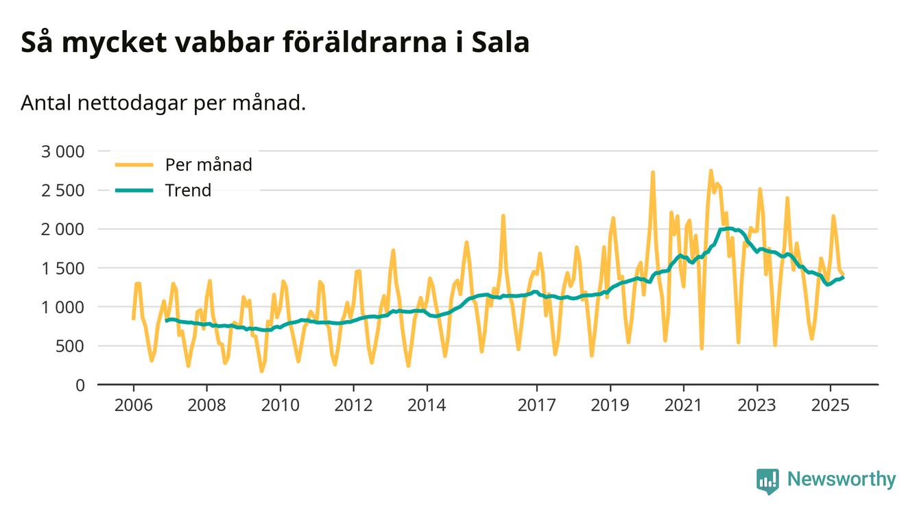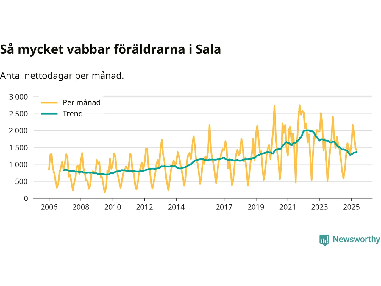 Sala ligger en bit från ett jämställt uttag. Under de senaste tolv månaderna har männen stått för 40 procent av all vabb i kommunen.