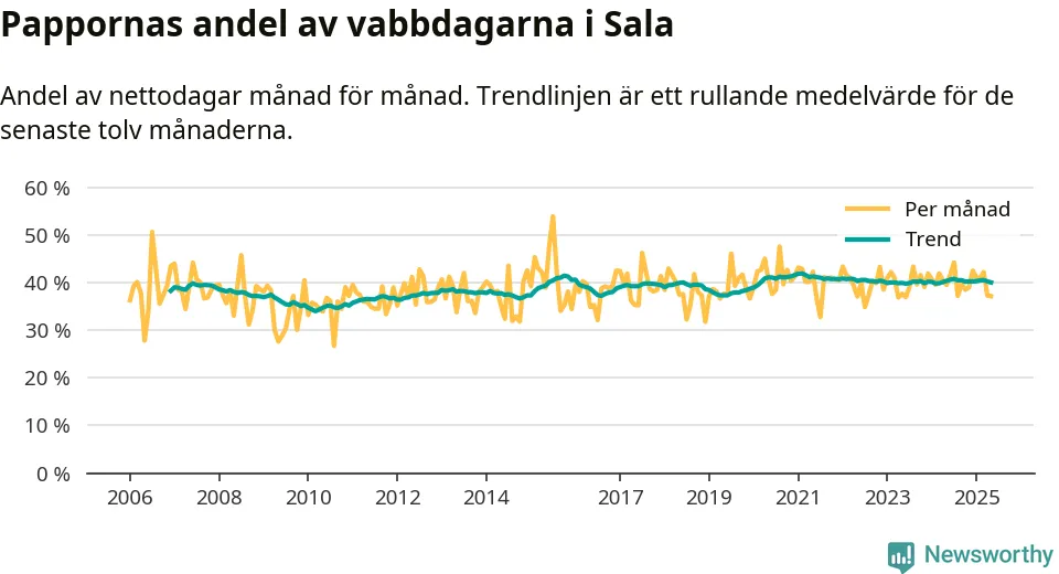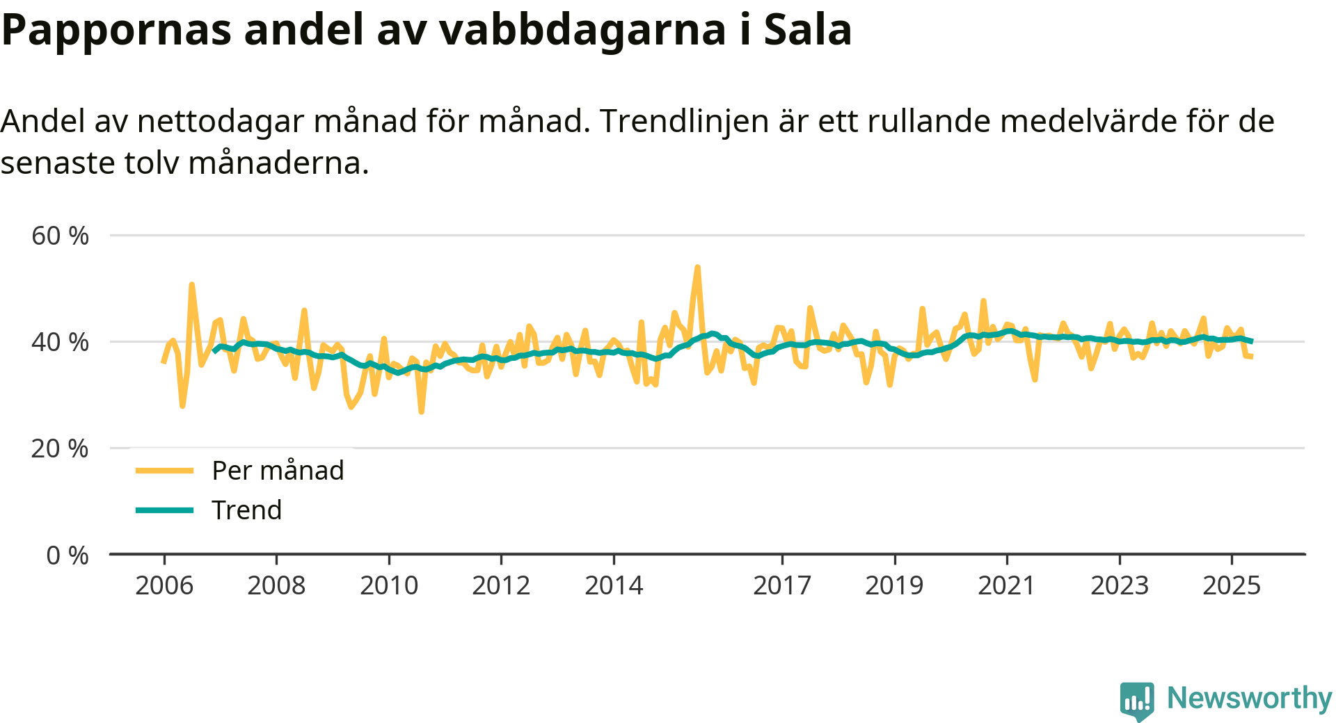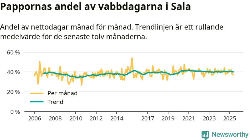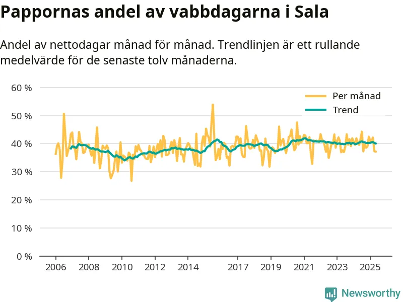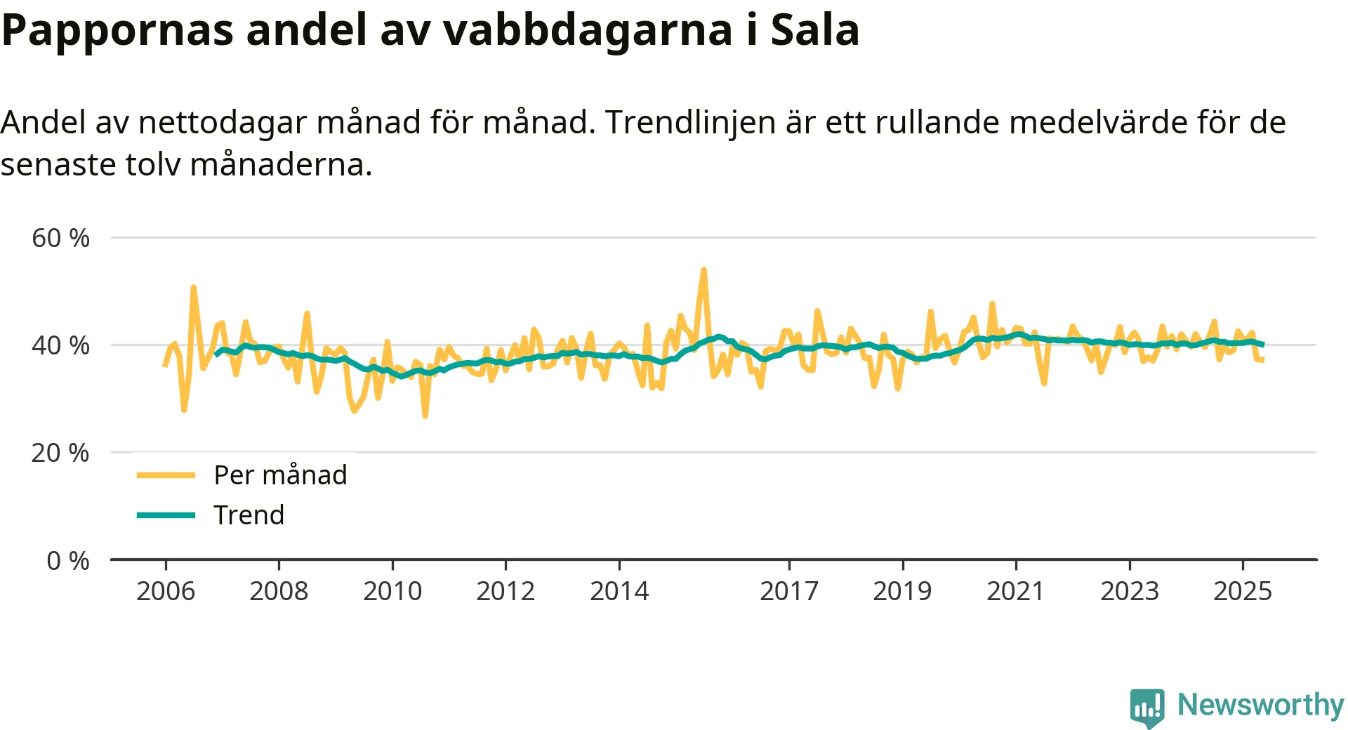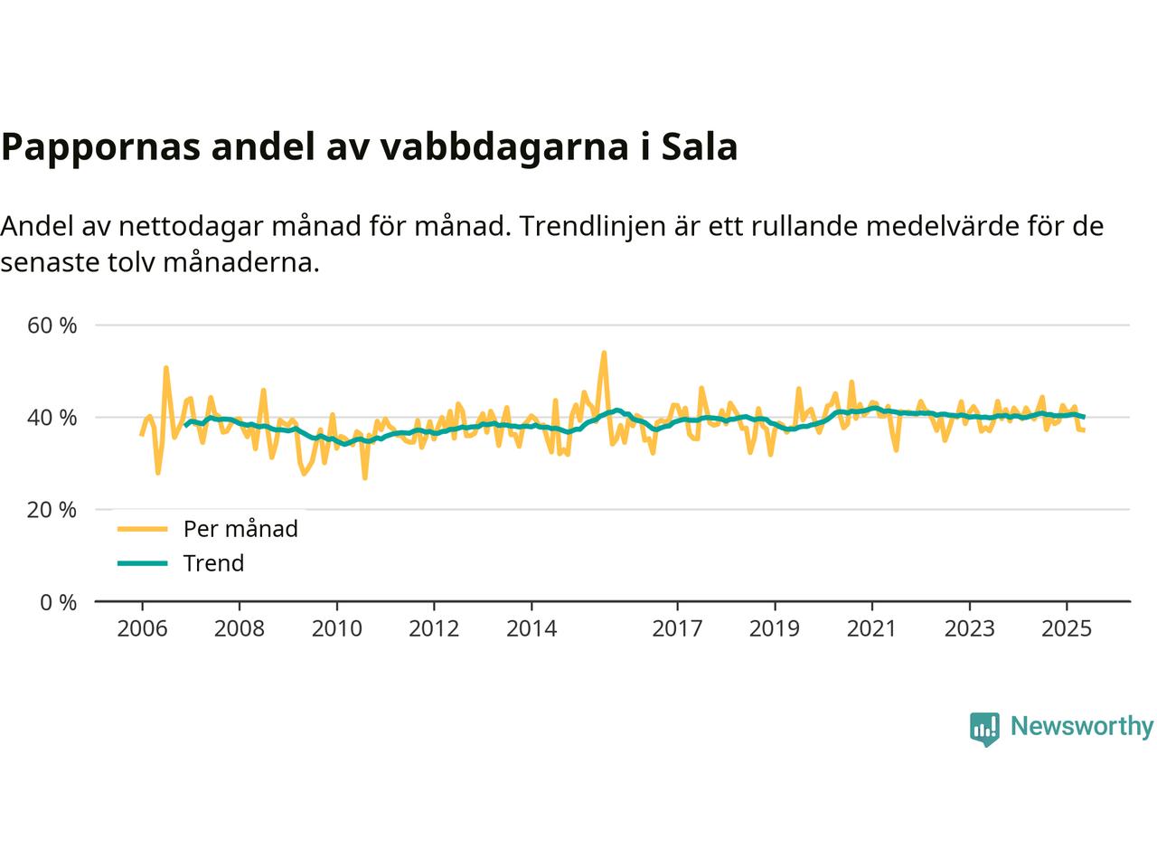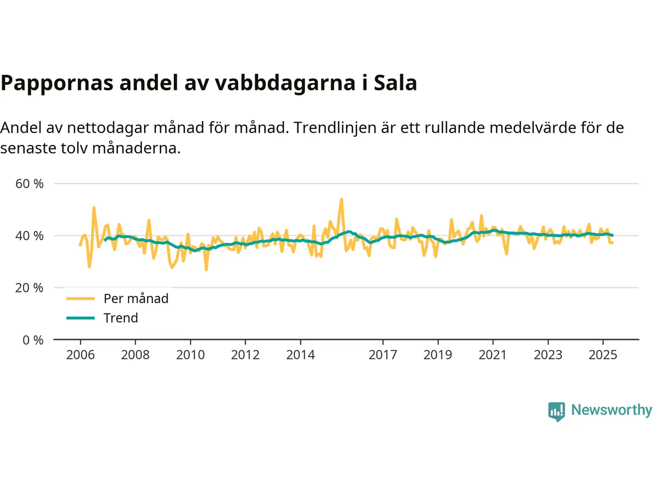 Pappor i Sala vabbar mer än rikssnittet (38 procent) och även mer än andra män i Västmanlands län (38 procent). Skillnaderna inom landet är stora. Dorotea är den enda kommun i landet som når 50–50-fördelning.