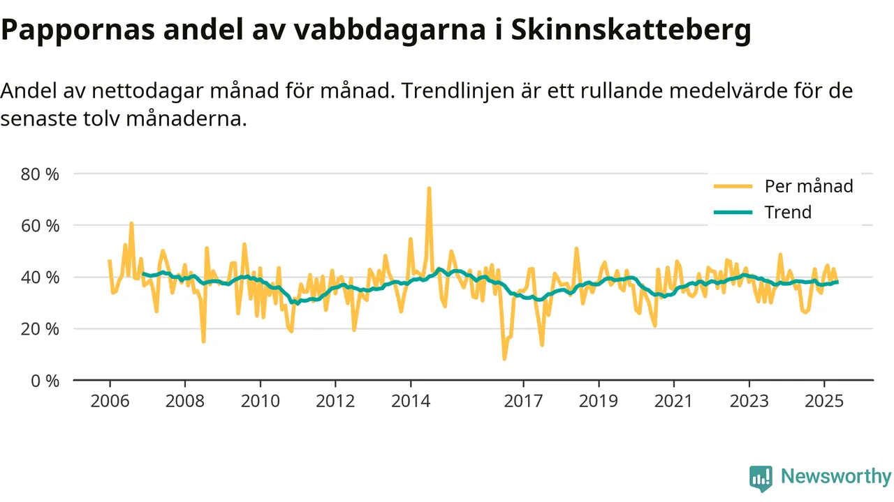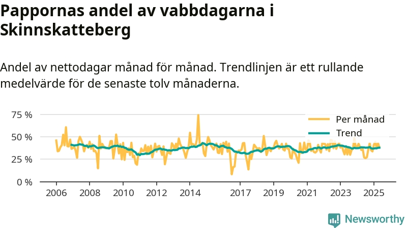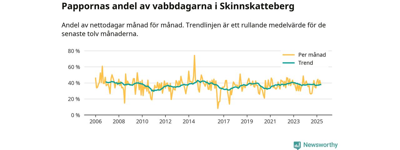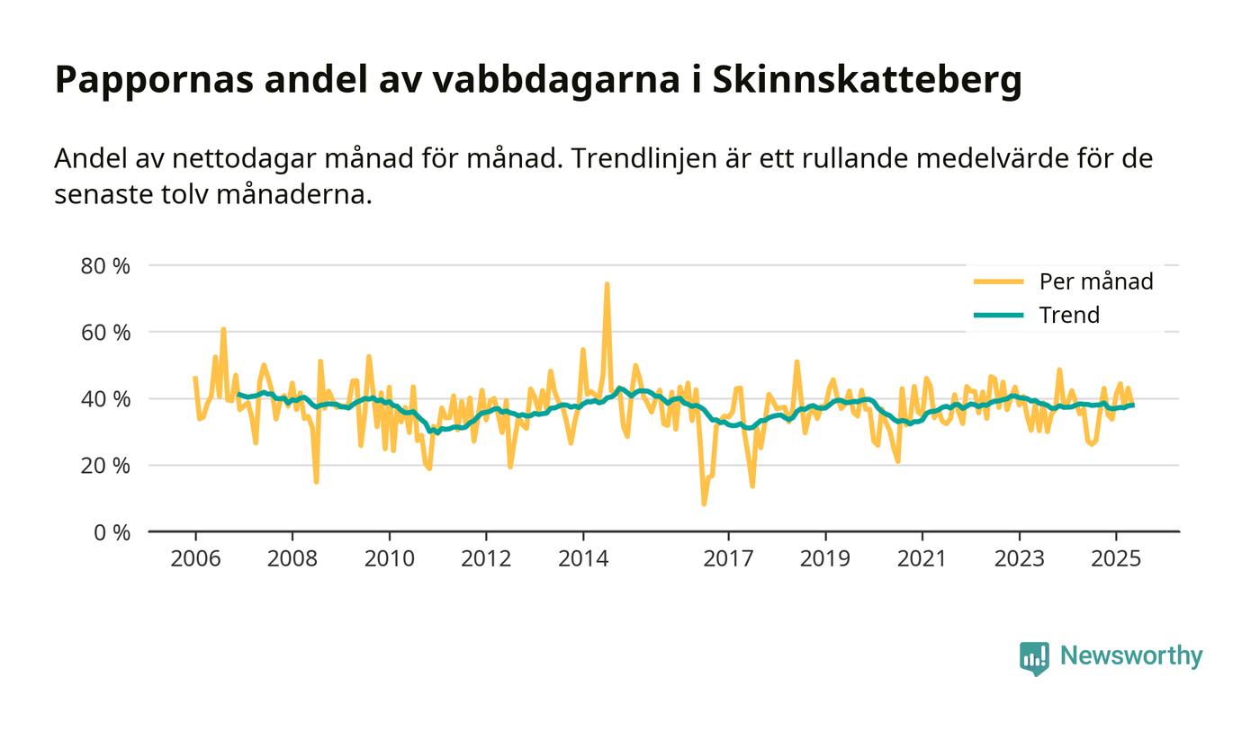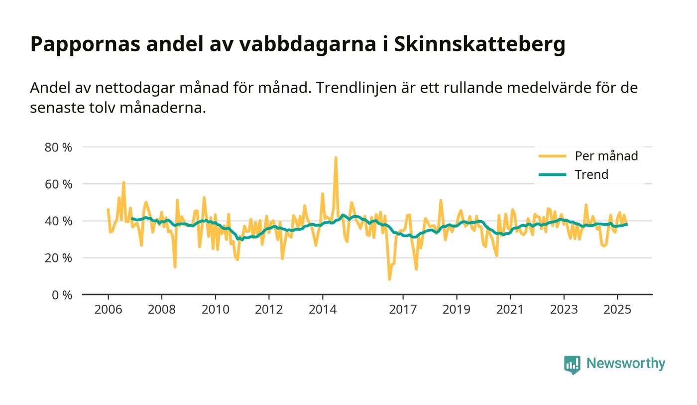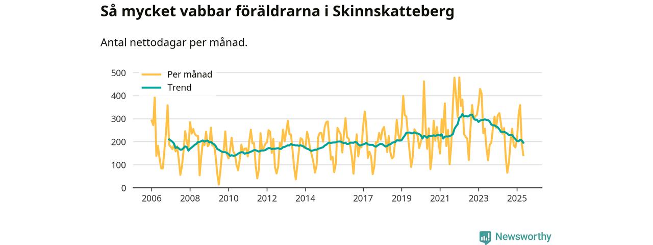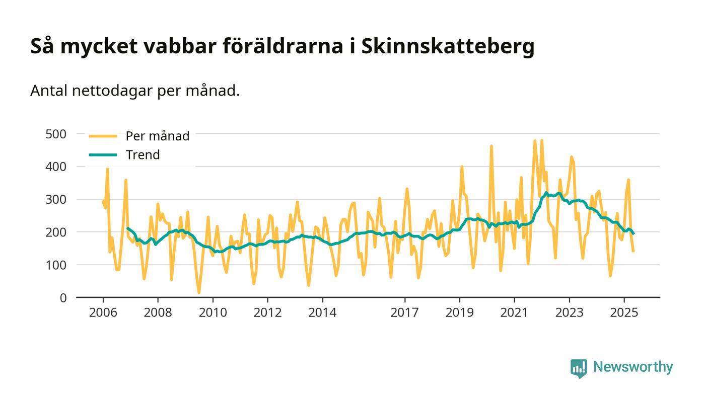 Skinnskatteberg ligger en bit från ett jämställt uttag. Under de senaste tolv månaderna har männen stått för 38 procent av all vabb i kommunen. Pappornas uttag peakade hösten 2014 då kommunens fäder var uppe i 43 procent av vabbdagarna 1.