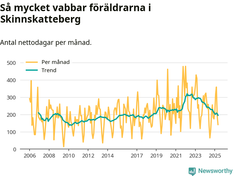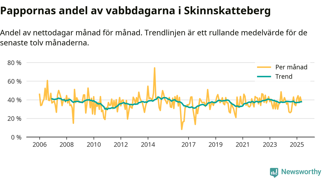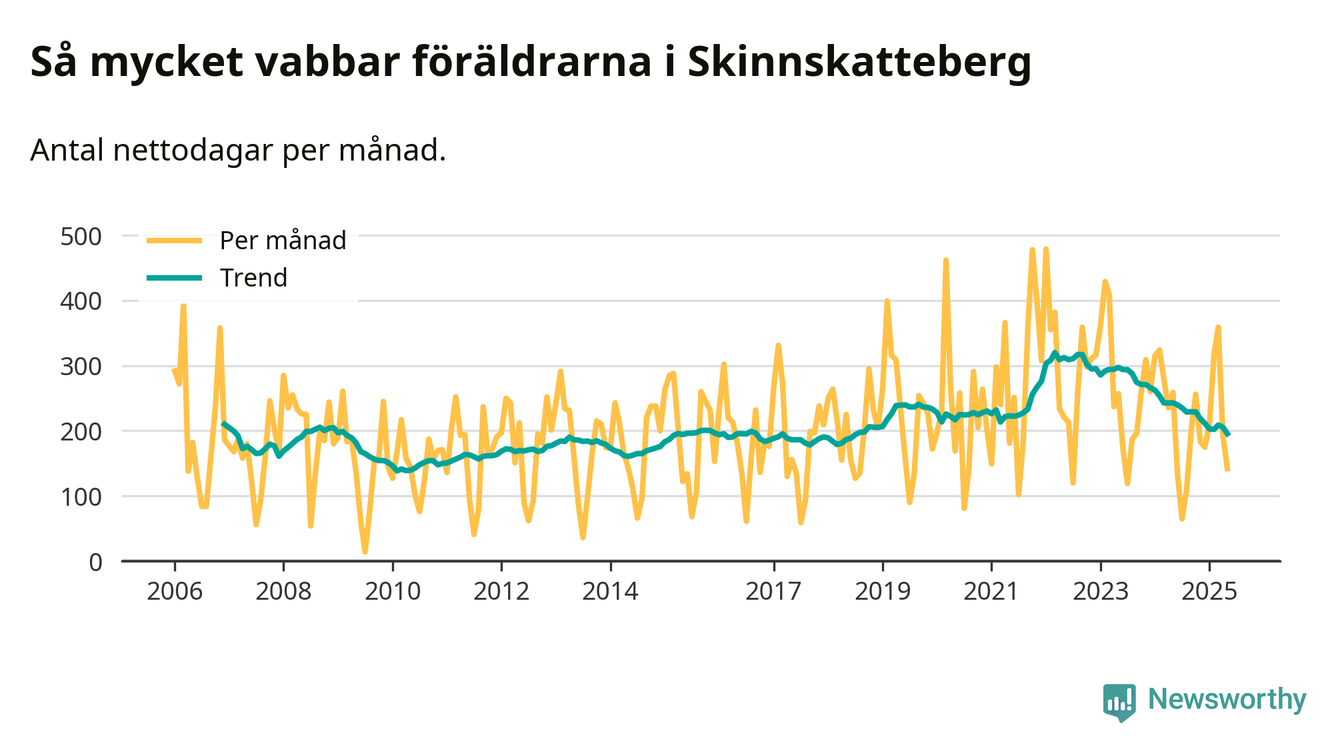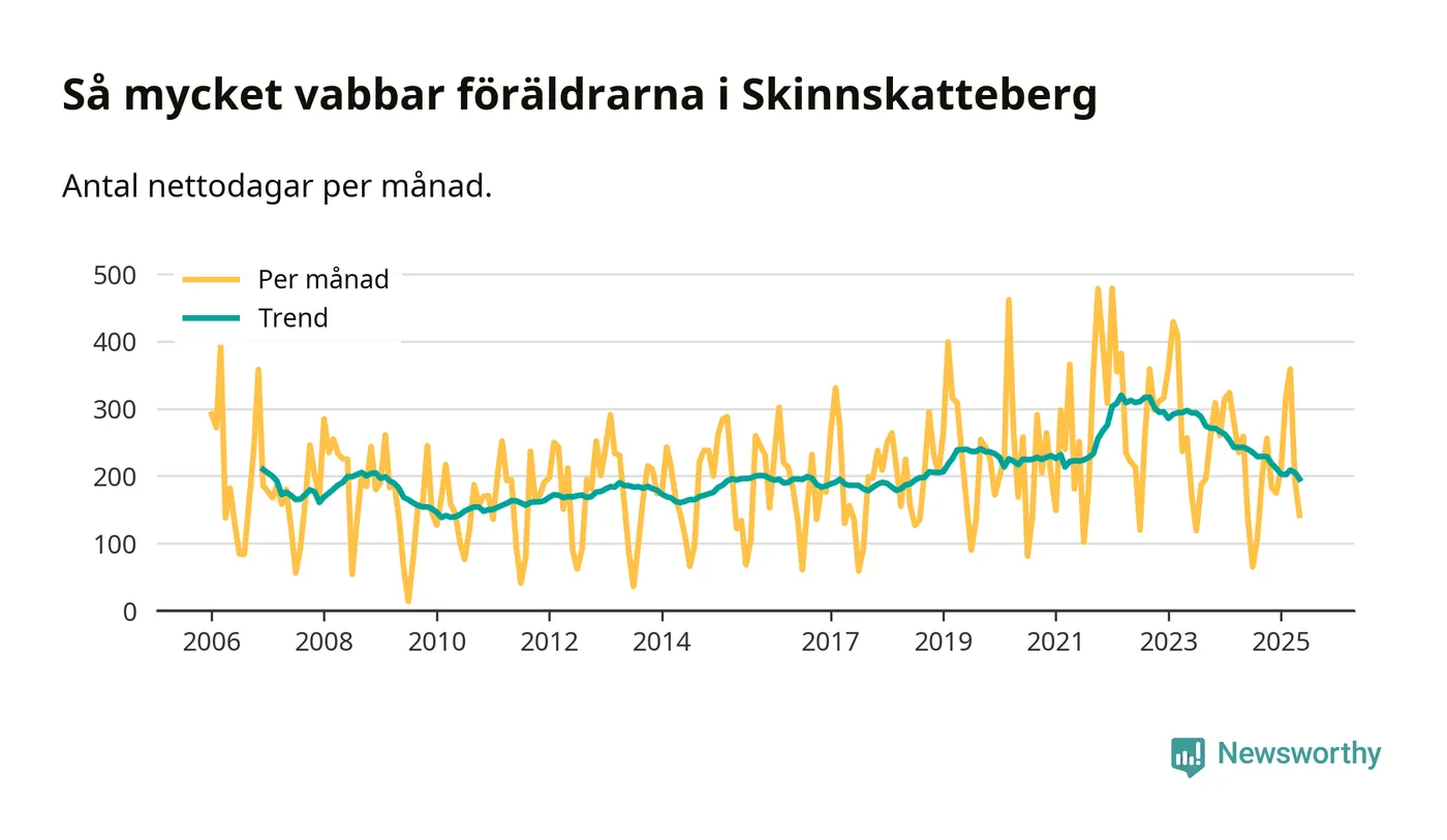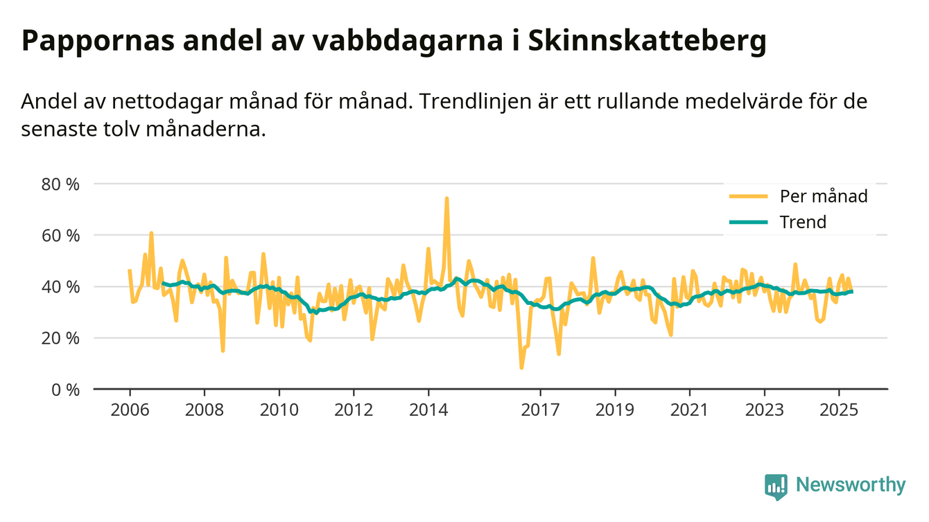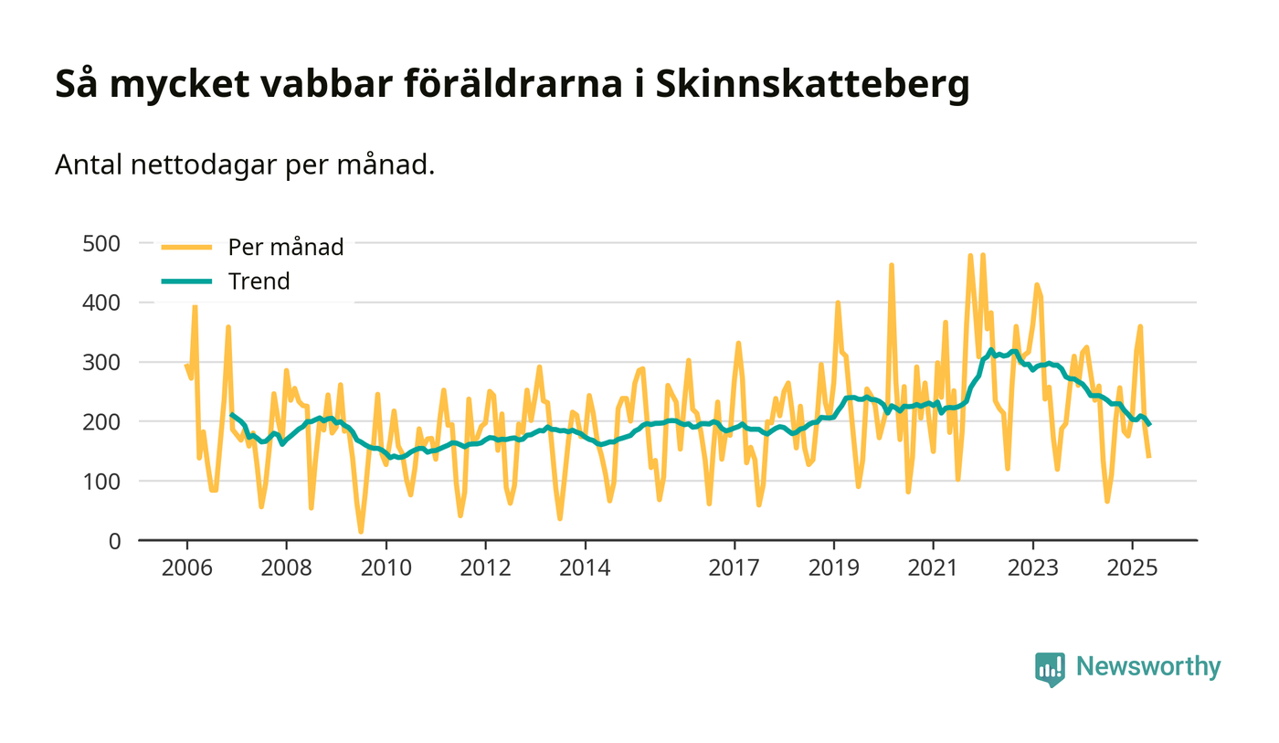Skinnskatteberg ligger en bit från ett jämställt uttag. Under de senaste tolv månaderna har männen stått för 38 procent av all vabb i kommunen. Pappornas uttag peakade hösten 2014 då kommunens fäder var uppe i 43 procent av vabbdagarna 1.