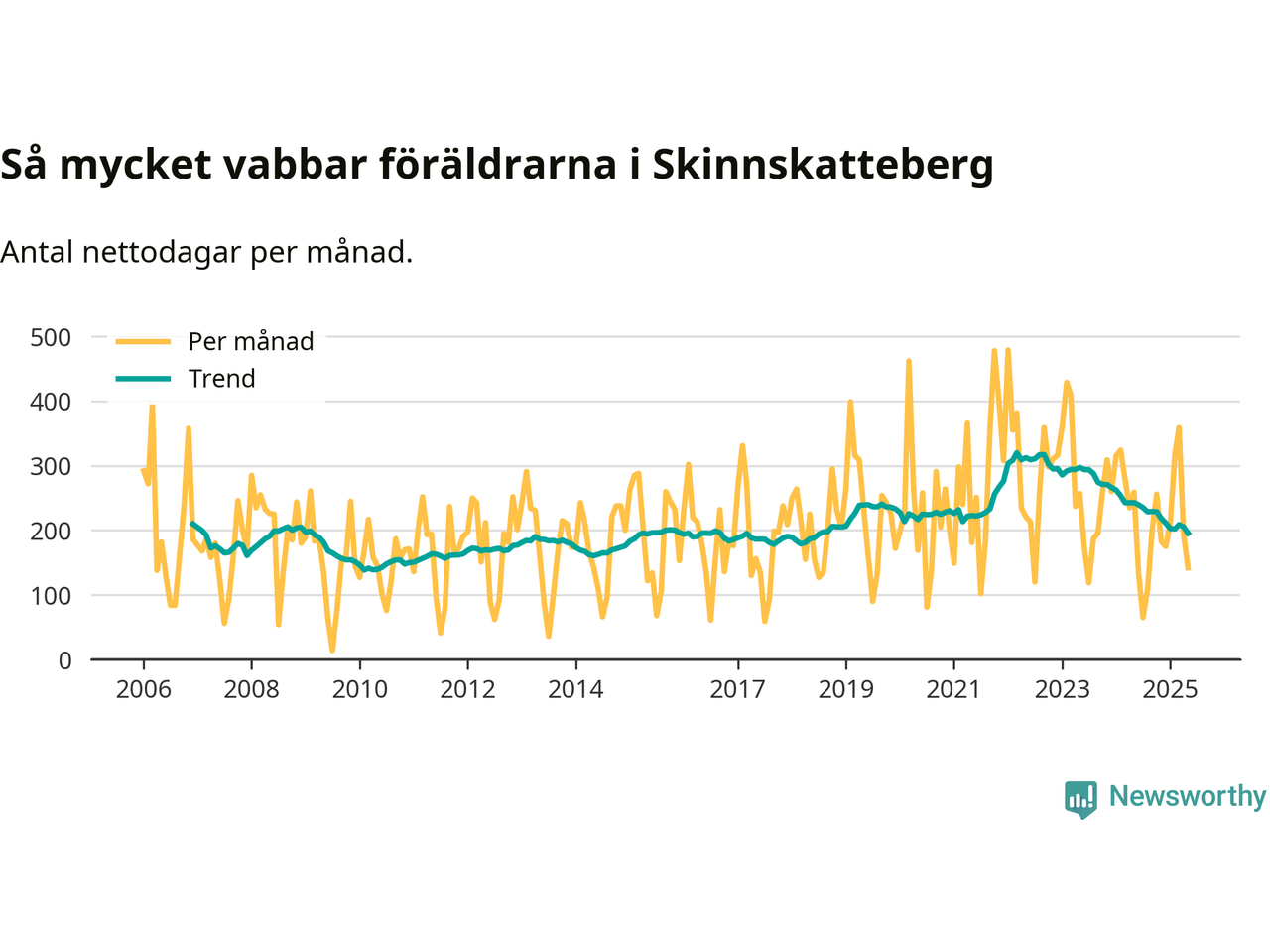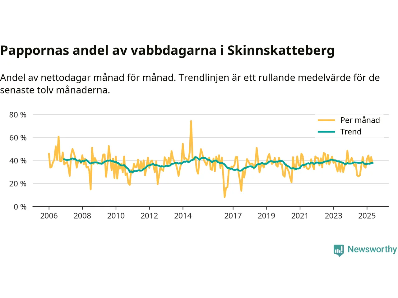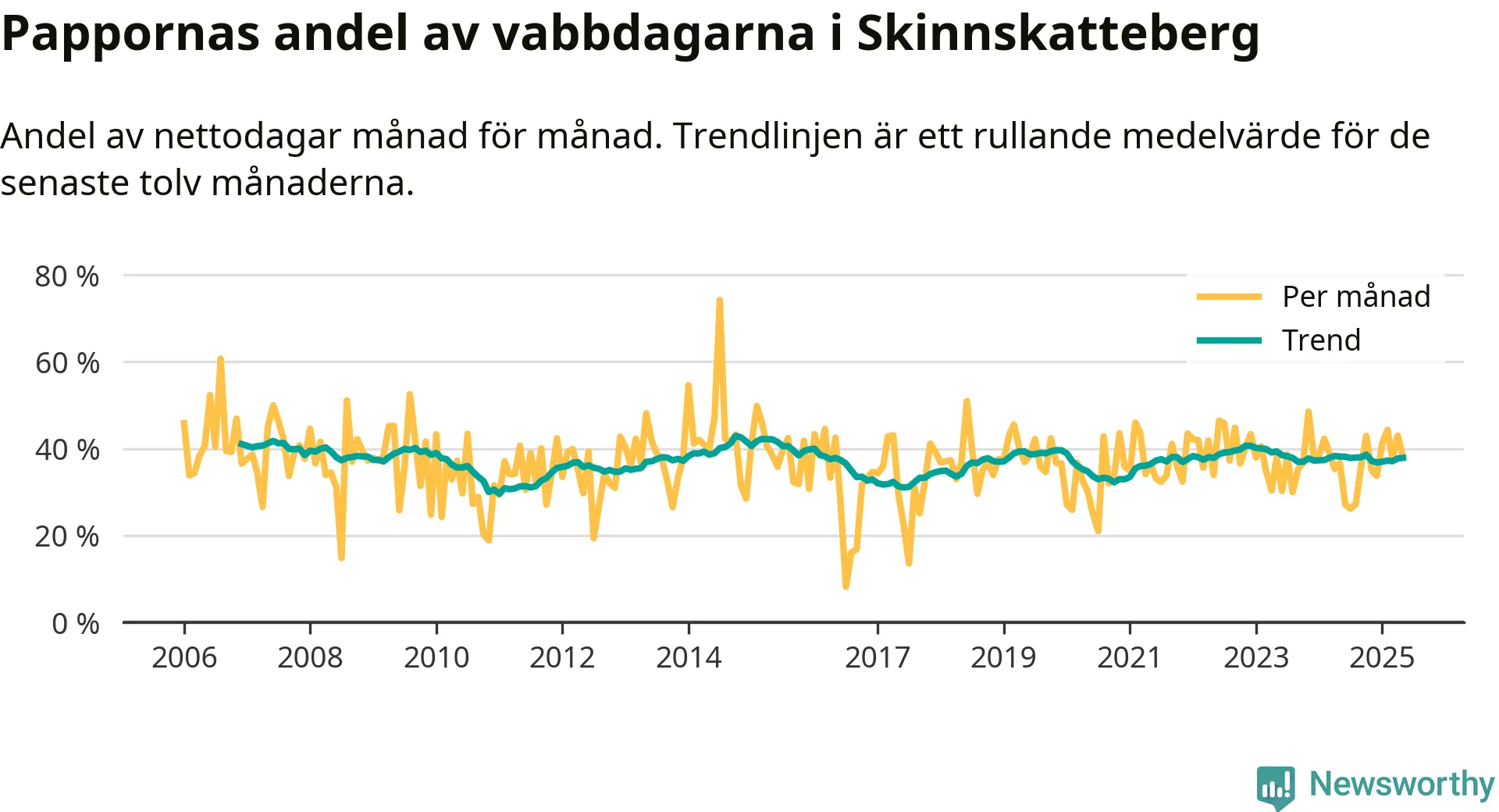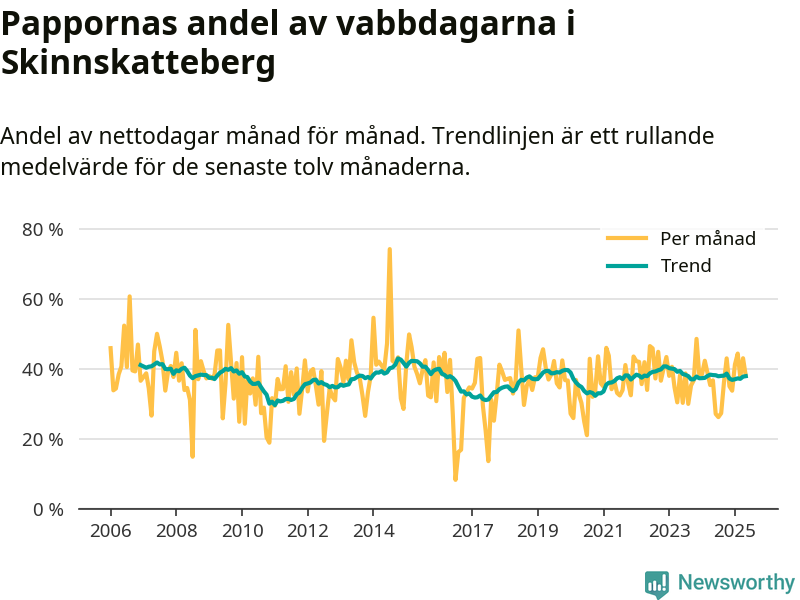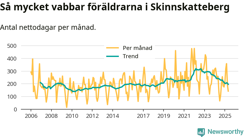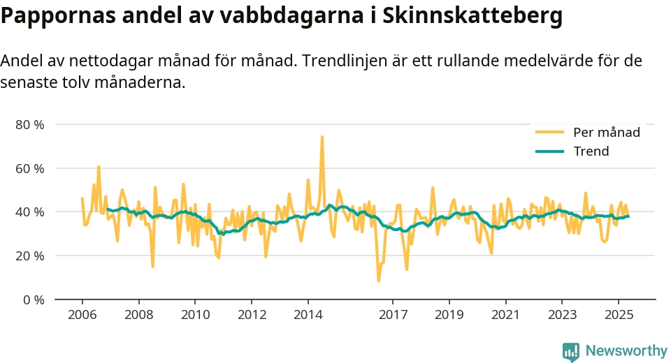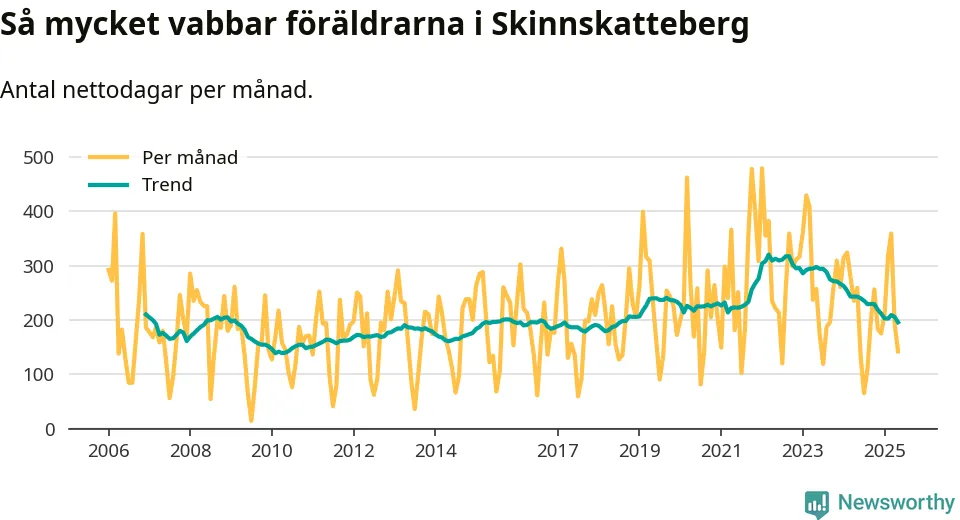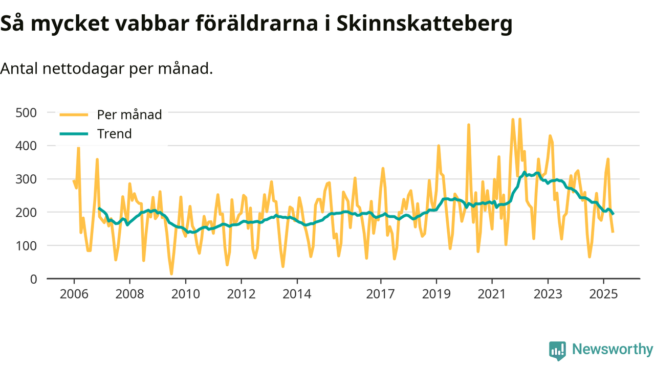 Skinnskatteberg ligger en bit från ett jämställt uttag. Under de senaste tolv månaderna har männen stått för 38 procent av all vabb i kommunen. Pappornas uttag peakade hösten 2014 då kommunens fäder var uppe i 43 procent av vabbdagarna 1.