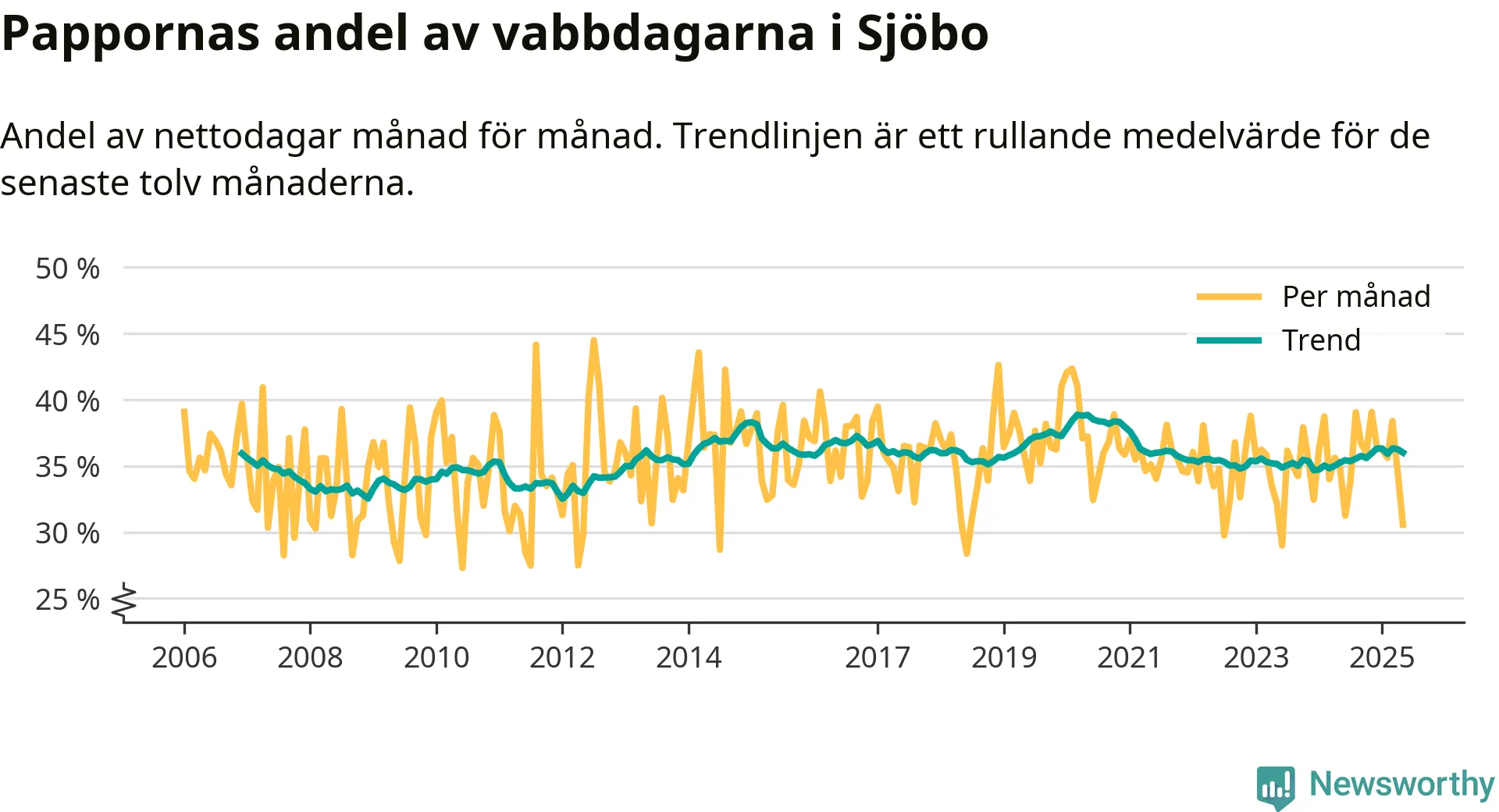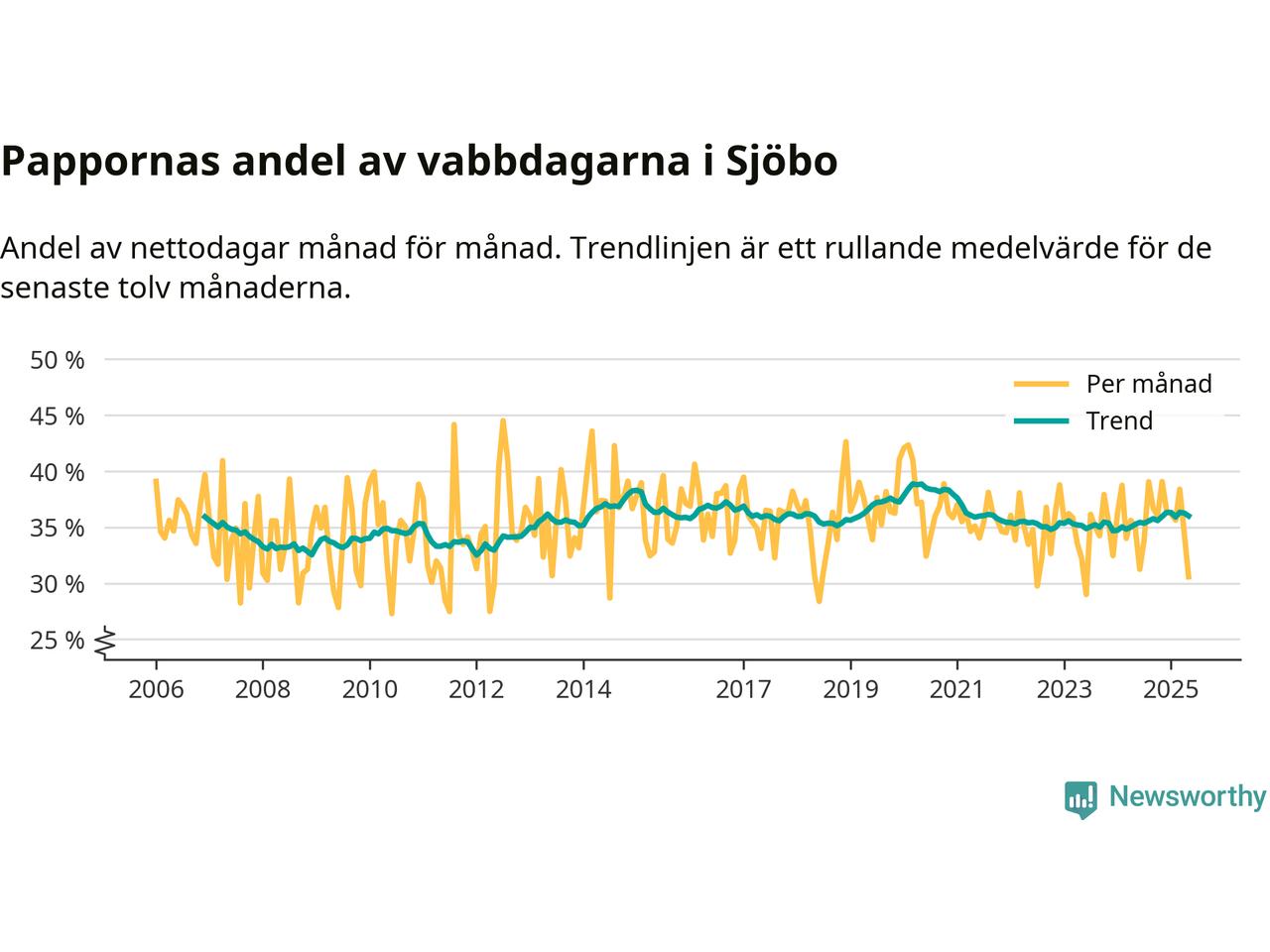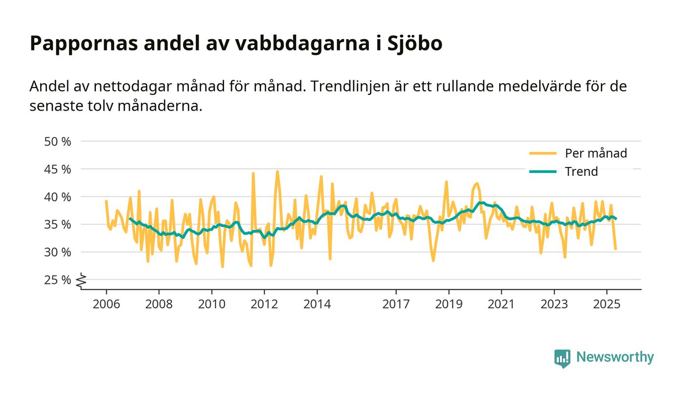Sjöbo ligger en bit från ett jämställt uttag. Under de senaste tolv månaderna har männen stått för 36 procent av all vabb i kommunen. Pappornas uttag peakade våren 2020 då kommunens fäder var uppe i 39 procent av vabbdagarna 1.