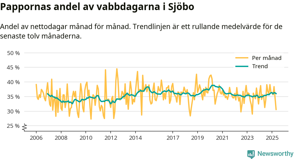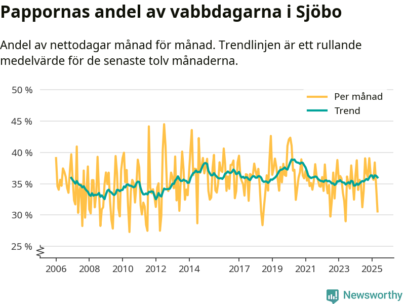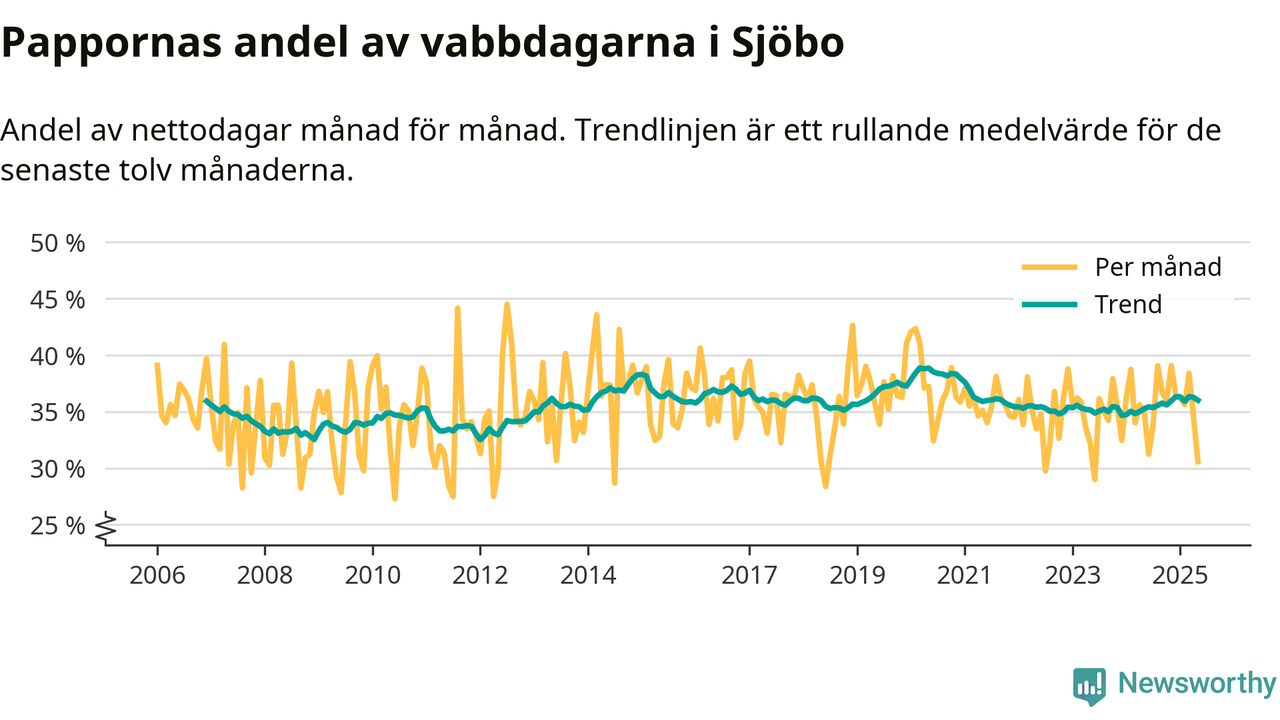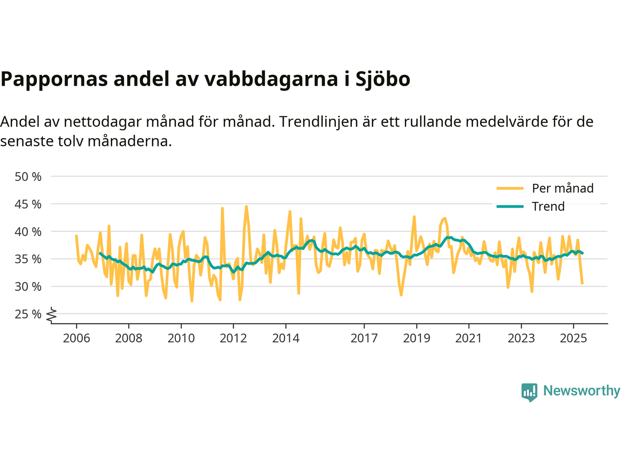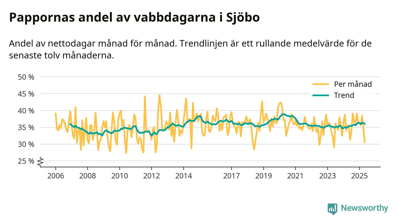 Sjöbo ligger en bit från ett jämställt uttag. Under de senaste tolv månaderna har männen stått för 36 procent av all vabb i kommunen. Pappornas uttag peakade våren 2020 då kommunens fäder var uppe i 39 procent av vabbdagarna 1.