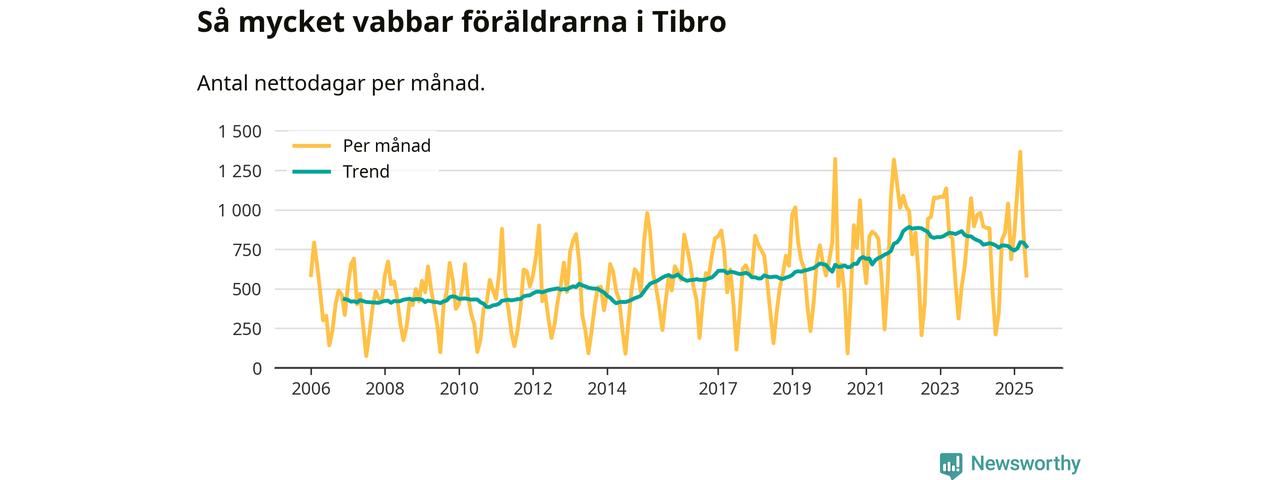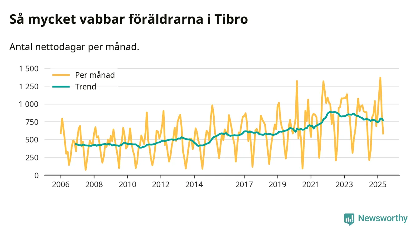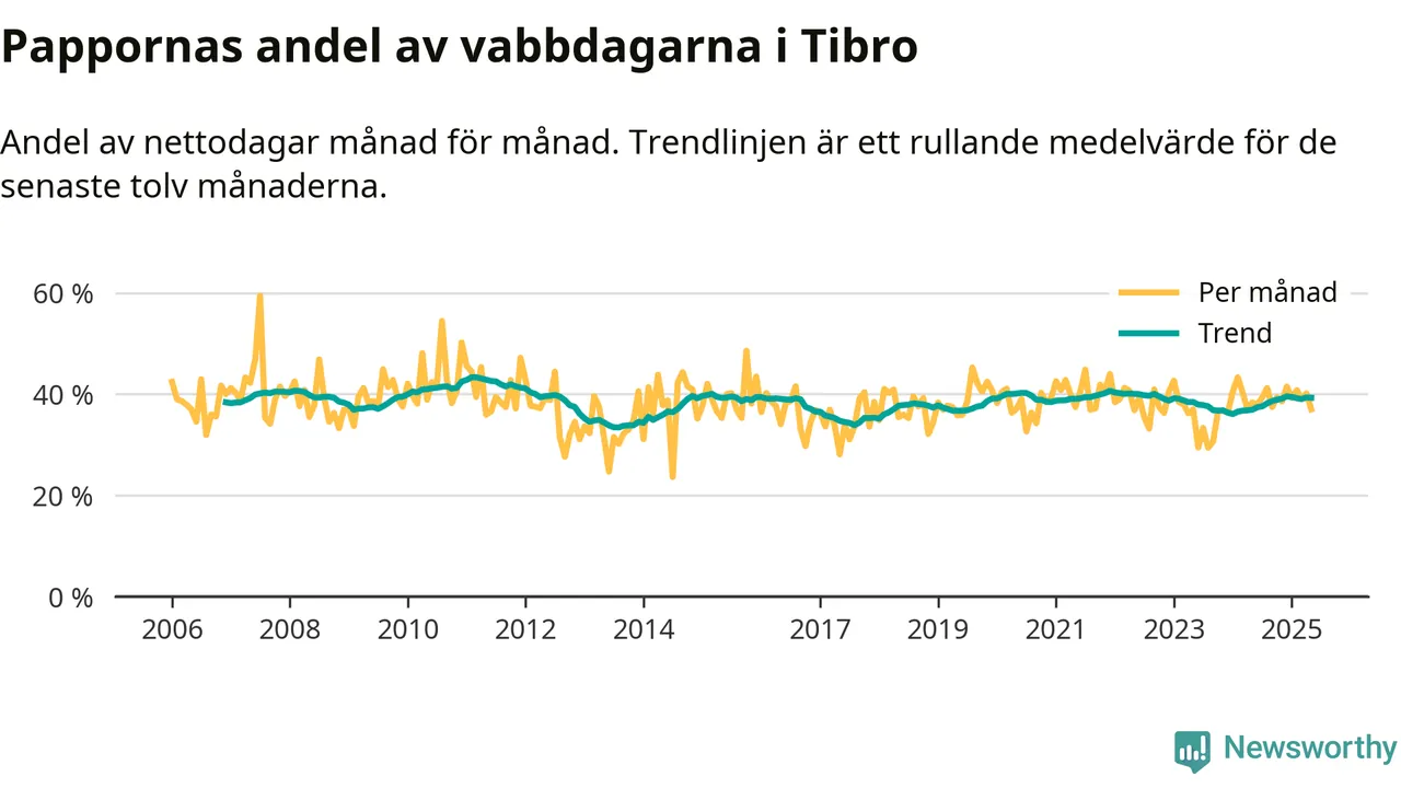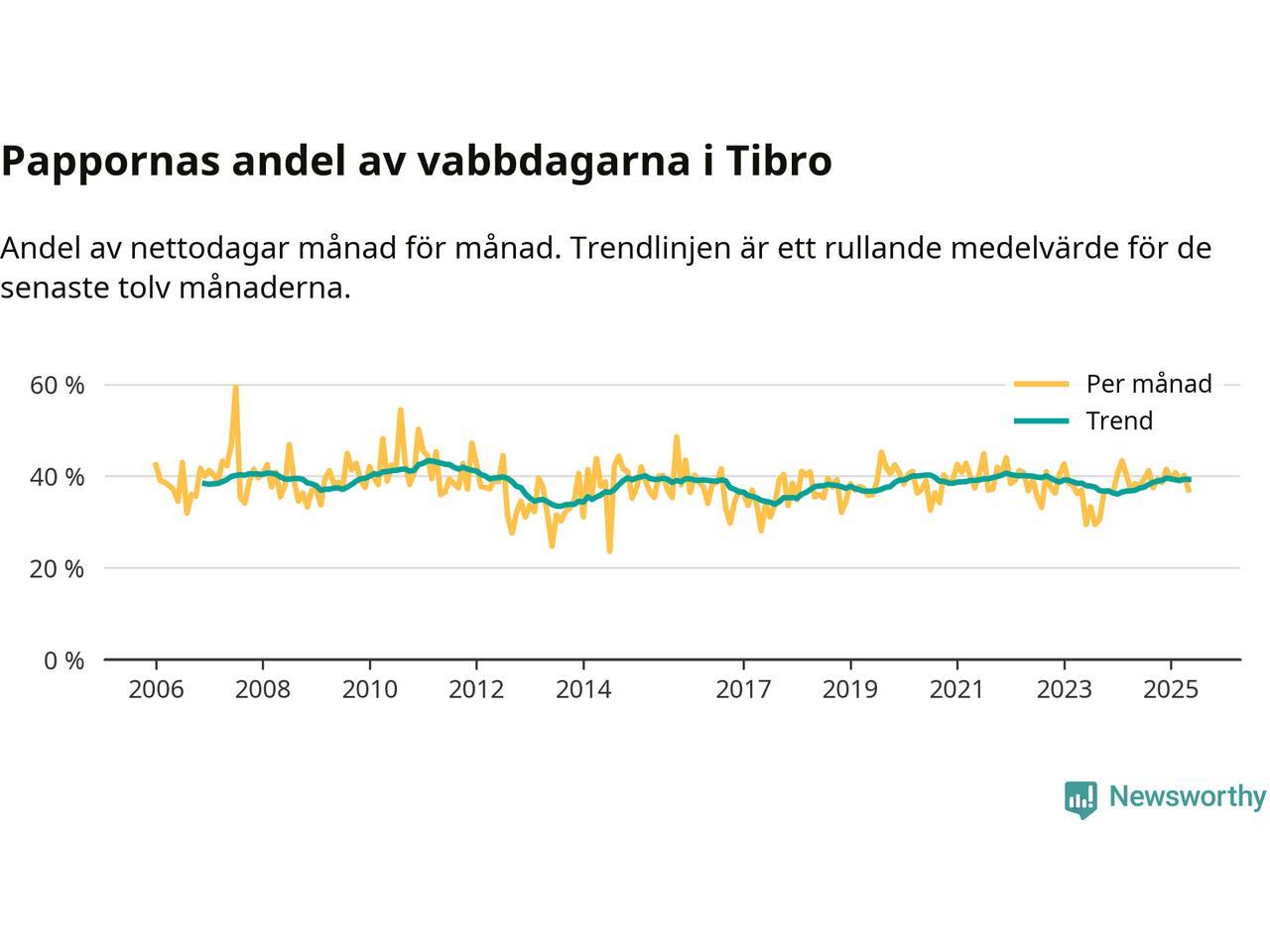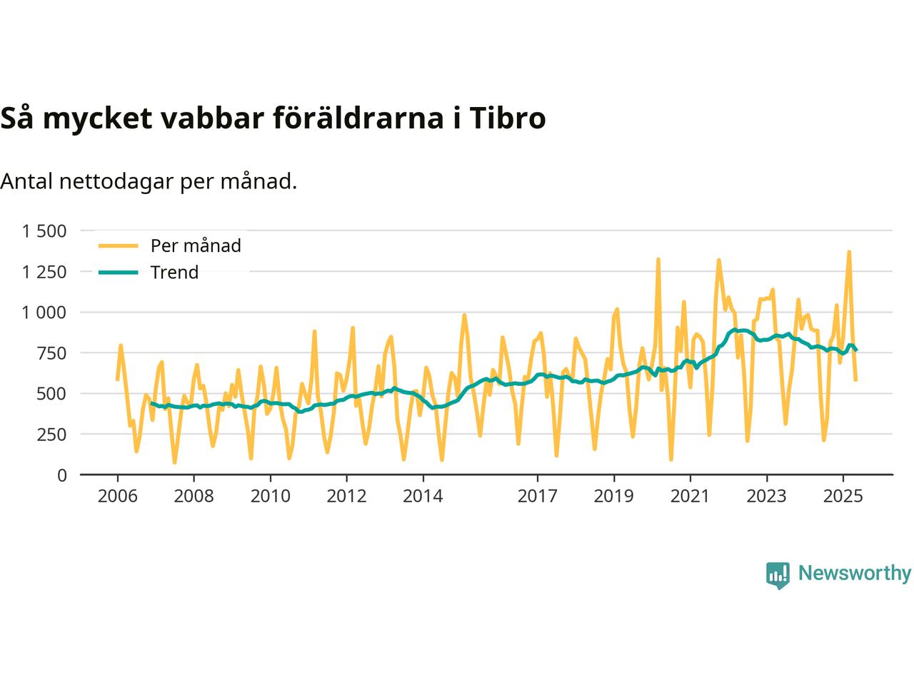 Tibro ligger en bit från ett jämställt uttag. Under de senaste tolv månaderna har männen stått för 39 procent av all vabb i kommunen. Pappornas uttag peakade vintern 2011 då kommunens fäder var uppe i 43 procent av vabbdagarna 1.