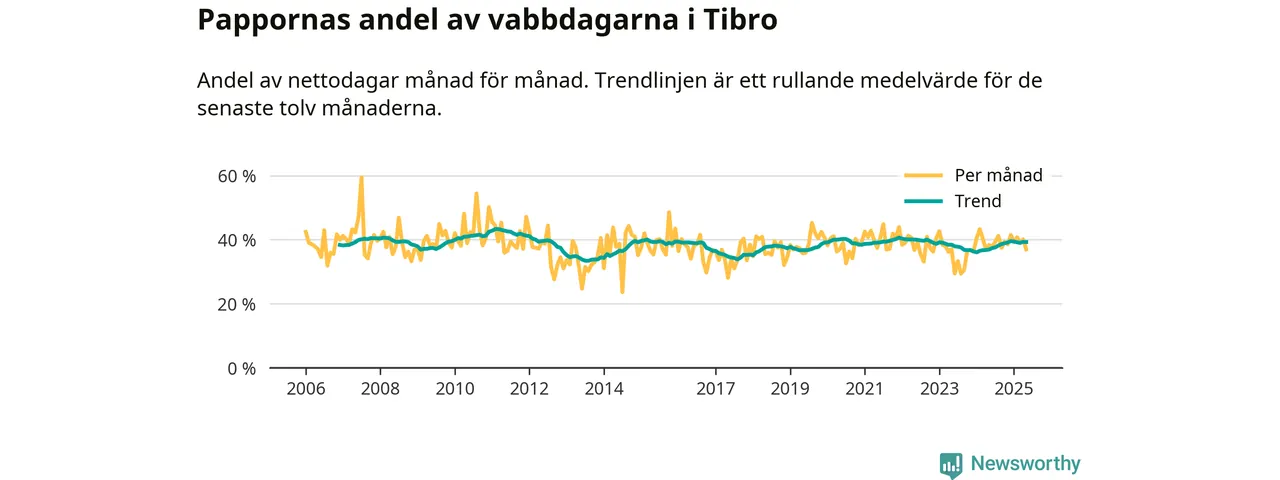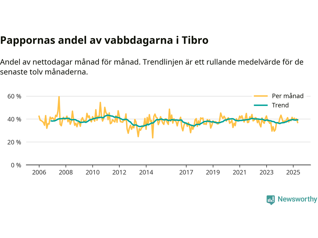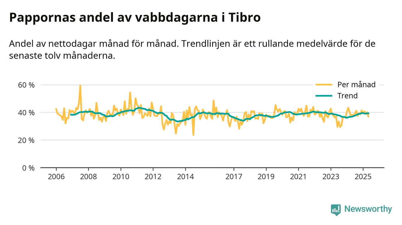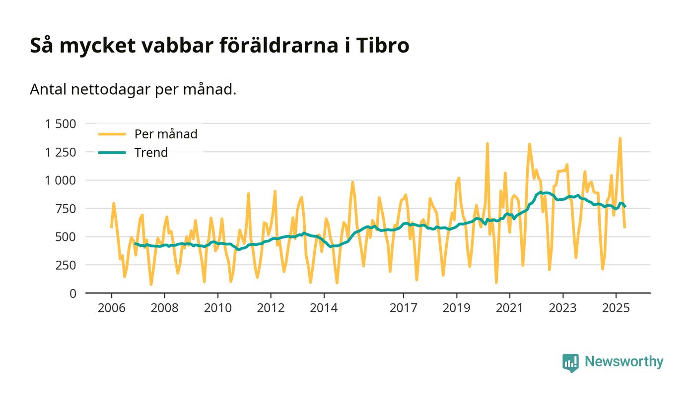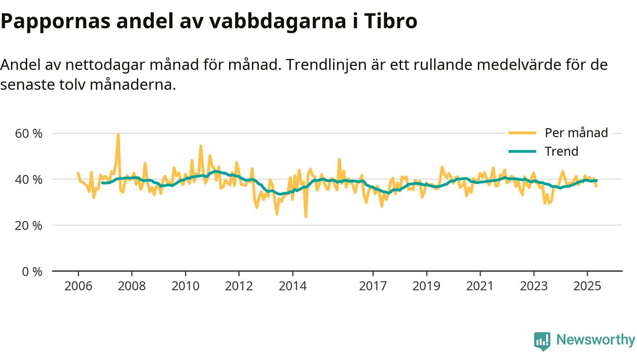 Tibro ligger en bit från ett jämställt uttag. Under de senaste tolv månaderna har männen stått för 39 procent av all vabb i kommunen. Pappornas uttag peakade vintern 2011 då kommunens fäder var uppe i 43 procent av vabbdagarna 1.
