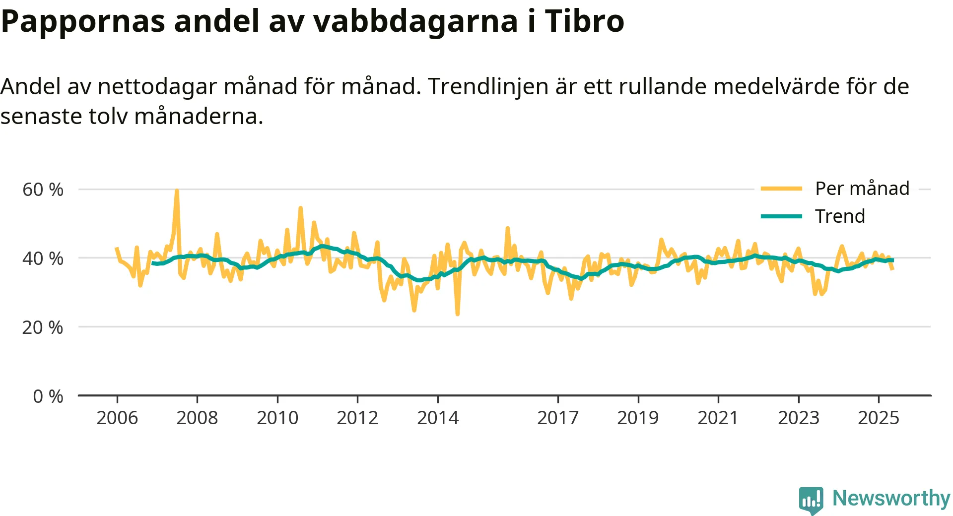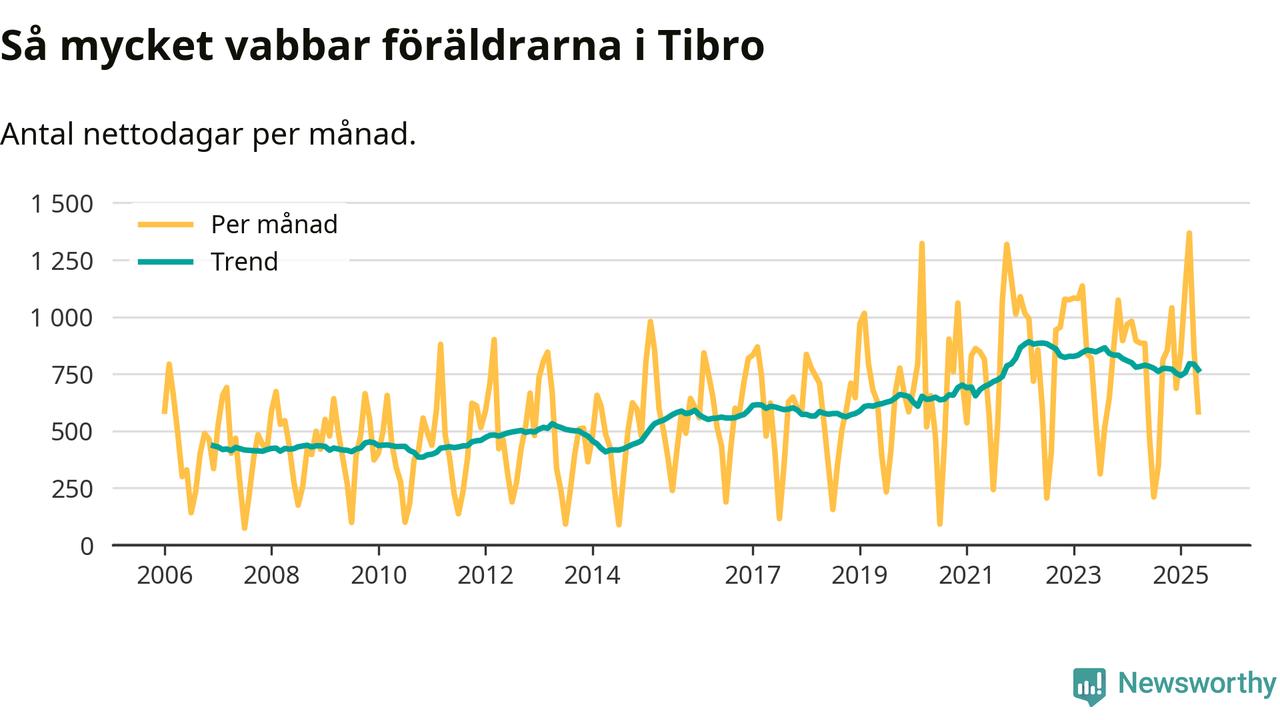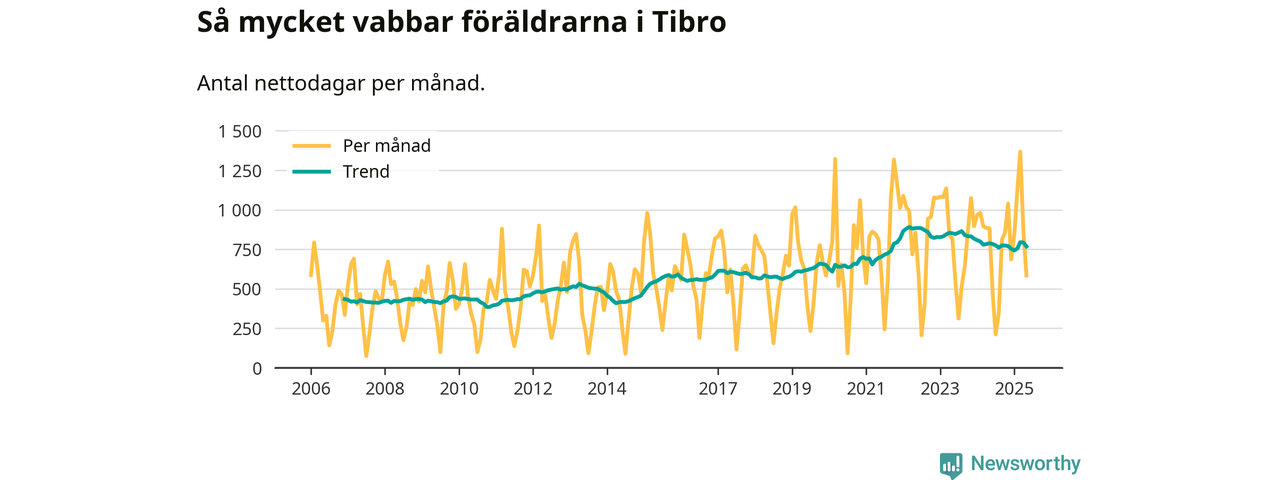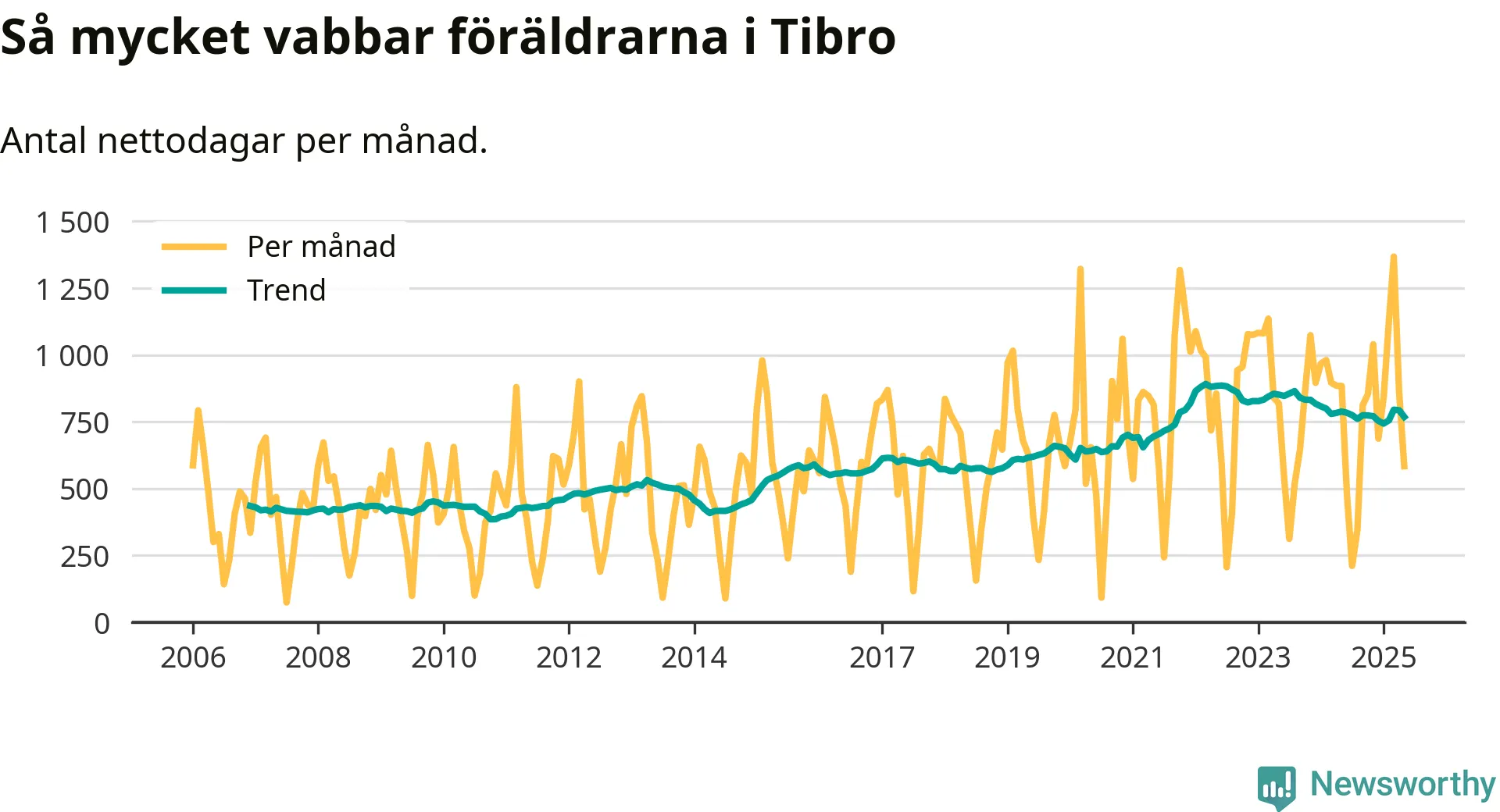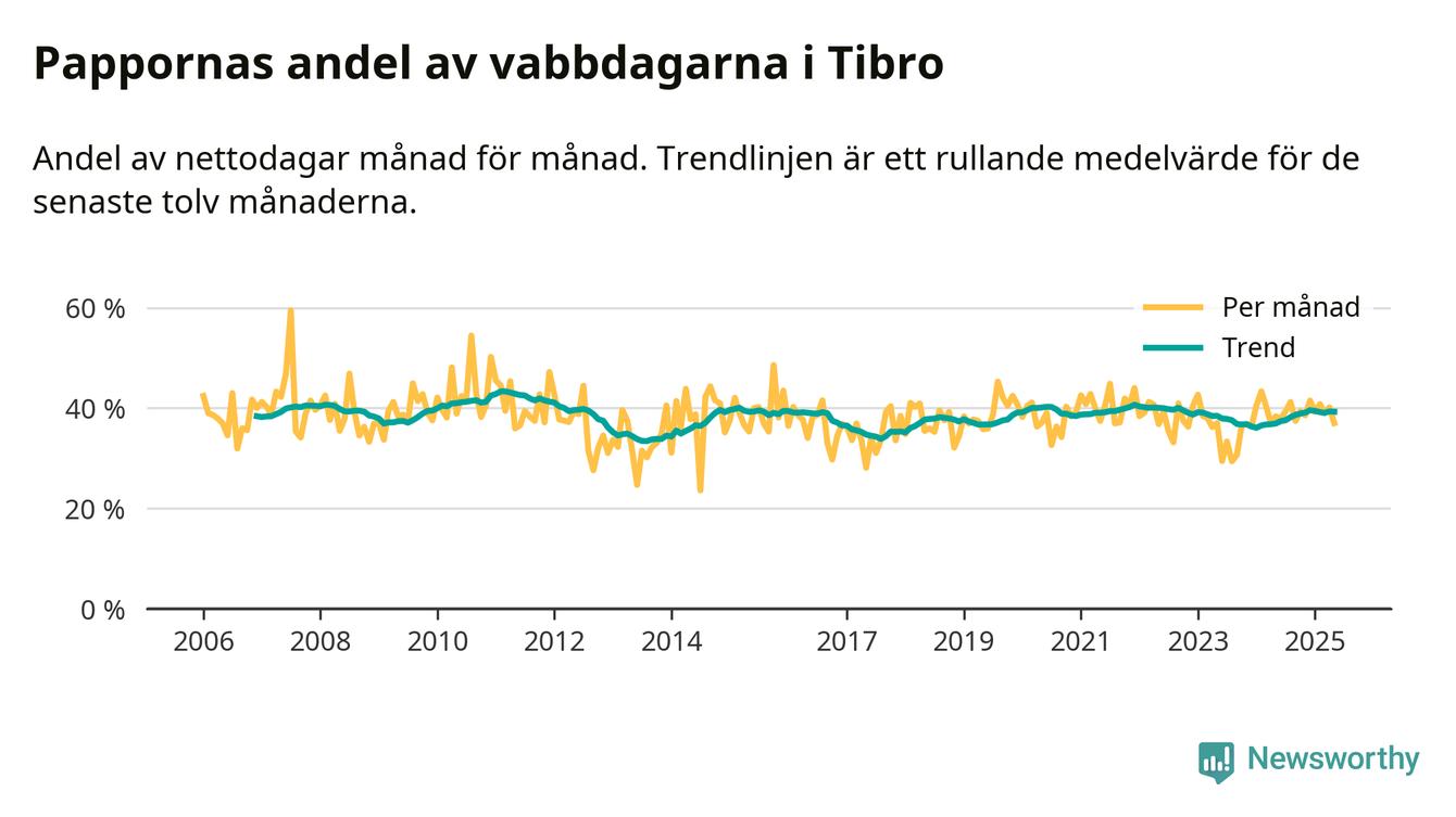 Tibro ligger en bit från ett jämställt uttag. Under de senaste tolv månaderna har männen stått för 39 procent av all vabb i kommunen. Pappornas uttag peakade vintern 2011 då kommunens fäder var uppe i 43 procent av vabbdagarna 1.