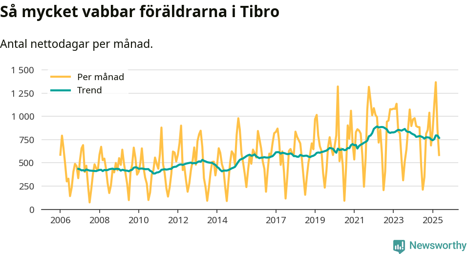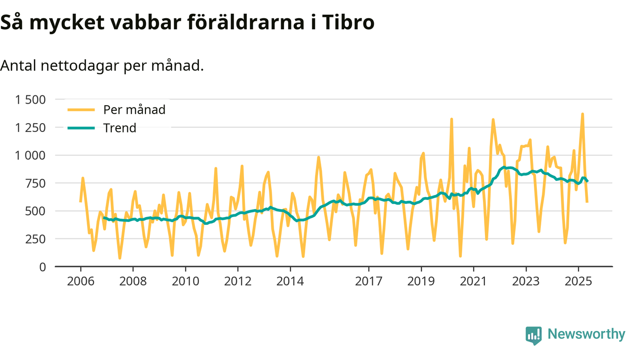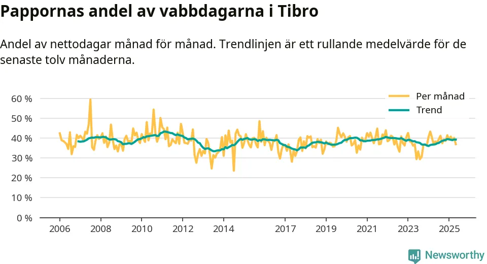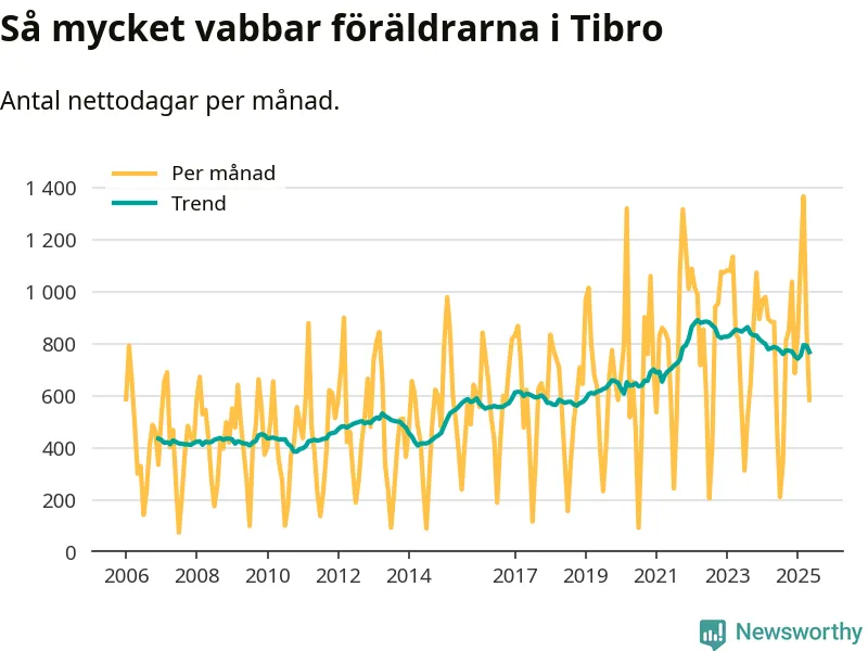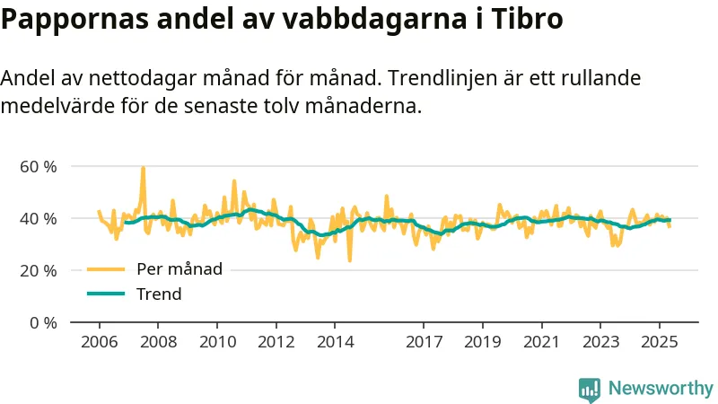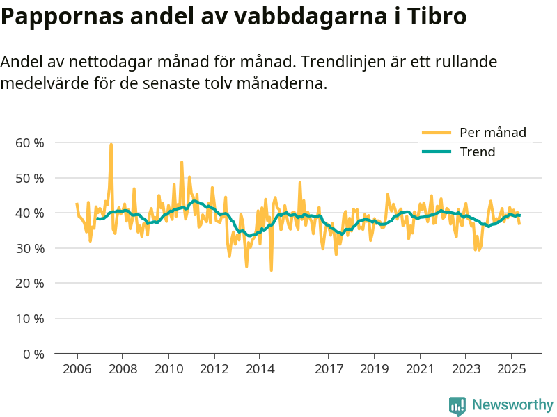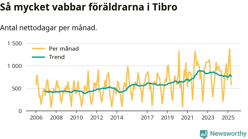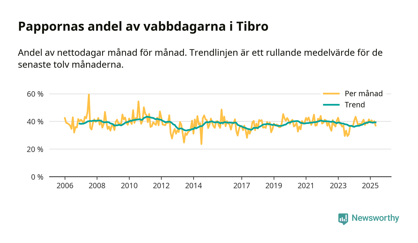 Tibro ligger en bit från ett jämställt uttag. Under de senaste tolv månaderna har männen stått för 39 procent av all vabb i kommunen. Pappornas uttag peakade vintern 2011 då kommunens fäder var uppe i 43 procent av vabbdagarna 1.