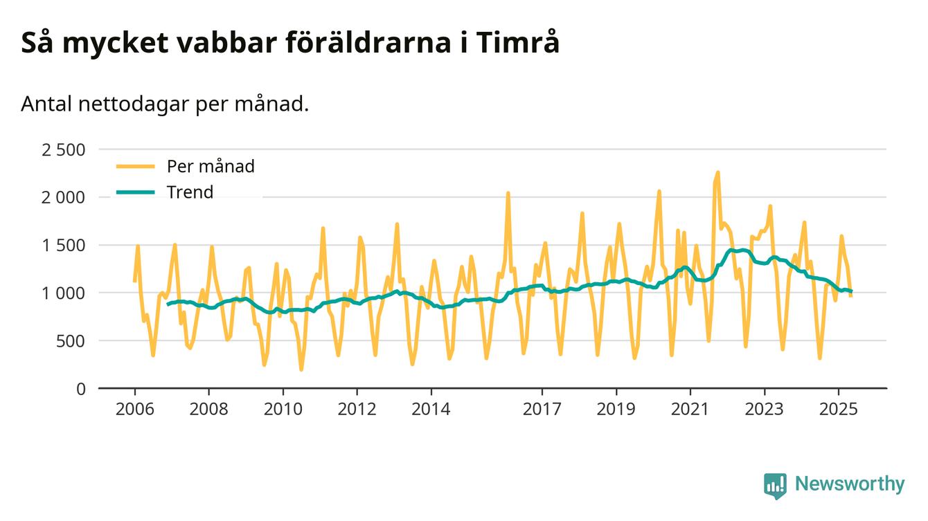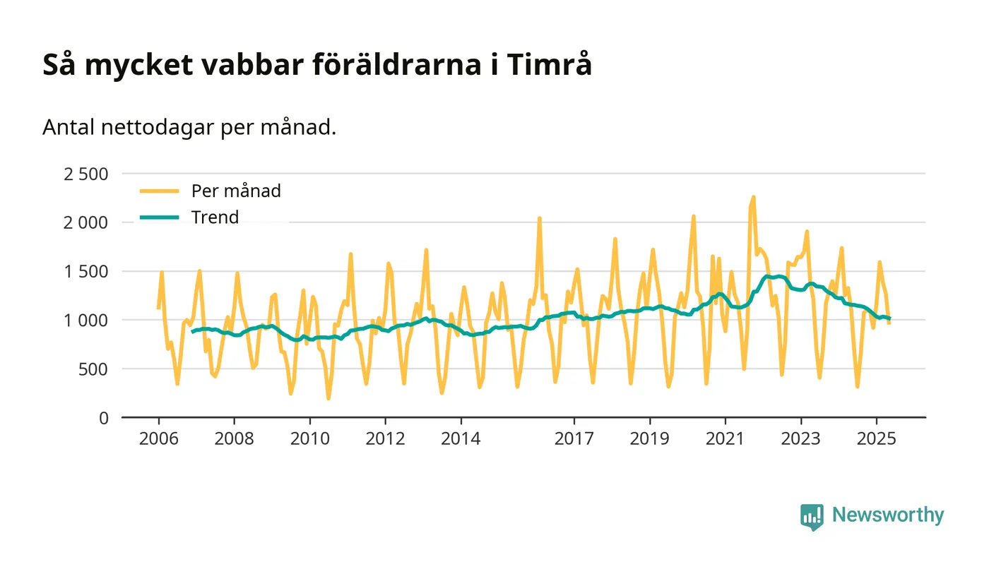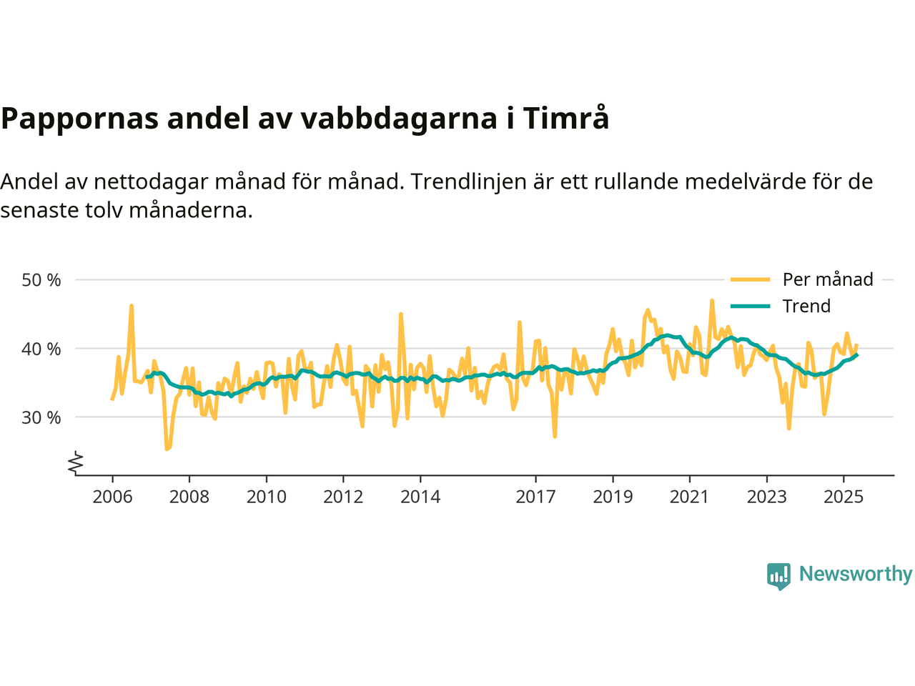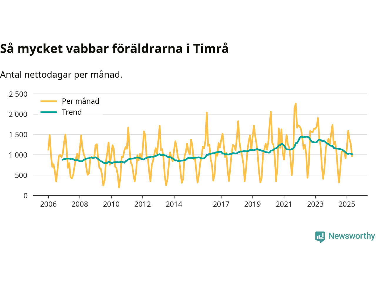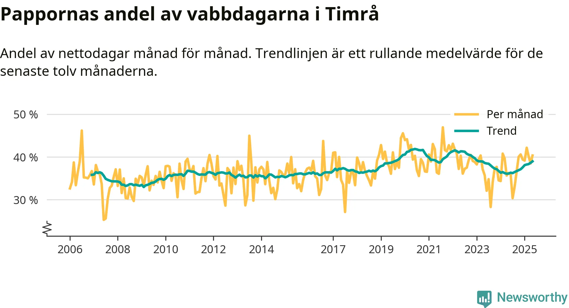 Timrå ligger en bit från ett jämställt uttag. Under de senaste tolv månaderna har männen stått för 39 procent av all vabb i kommunen. Pappornas uttag peakade sommaren 2020 då kommunens fäder var uppe i 42 procent av vabbdagarna 1.