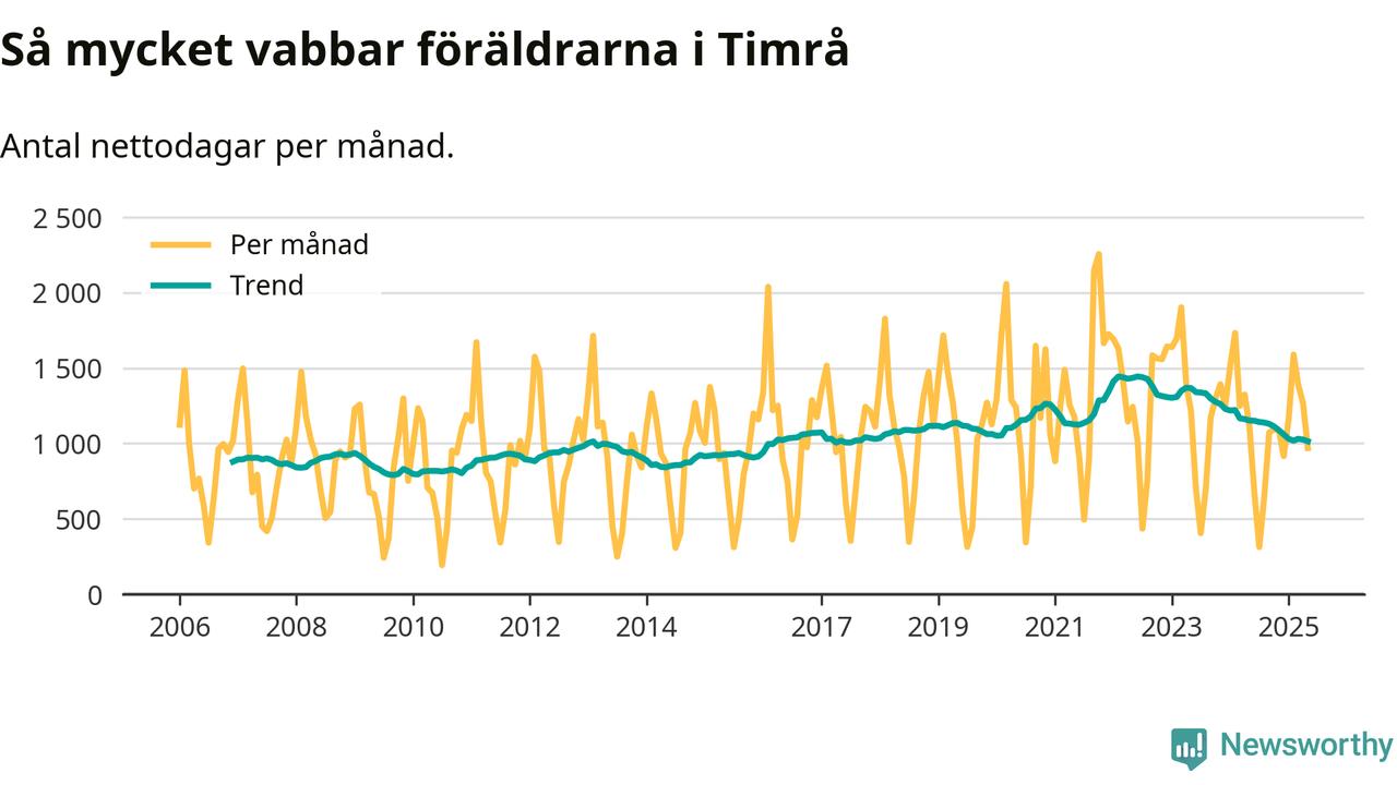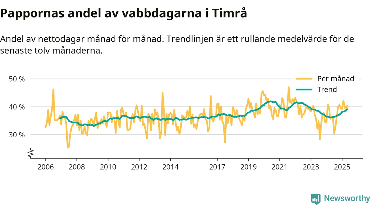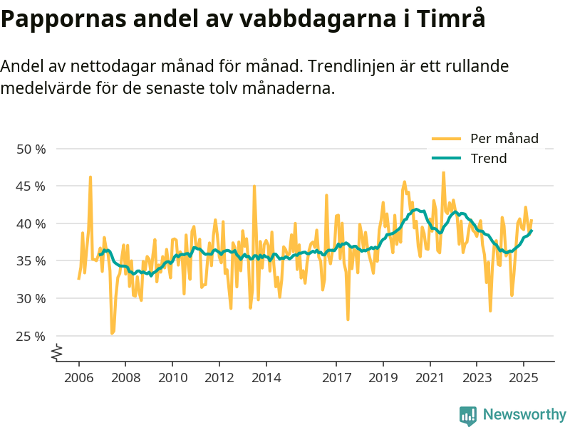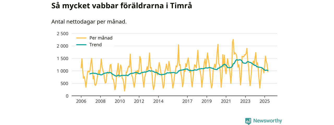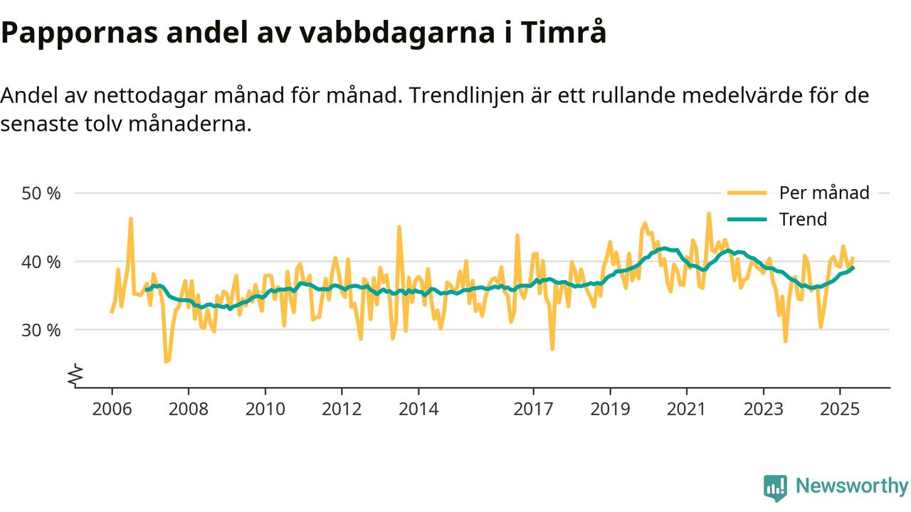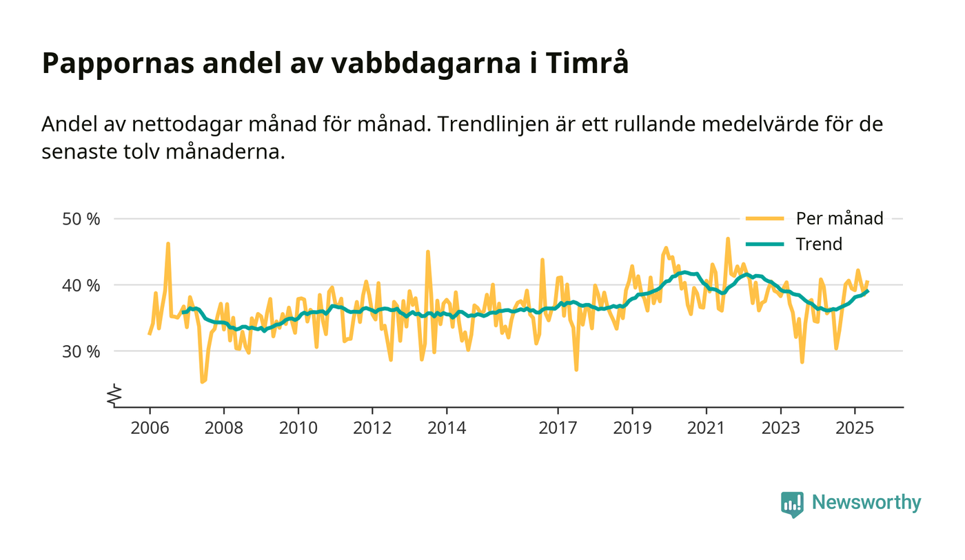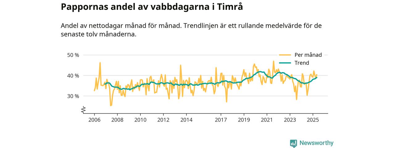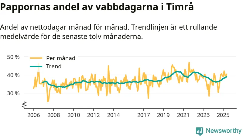 Timrå ligger en bit från ett jämställt uttag. Under de senaste tolv månaderna har männen stått för 39 procent av all vabb i kommunen. Pappornas uttag peakade sommaren 2020 då kommunens fäder var uppe i 42 procent av vabbdagarna 1.