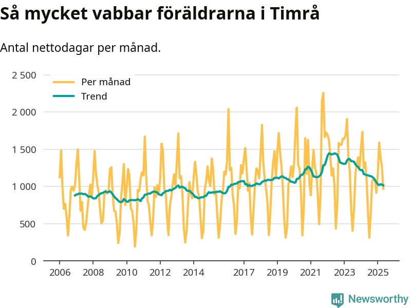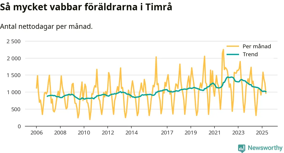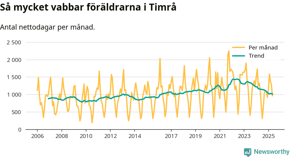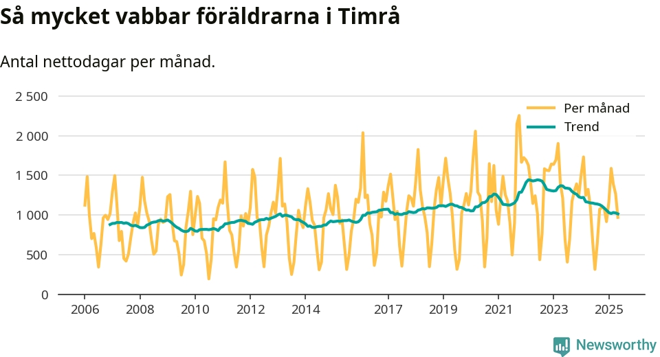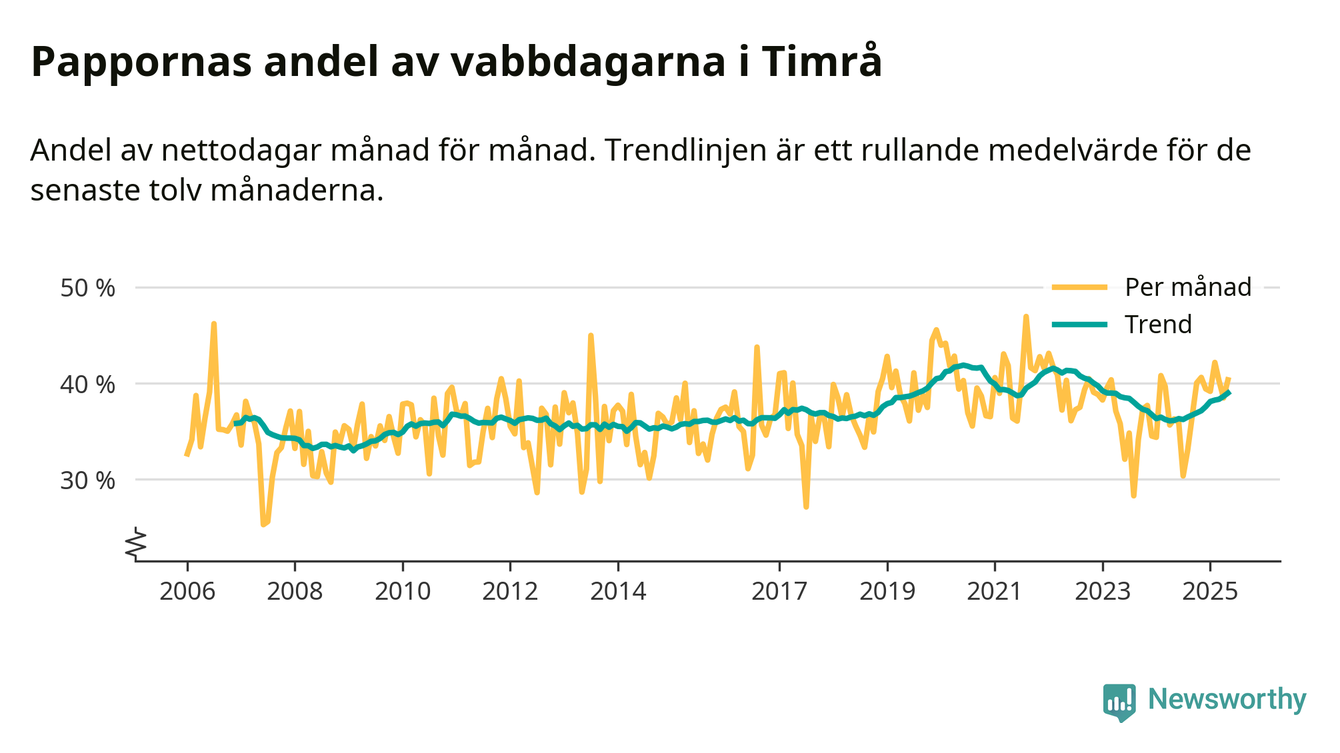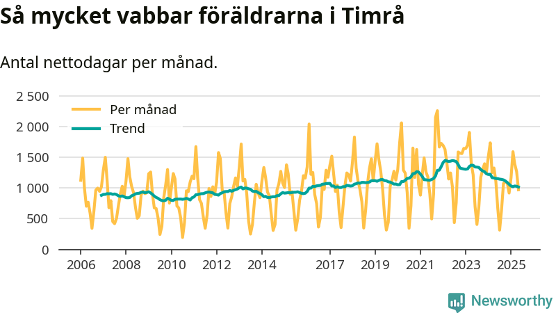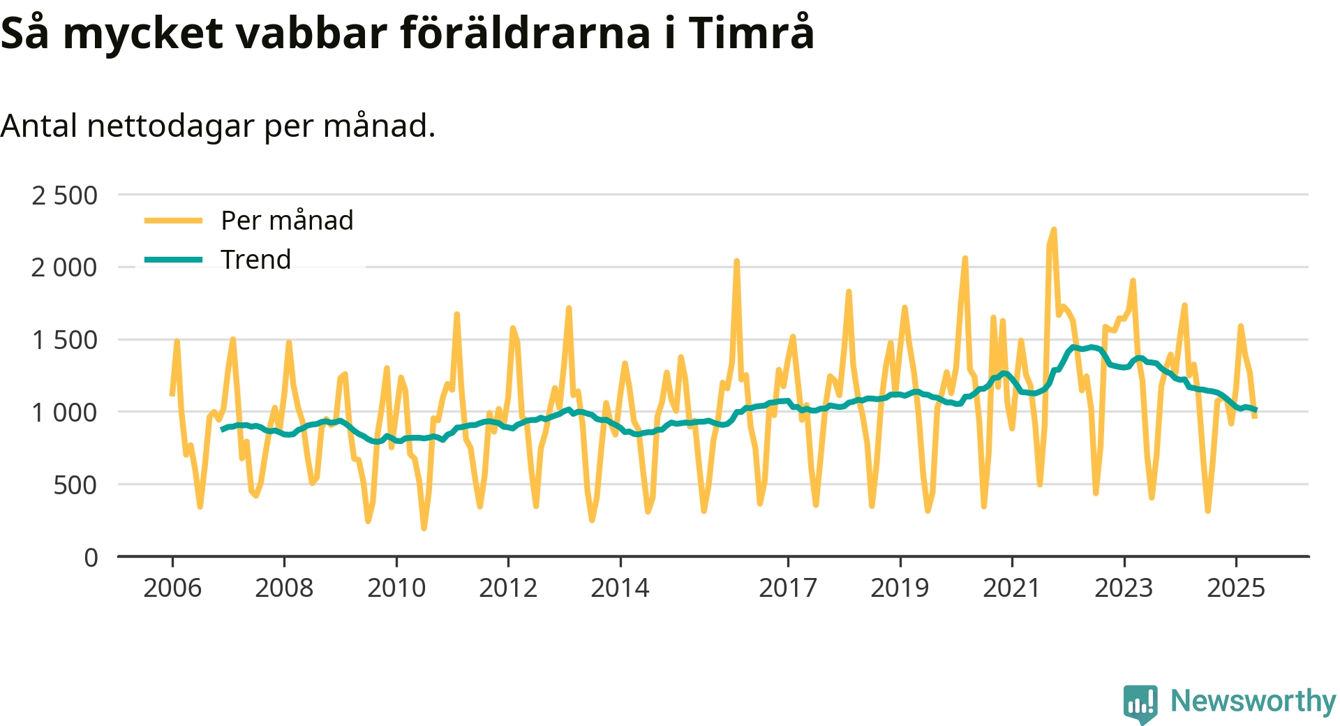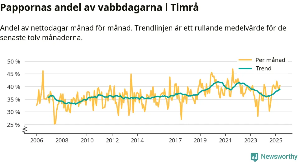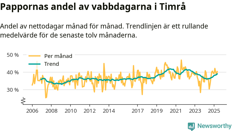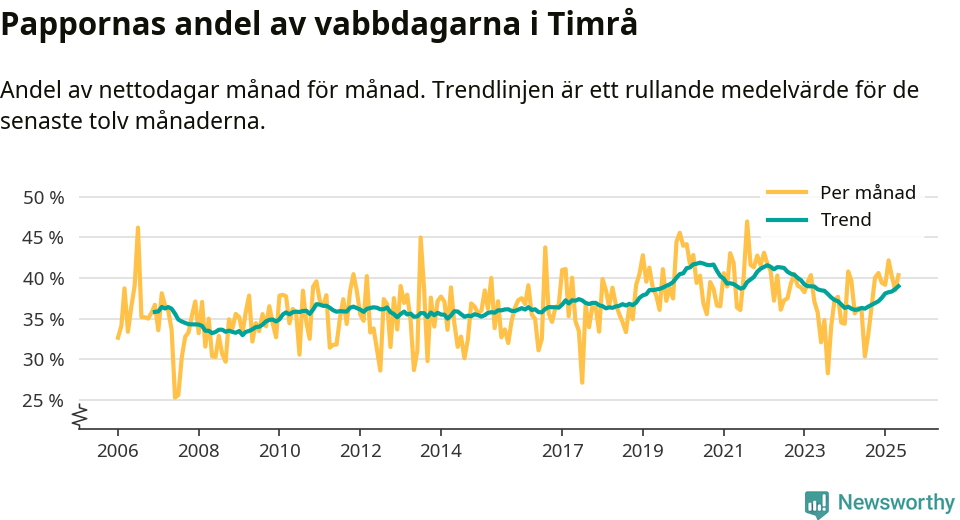 Timrå ligger en bit från ett jämställt uttag. Under de senaste tolv månaderna har männen stått för 39 procent av all vabb i kommunen. Pappornas uttag peakade sommaren 2020 då kommunens fäder var uppe i 42 procent av vabbdagarna 1.